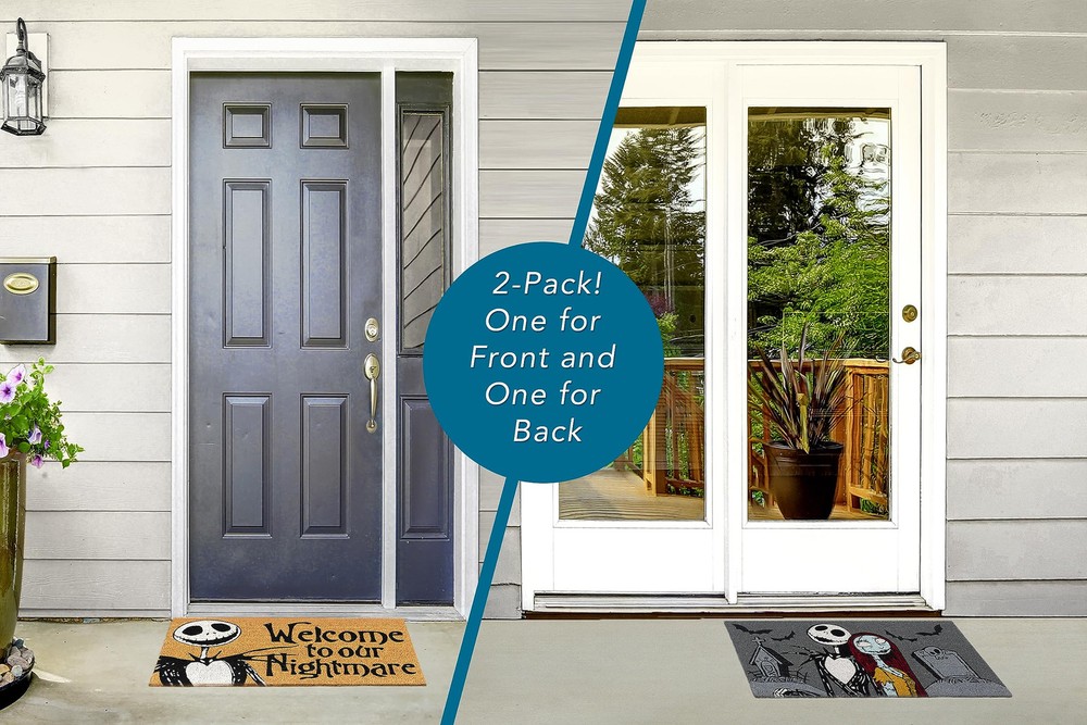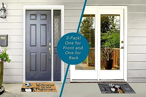 Invite Jack & Sally to greet your guests with this slip-resistant coir door mat, adding a touch of Nightmare Before Christmas to your doorstep. Ideal for fans of all ages, it's not only a practical addition but also a delightful gift option. Let your entryway be a portal to the enchanting world of Disney's Nightmare Before Christmas! COIR DOORMAT: This set includes mats designed for both the front and back doors of your home. These mats are larger in size, making them perfect for both indoor and outdoor usage. Additionally, they come with a non-slip backing for enhanced safety. PRODUCT DETAILS: Contains 2 coir mats, each 20" x 34". Pile Height 0.50”. Product may contain creases upon arrival. Please allow time for creases to flatten and settle. EASY TO CLEAN: Clean by shaking, brushing or vacuuming. If mat becomes very wet or saturated with water, lift the mat to dry thoroughly. OFFICIAL LICENSED PARTNER/MANUFACTURER: We are a leading partner with global children's brands such as Disney, Nickelodeon, Marvel, Smithsonian, and more for making and distributing authentic area and accent rugs that are perfect for kid’s bedrooms, playrooms, day care & classrooms. FAMILY OWNED BUSINESS: G.A. & Sons has been owned by family since it was established in 1896, and it is now directed by the great grandson of the founder. is a leading manufacturer of area and accent rugs.