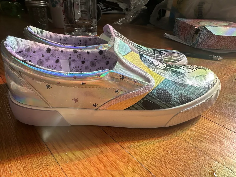 Step into a world where we celebrate Halloween on Christmas with these Nightmare Before Christmas Jack and Sally shoes. A delightful addition to any fan's wardrobe, these slip-ons feature a cute black and white pinstripe pattern accented with the iconic Jack and Sally duo. The synthetic upper materials are glossy and easy to clean, complemented by a comfortable foam insole and a durable rubber outsole for steady traction, perfect for any season. Designed for versatility, these shoes have a rounded toe shape and a flat heel style, making them ideal for a range of occasions from activewear to casual workdays. The canvas fabric ensures breathability, while the low top elastic slip on style offers an easy fit. Show off your Danny Elfman and Tim Burton love :)