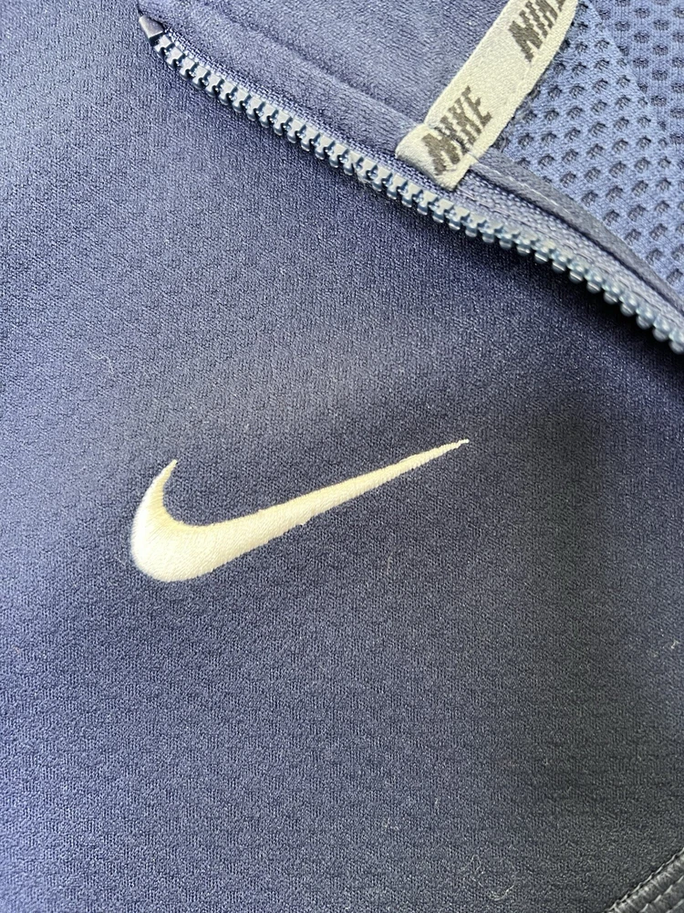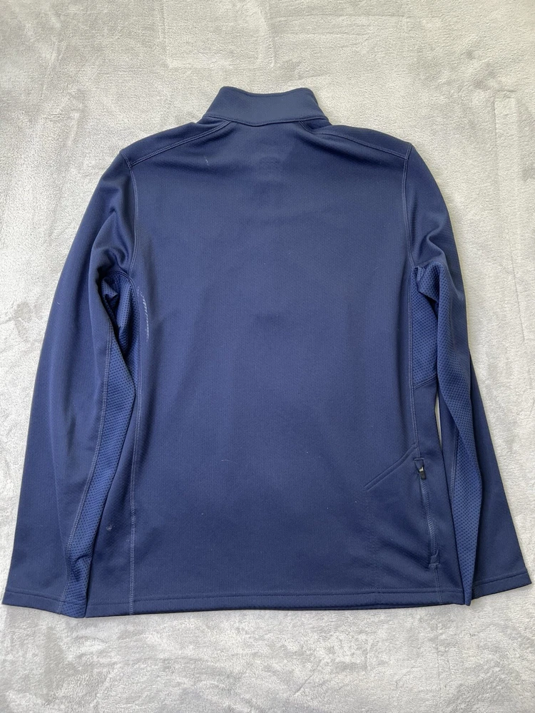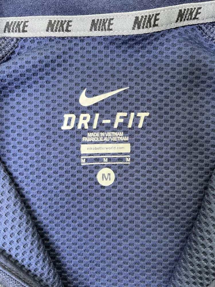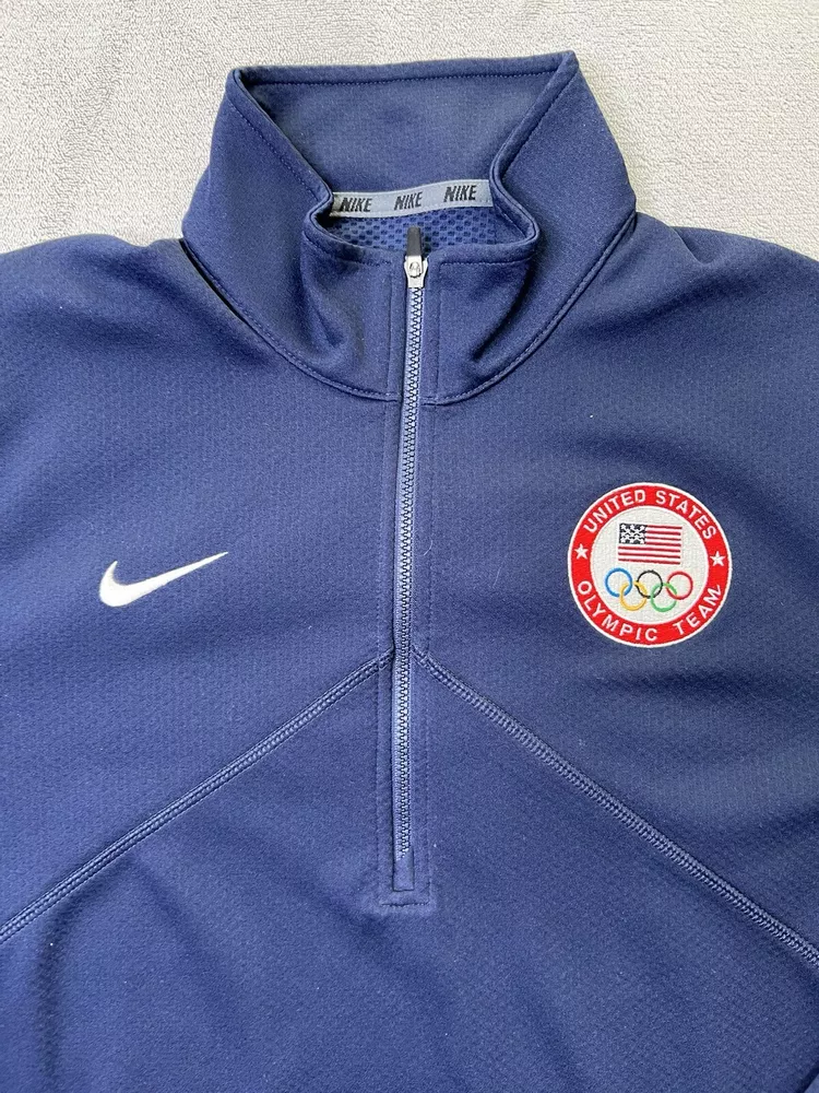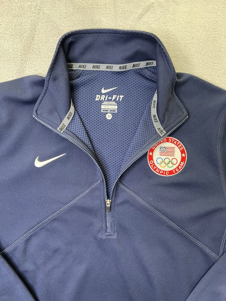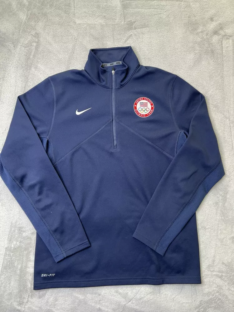 This Nike ACG Dri-Fit ADV pullover is a men's medium size with a half-zip closure and mock neck design. Featuring a USA Olympic Team graphic print and embroidered accents, this pullover is suitable for activewear during fall, winter, and spring seasons. The blue pullover is made of a blended fabric of polyester and wool, with thumb hole sleeves for added functionality. Perfect for activities like cycling, golf, cross-training, and running, this Nike Dri-FIT pullover embodies a patriotic USA theme with its design.