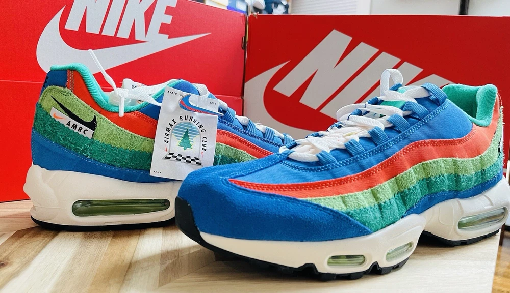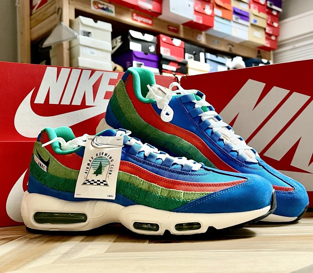 Nike Air Max 95 SE "Running Club" CPFM in size 12 features a multicolor design with Photo Blue and Roma Green accents. This limited edition sneaker, part of the Nike Air Max line, showcases a low-top silhouette with suede upper material, lace-up closure, and rubber outsole. The design is influenced by various themes such as USA, celebrity, college, and classic, making it a standout choice for those seeking comfort and performance in their athletic shoes.