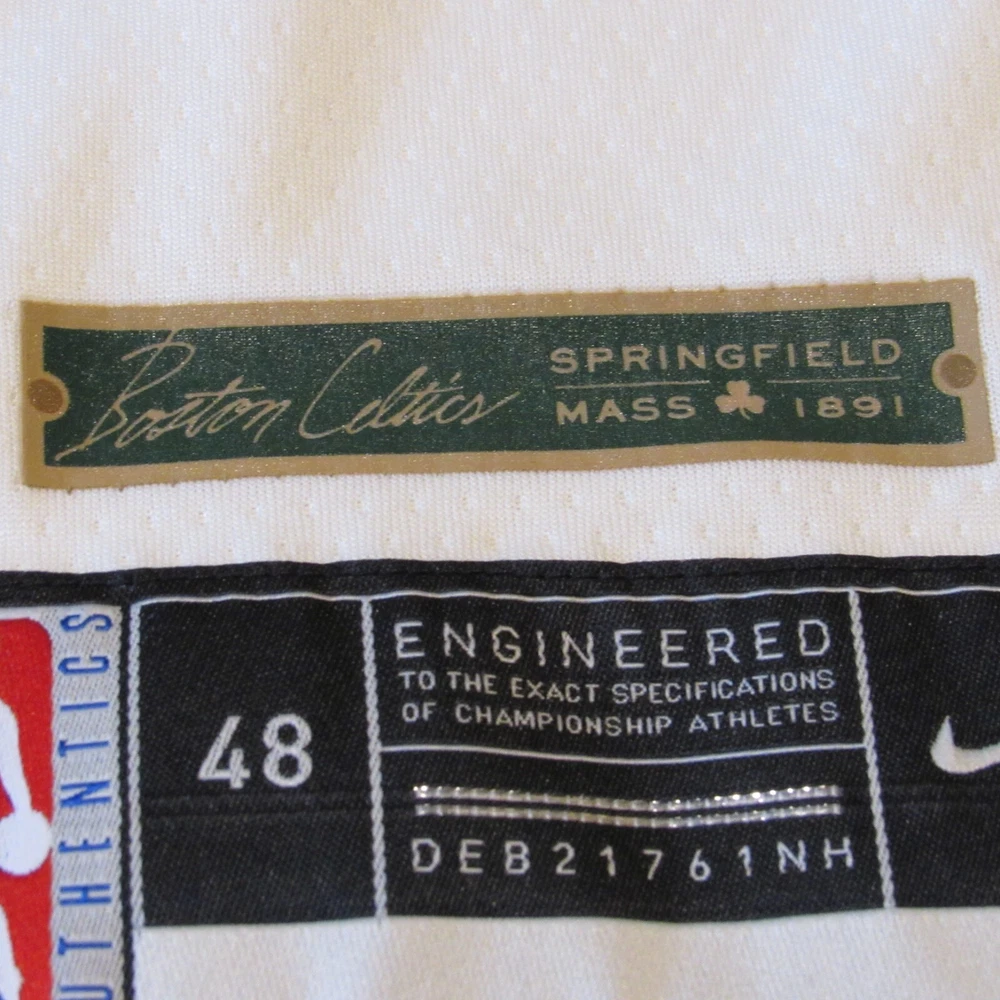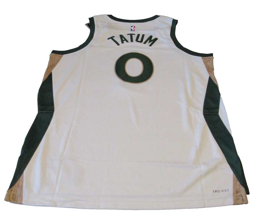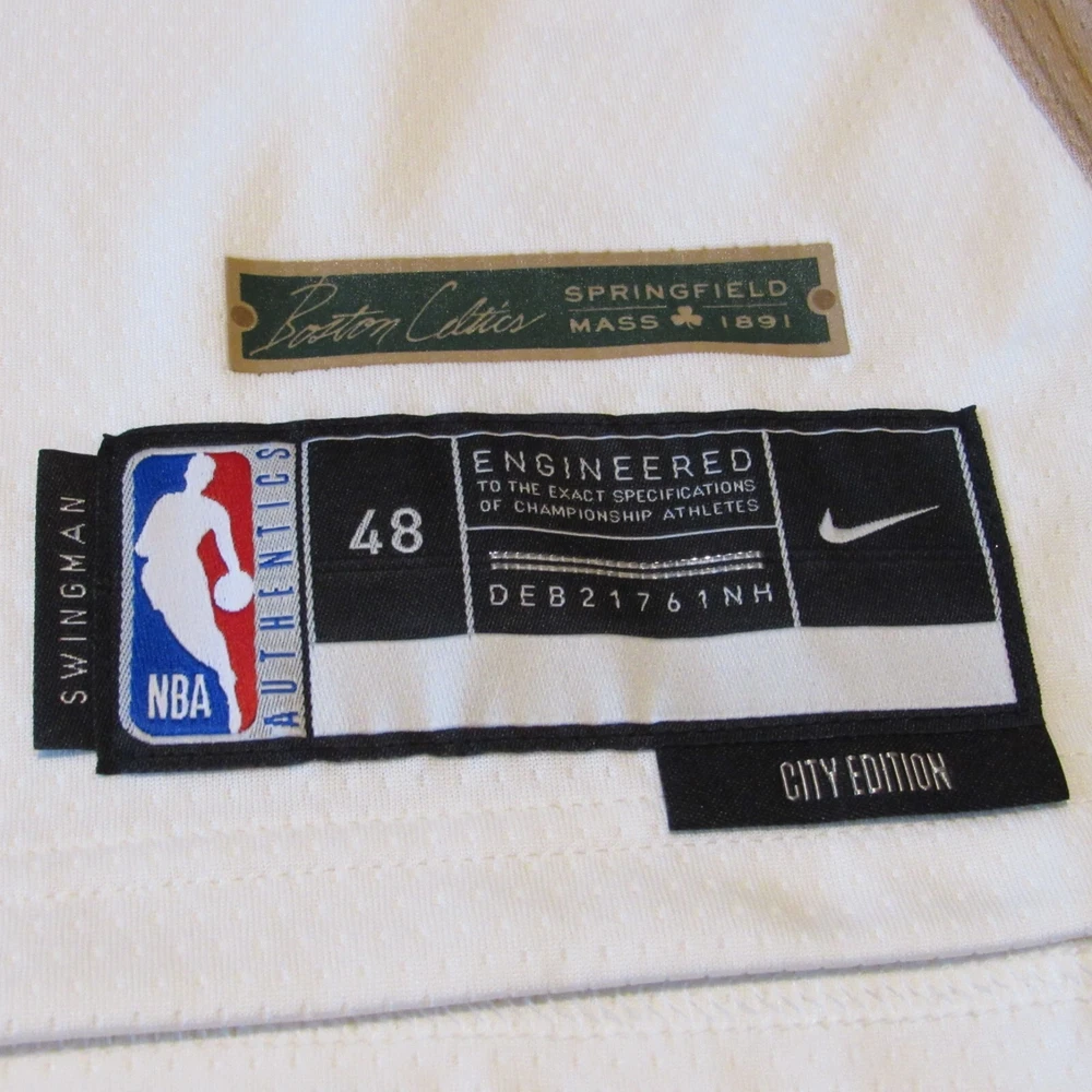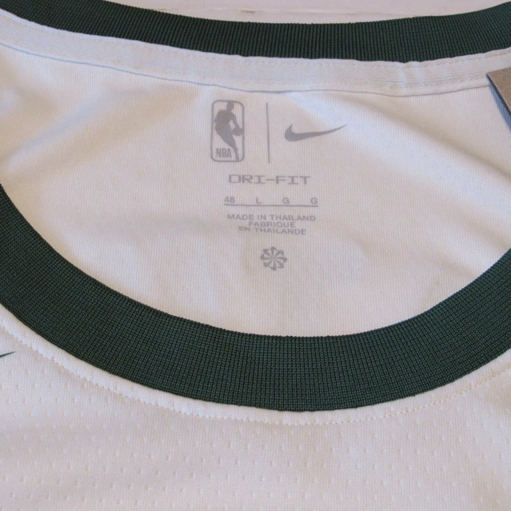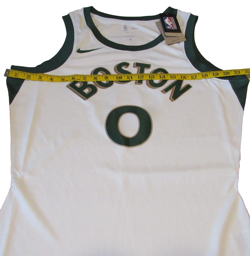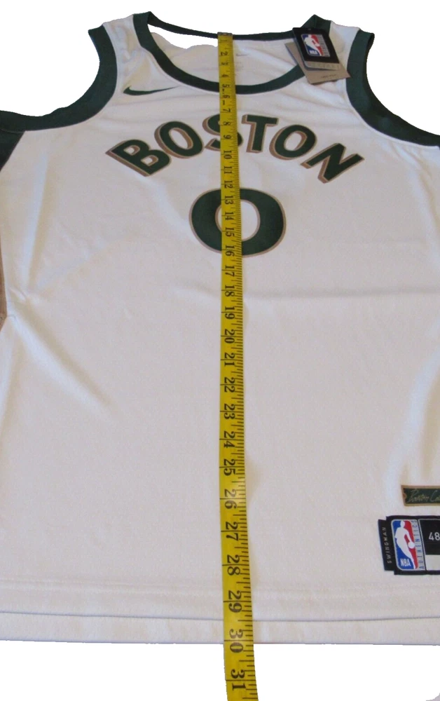 Show your support for the Boston Celtics with this Jaylen Brown City Edition Swingman Jersey. Made by Nike, this jersey is officially licensed by the National Basketball Association (NBA). It features an off-white color with the team's logo on the front and Jaylen Brown's name and number on the back. This size XXL jersey is perfect for any fan looking to represent their favorite team during regular season games. It is made for men and has been manufactured in Thailand. Get ready to cheer on the Boston Celtics in style with this high-quality jersey.
