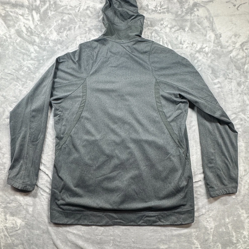 The Nike Basketball Dri Fit Hoodie in Charcoal Gray is designed for men in size 2XL with a loose fit for added comfort during physical activities. This activewear top features long sleeves and a hood for extra coverage, making it suitable for basketball and other active pursuits. The zip closure adds convenience, while the Dri Fit technology helps to keep you dry and comfortable during intense workouts. Perfect for big and tall individuals looking for a reliable and stylish option in activewear.