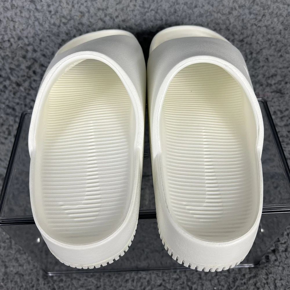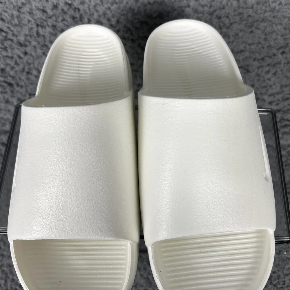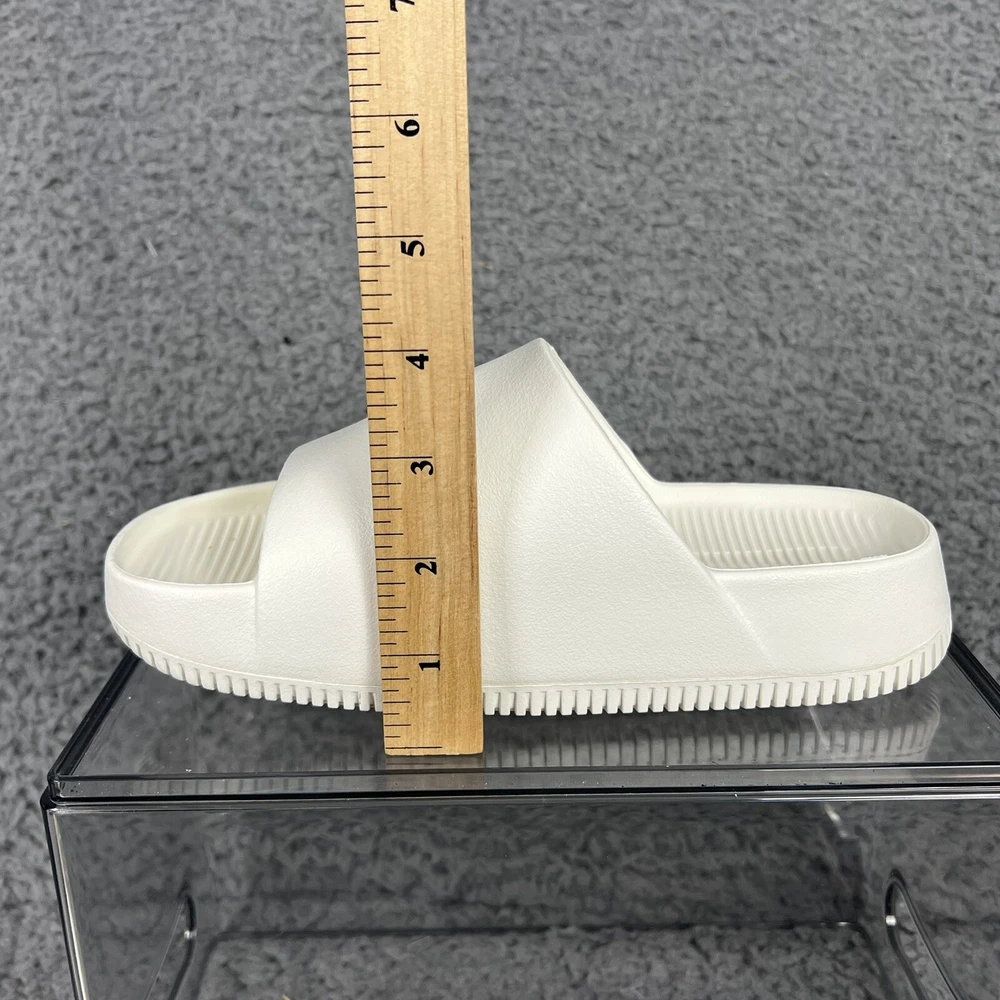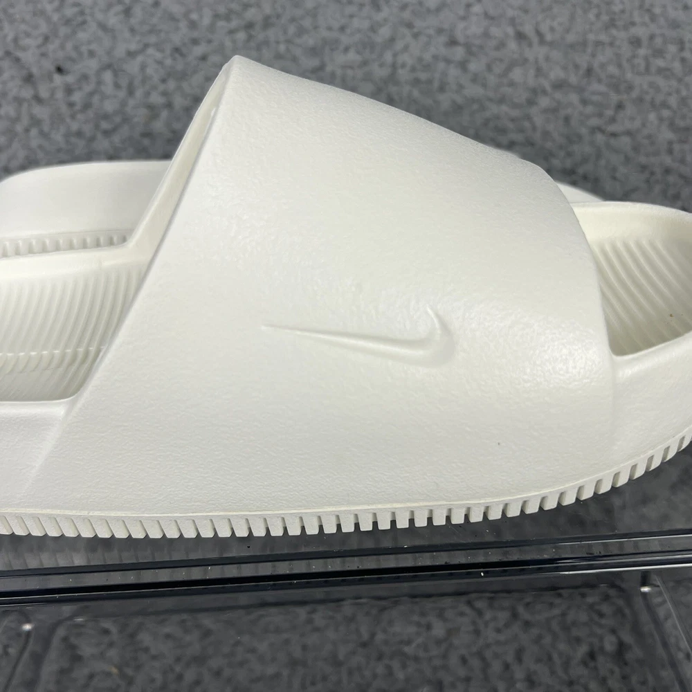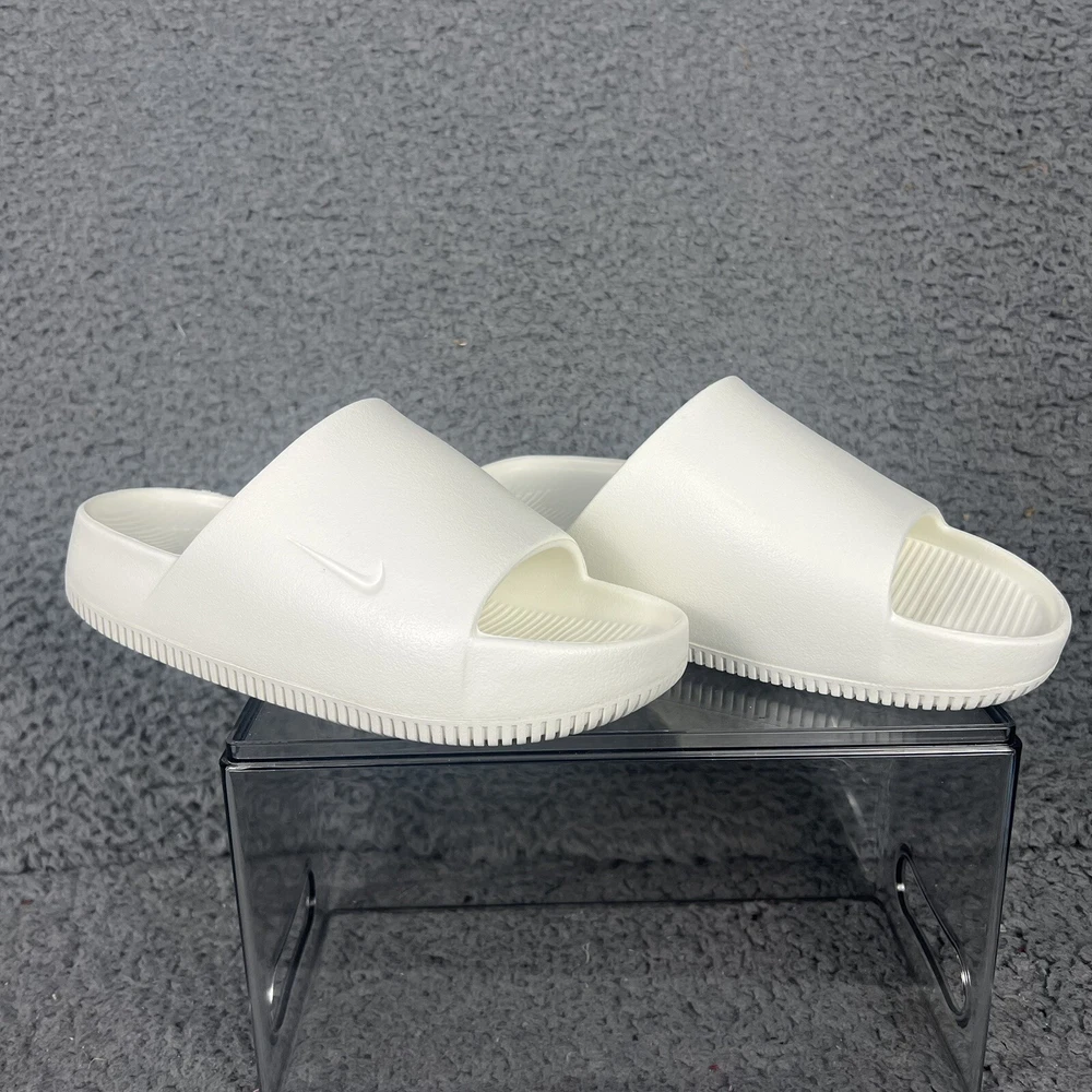 Elevate your casual style with these white Nike Calm Slides in size 5 for women. Designed with a white solid pattern and the Nike logo as an accent, these slide-on sandals are perfect for travel, activewear, and casual occasions. The low heel height and flat style make them comfortable for everyday wear, while the rubber outsole, insole, and upper materials provide durability and support. These sandals are great for sports and college-themed activities, with a cloud-like feel that will make your feet feel relaxed. The standard shoe width ensures a comfortable fit for most women's shoe sizes. Get ready to enjoy the summer, fall, and spring seasons in style with these casual Nike Calm Slides.