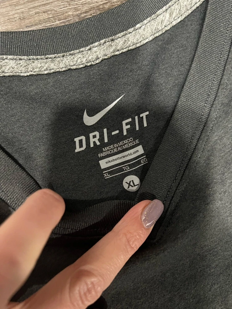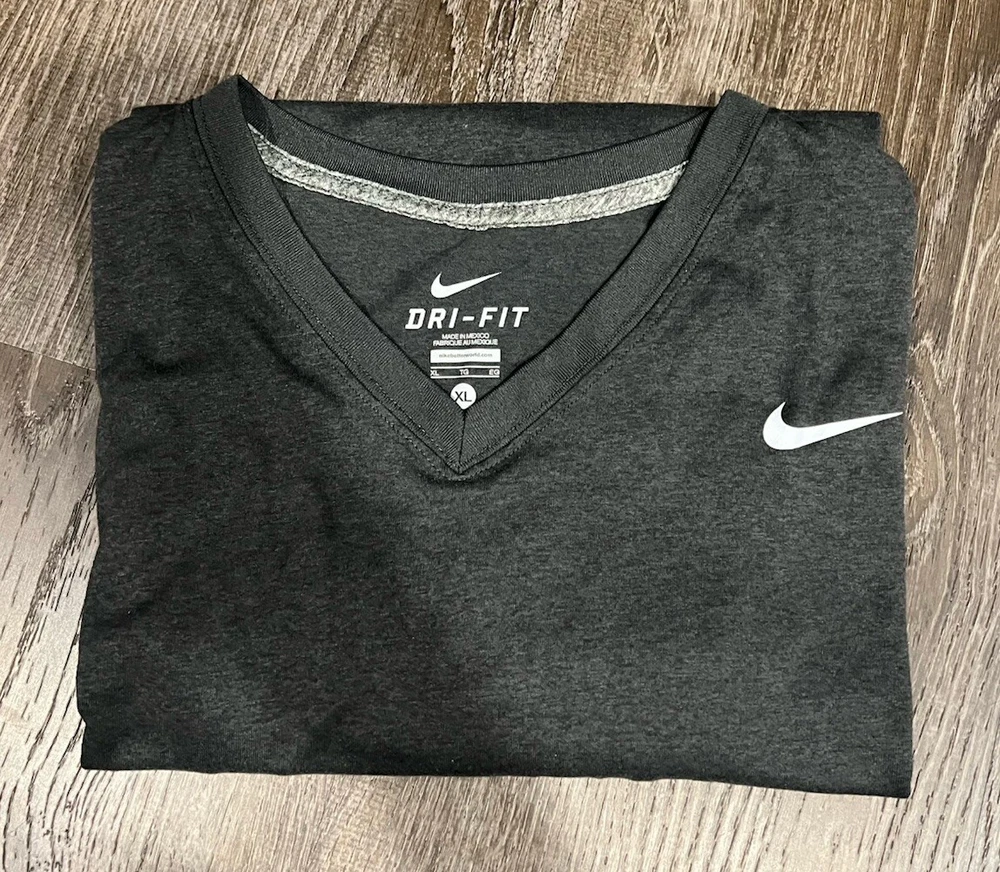 This Nike Dri-Fit Shirt for men is the perfect choice for any active occasion. With a comfortable crew neck and short sleeves, it's made from a lightweight, blended fabric that keeps you cool and dry. The dark gray color is accented with the iconic Nike logo, and the shirt is machine washable for easy care. Ideal for gym and cross training, crossfit, running and jogging, this shirt is an athletic fit that will move with you. It's made of polyester and is designed for fall, spring, and summer seasons. The pullover style and band collar add to the overall look and feel of the shirt. This Nike Dri-Fit Shirt is a must-have for any sports enthusiast.