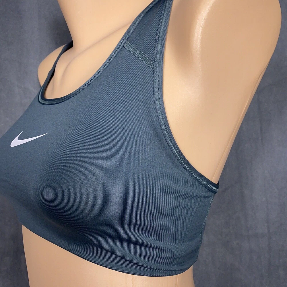 Listed is a Nike Dri-Fit sports bra, pullover, unlined, dark sage green with white Swoosh logo on front. Size XS. Preowned, some slight discoloration at underarms, otherwise good condition, please be sure to see all photos, sold as-is. Thank you for looking!