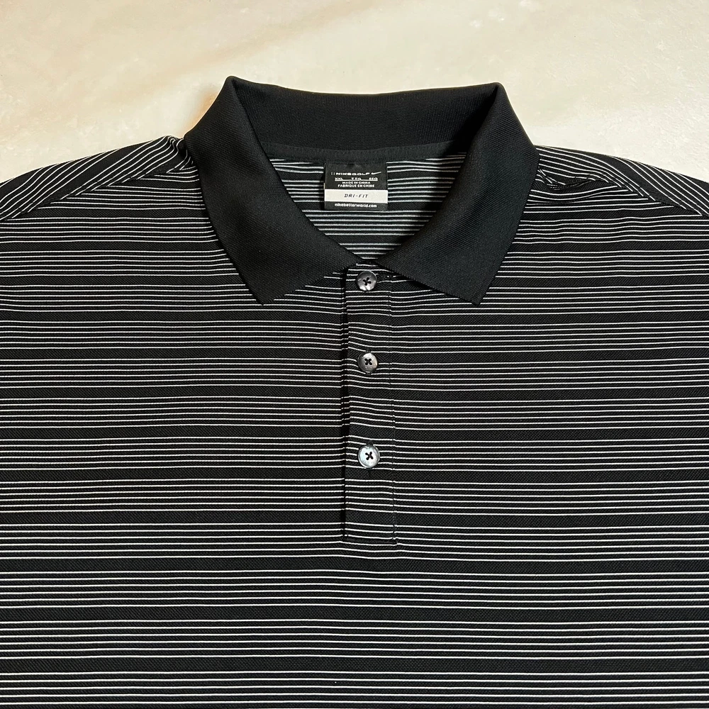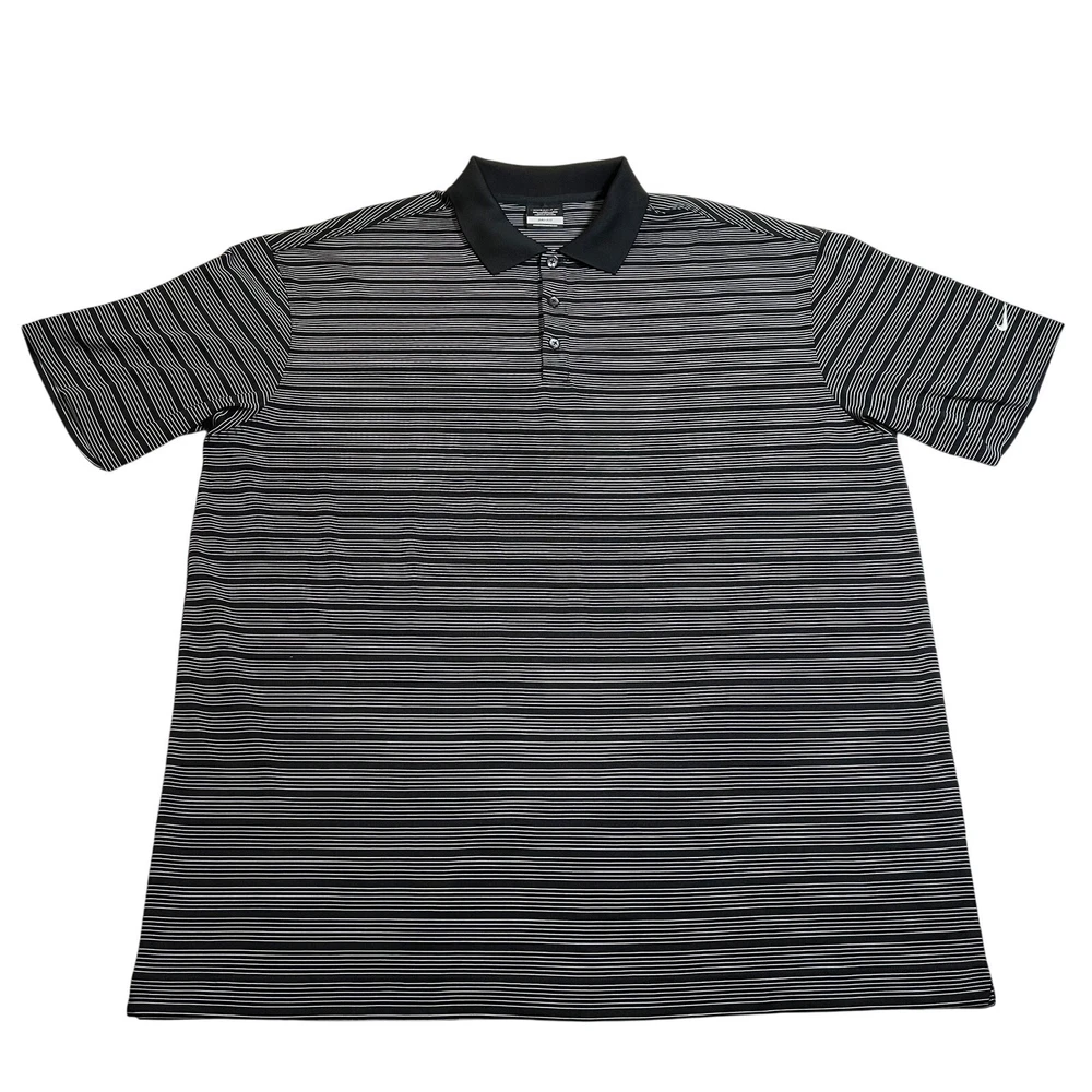 Nike Golf Dri-Fit Striped Golf Polo Shirt Size XXL Performance Stretch Sports CONDITION: Pre-Owned. Excellent Used Condition. FLAWS/ALTERATIONS: No flaws. COLOR: Black/White SIZE: Men’s Size XXL DETAILS: Pull over Short sleeve Collar Stripe Polo Quarter button down MEASUREMENTS: Chest: 26" Full Length: 33" **All measurements are approximate and are taken flat** MATERIAL: 100% Polyester Bundle 2 OR MORE items to save more! Reasonable offers are welcomed! TAGS: Casual Comfy Spring Summer Travel Vacation Golf Sports Athletic Athleisure Active Activewear Performance Classic Staple Effortless