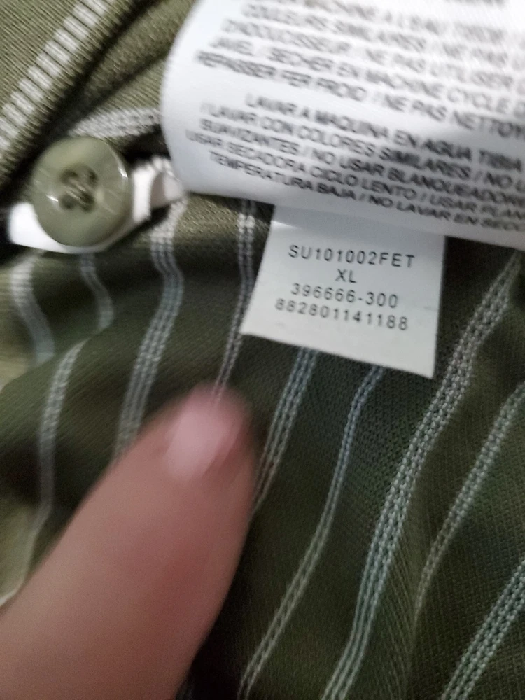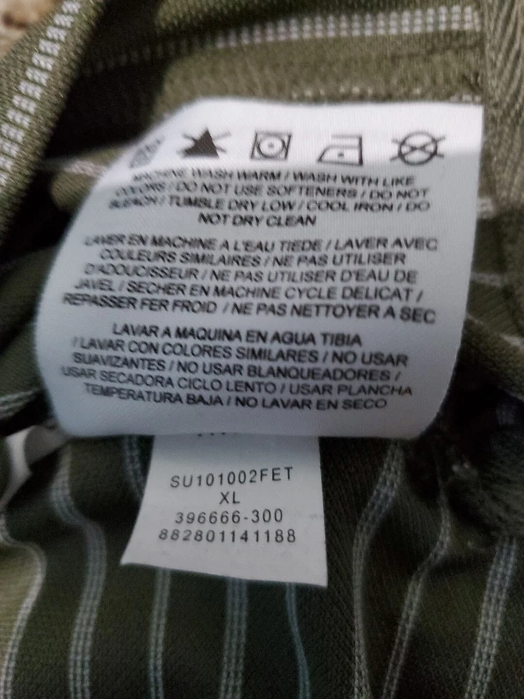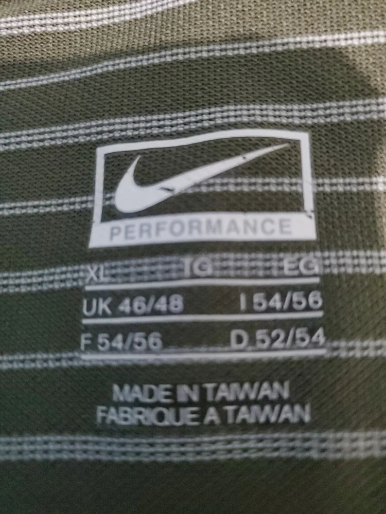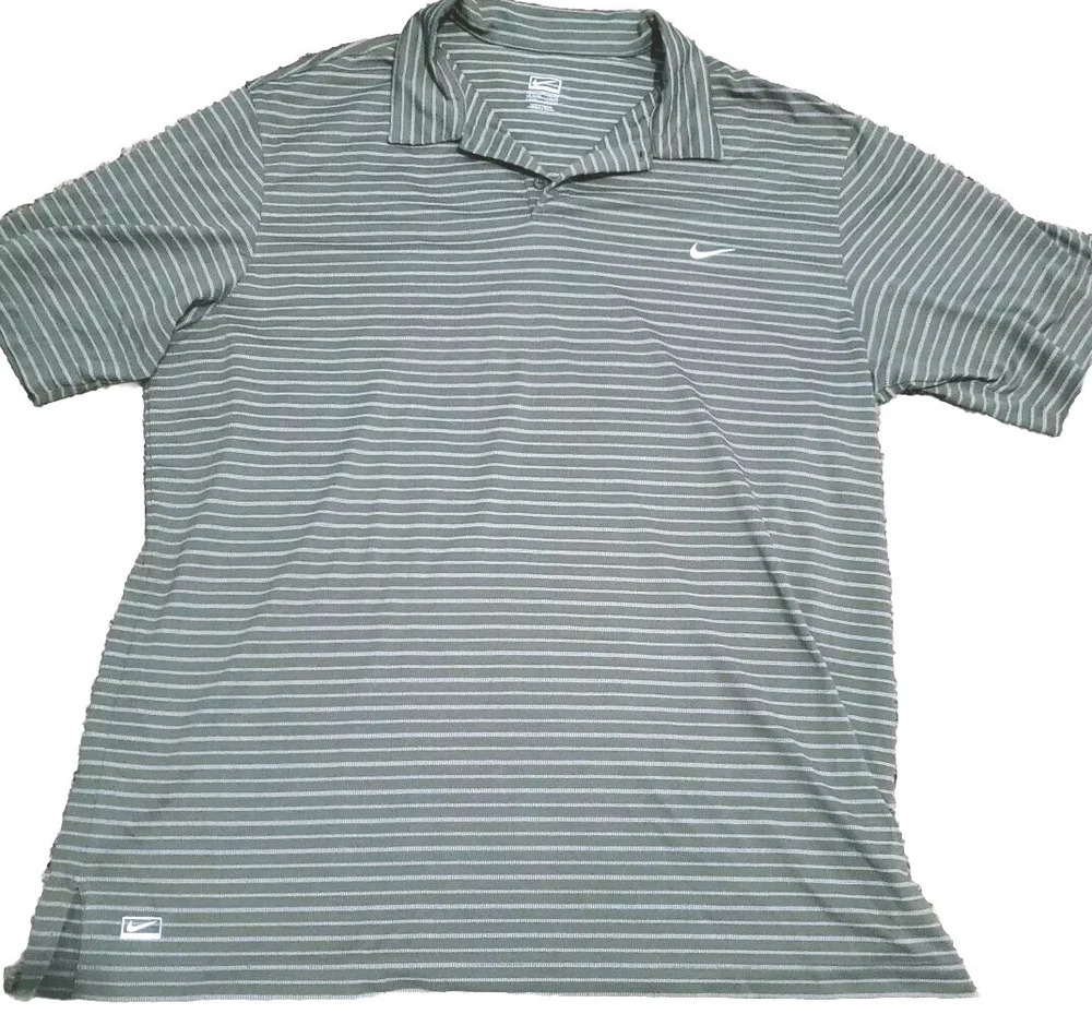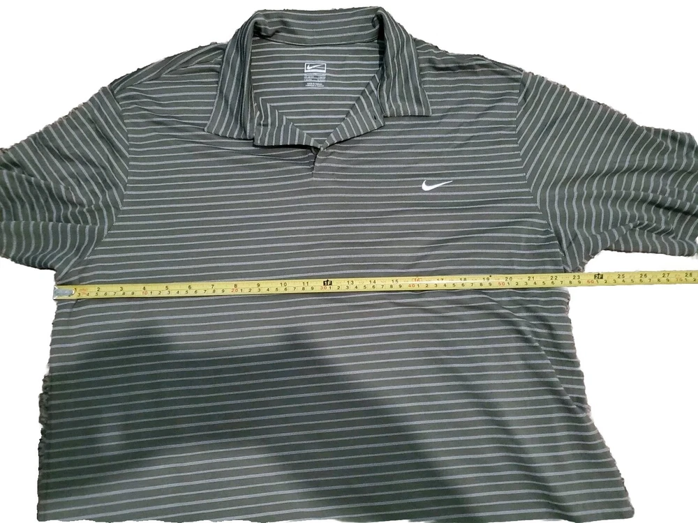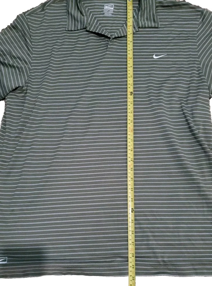 This Nike Golf men's polo shirt in size XL is perfect for any casual or business occasion. The shirt features a collared neckline and a button closure. It is made from a blended fabric and has a green striped pattern. The shirt is easy care, preshrunk, stretchy, quick-drying, moisture-wicking, and breathable, making it suitable for any season. It is a Nike Tour Performance model, with the Nike logo and button accents. This shirt is machine washable, and its chest size is as seen in the picture. It is ideal for outdoor sports such as tennis, walking, and golf.
