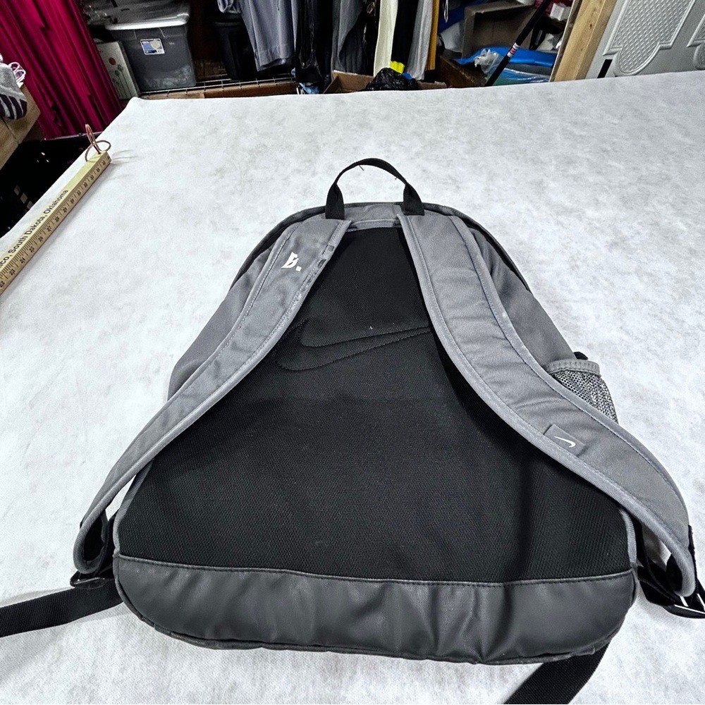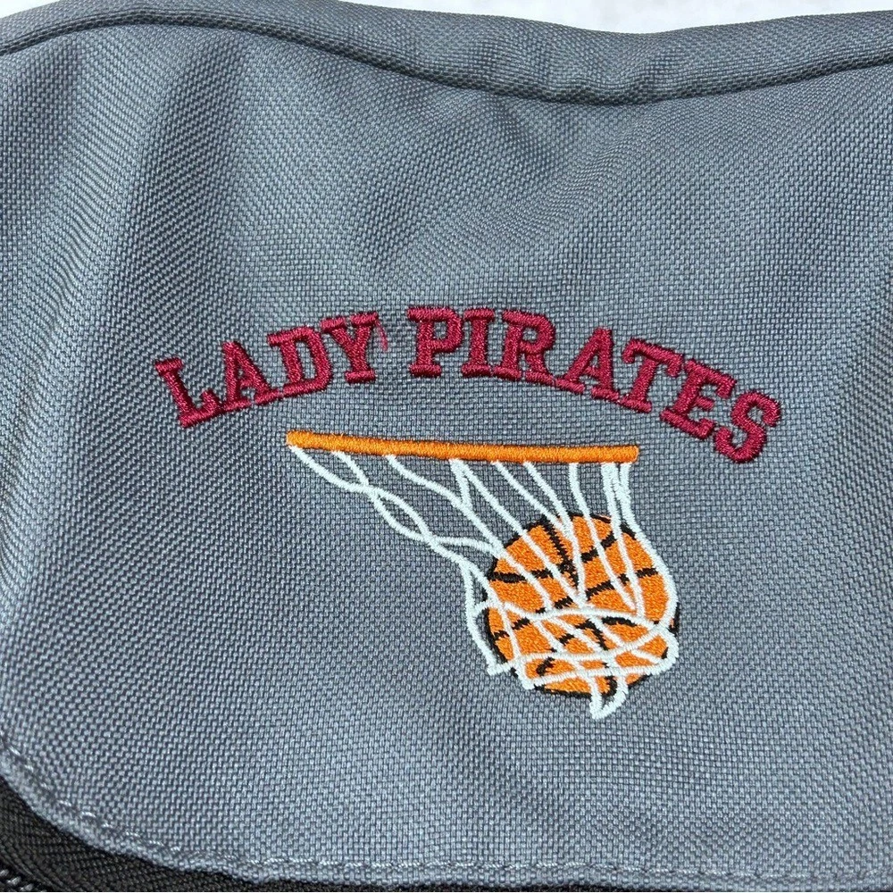 Experience the perfect combination of style and practicality with the Nike backpack, featuring a sleek gray and black color scheme. This backpack is designed with a classic rounded silhouette and the iconic Nike swoosh, making it a versatile choice for everyday use. Crafted from durable materials, it ensures longevity and comfort with its adjustable black shoulder straps. Embroidered Lady Pirates Basketball icon NOTE LAST PIC SHOWS LETTER B someone tried to remove M9 15