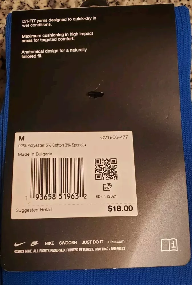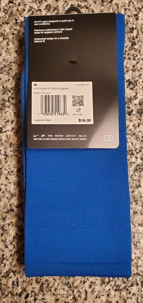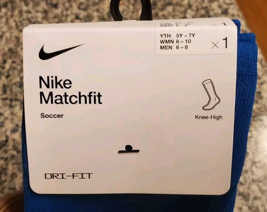 The Nike Matchfit Adult Blue Knee High Polyester Cushion Logo Soccer Socks are designed for men and feature Dri-Fit technology, arch support, cushioning, moisture-wicking, and breathability, making them ideal for soccer, running, and gym training. This pair of royal blue socks in size medium (6-8) is machine washable and made of a polyester blend material for comfort and durability. With the Nike logo on the socks, they offer performance and style for various seasons throughout the year. Pictures are of actual socks. Brand new never worn and no defects. Feel free to contact me with any questions .