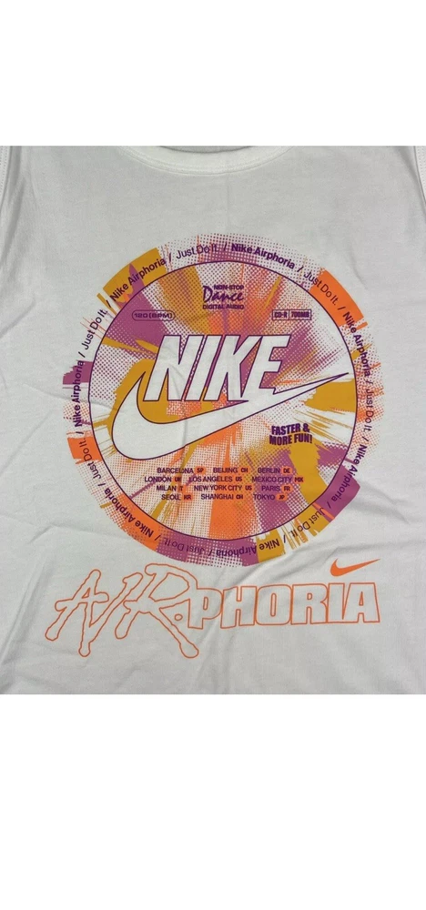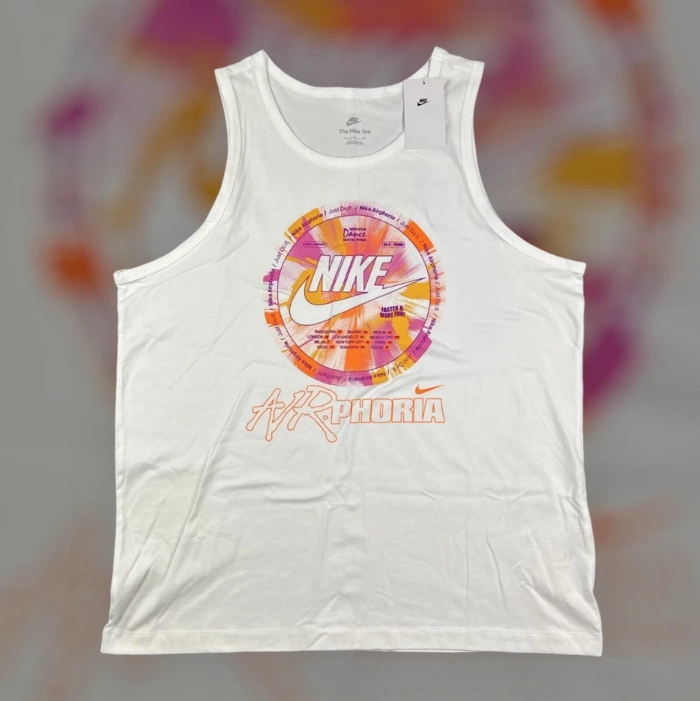 The Nike Men's Sportswear Air-Phoria Tank Top in size XL features a design with a white, pink, and orange color combination, showcasing the Nike Air product line. This tank top is made for men's activewear and is branded by Nike, making it a stylish and functional addition to any workout wardrobe. The item is new with tags, offering a fresh and trendy option for those seeking a comfortable and eye-catching tank top for their athletic pursuits.
