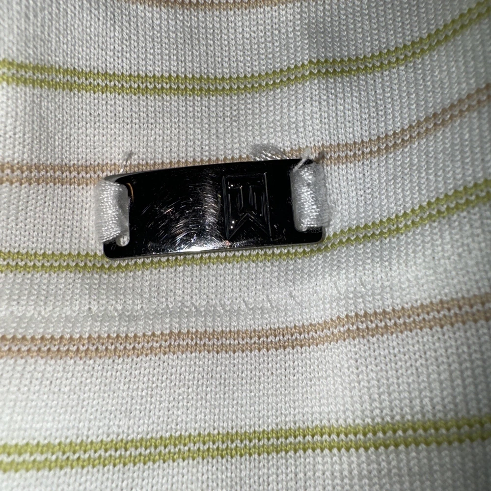 Elevate your golf game with this Nike Mens Tiger Woods Collection Striped Pale Yellow Dri-Fit Golf Polo in size XXL. Designed for comfort and performance, this polo features a collared neckline with a button-down closure, short sleeves, and a knit fabric type. The striped pattern and Tiger Woods logo accents add a touch of style to your golf course attire. Ideal for all seasons, this Nike Dri-Fit polo is perfect for various activities such as gym & training, track & field, rugby, tennis, walking, golf, baseball, basketball, fishing, football, hiking, running & jogging. Made of a blend of polyester and cotton, this regular-fit polo is suitable for men who want to look and feel their best during their favorite sports.