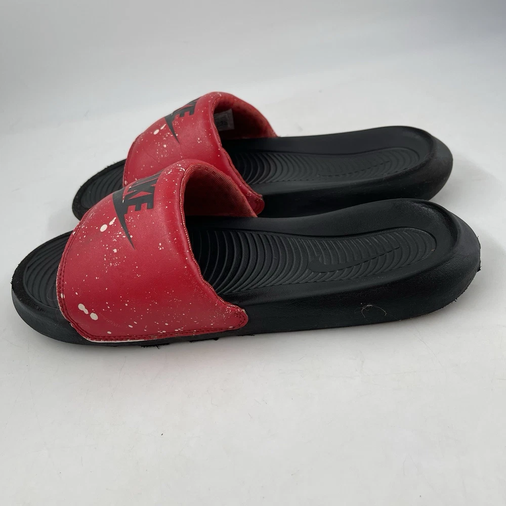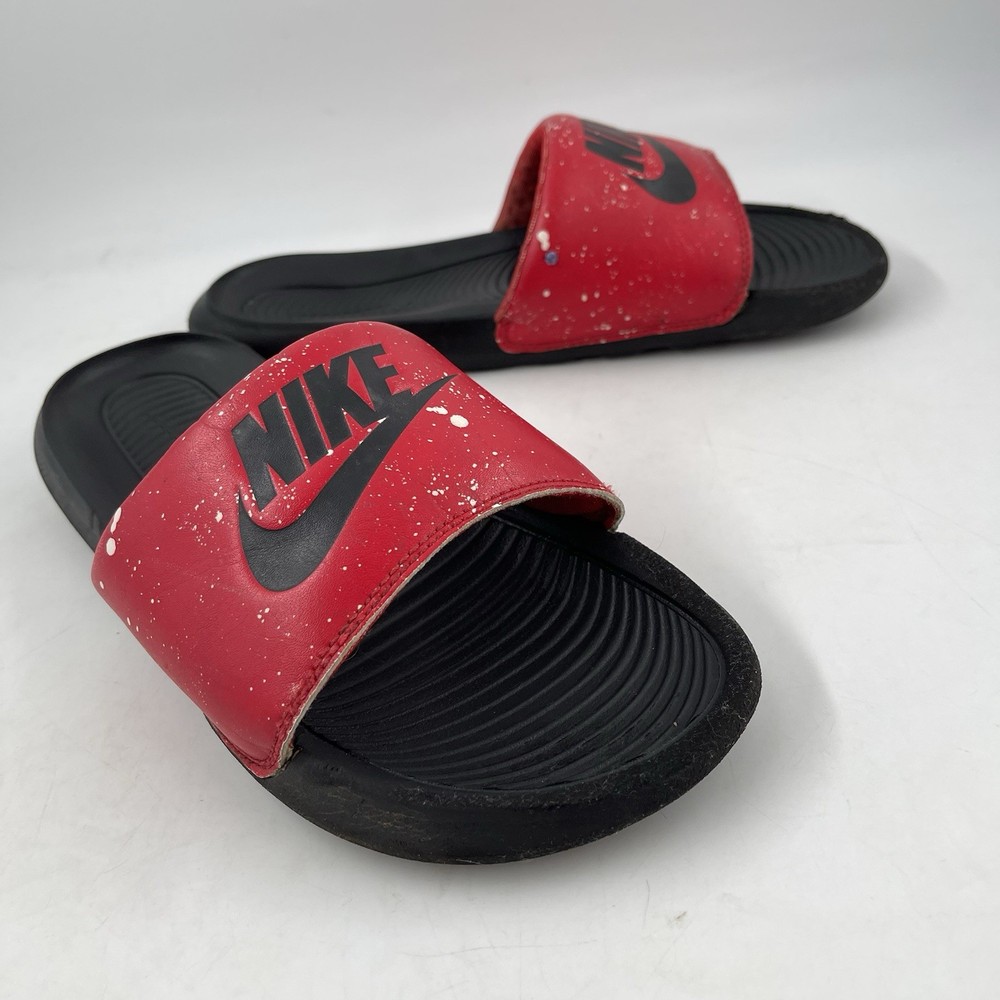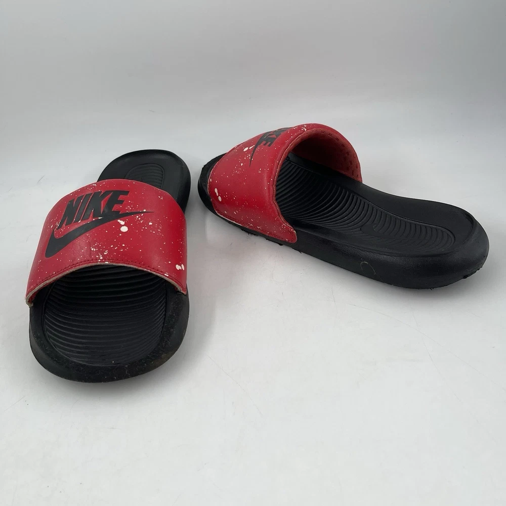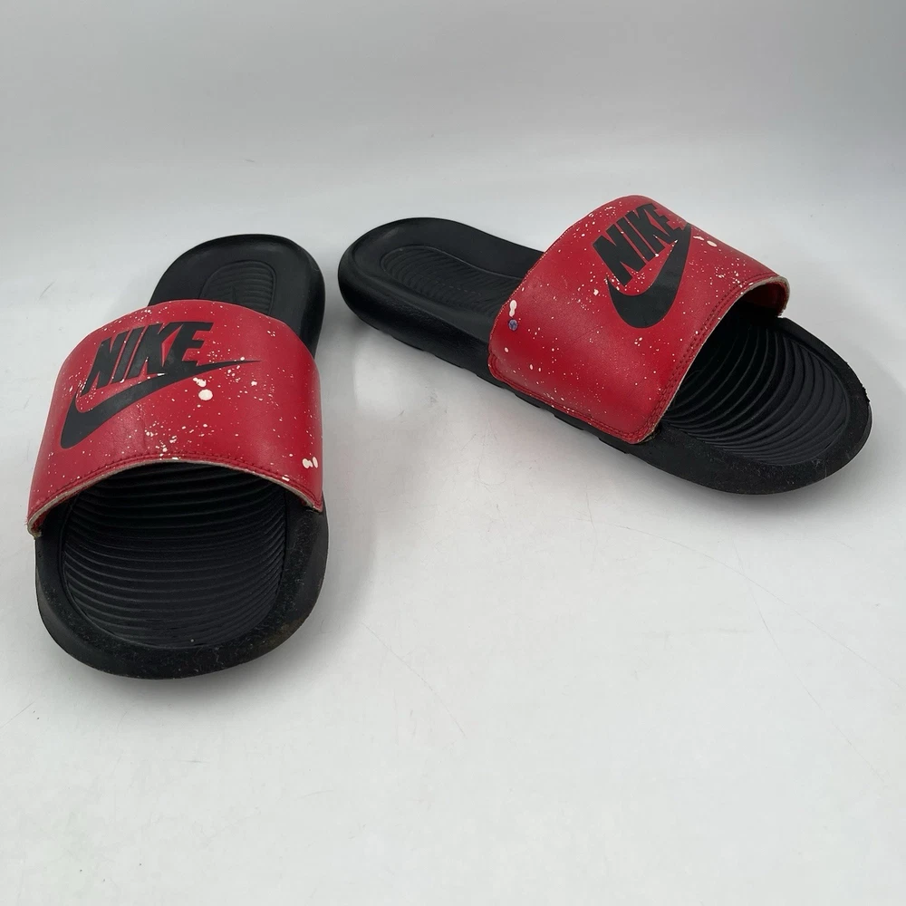 Very Good Preowned Condition Men’s Size 9 Nike Men’s Victori One - Size 9 - Red Splatter Print Slide Shoe Please see photos for details as they are part of the description Condition: Very Good. Normal signs of use. Gently worn, no stains, no holes or tears. See photos for details. Legendary Comfort, Remastered From the beach to the streets, the Nike Victori One perfects a classic, must-have design. Delivering lightweight comfort that’s easy to wear, it features new, softer foam that feels comfortable while the contoured footbed with grip pattern helps cradle and holds your foot in place. The wide, padded strap feels as good as it looks. •The new, softer foam and mechanical cushioning adds unbelievable comfort that lasts. •The contoured footbed cradles and supports your foot while its grip pattern helps keep your foot in place •the rolled top edge of the strap adds to the comfort while the thick padding feels soft •The wider strap adds additional space, accommodating more foot sizes •The tooling features a new pattern, for added traction •Bold “Nike” and SWOOSH on the straps lets you represent your brand •CN9678-006 Gently used. No original box. Carefully packaged and shipped same/next business day Please feel free to ask questions All items come from a smoke-free/pet friendly environment Please make sure to follow me. I list new inventory daily SH4441/01PE-R08