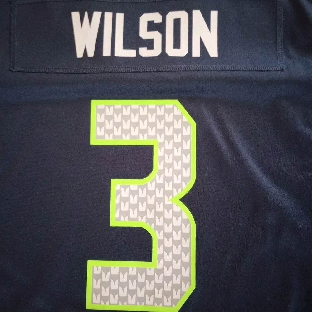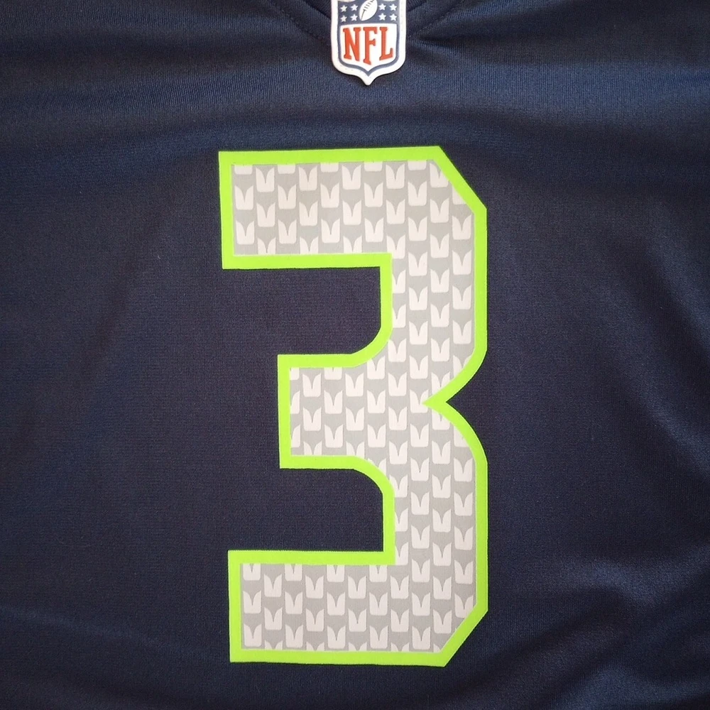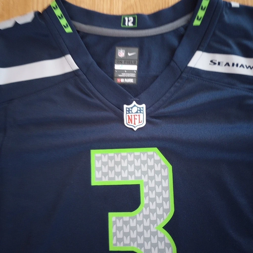 Show your support for the Seattle Seahawks with this Nike NFL jersey featuring Russell Wilson's number 3. The jersey is made for youth in size 12 and is perfect for fans of the National Football League. The Seahawk Navy color and officially licensed Nike brand make this jersey a must-have for any football enthusiast. This jersey is perfect for regular season games and is a great way to show off your team spirit. The product is made in Guatemala and is designed to last. Get ready to cheer on your favorite team with this high-quality jersey. Washed and cleaned as per eBay.