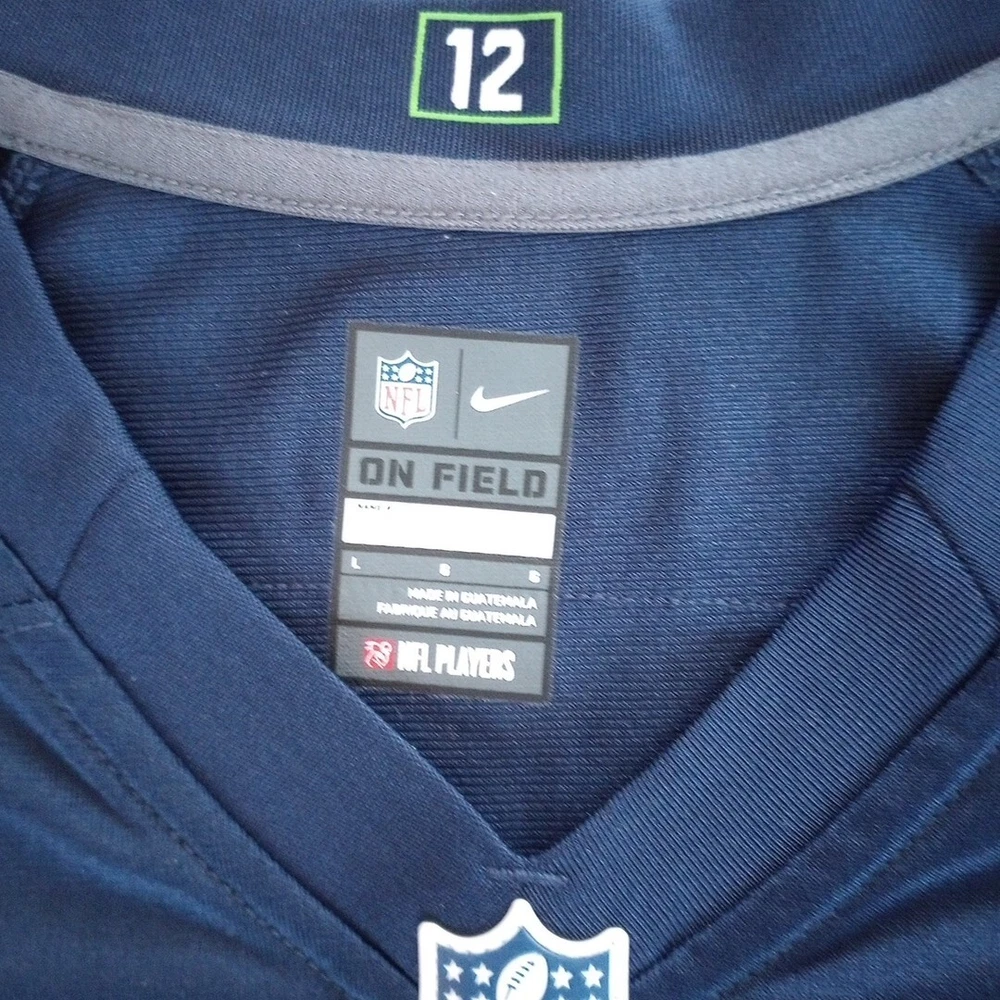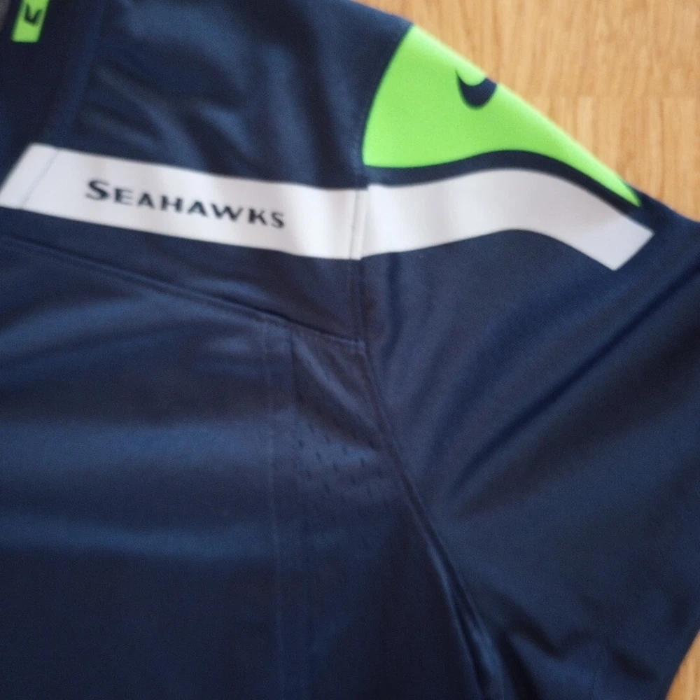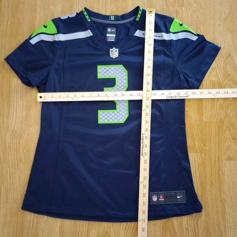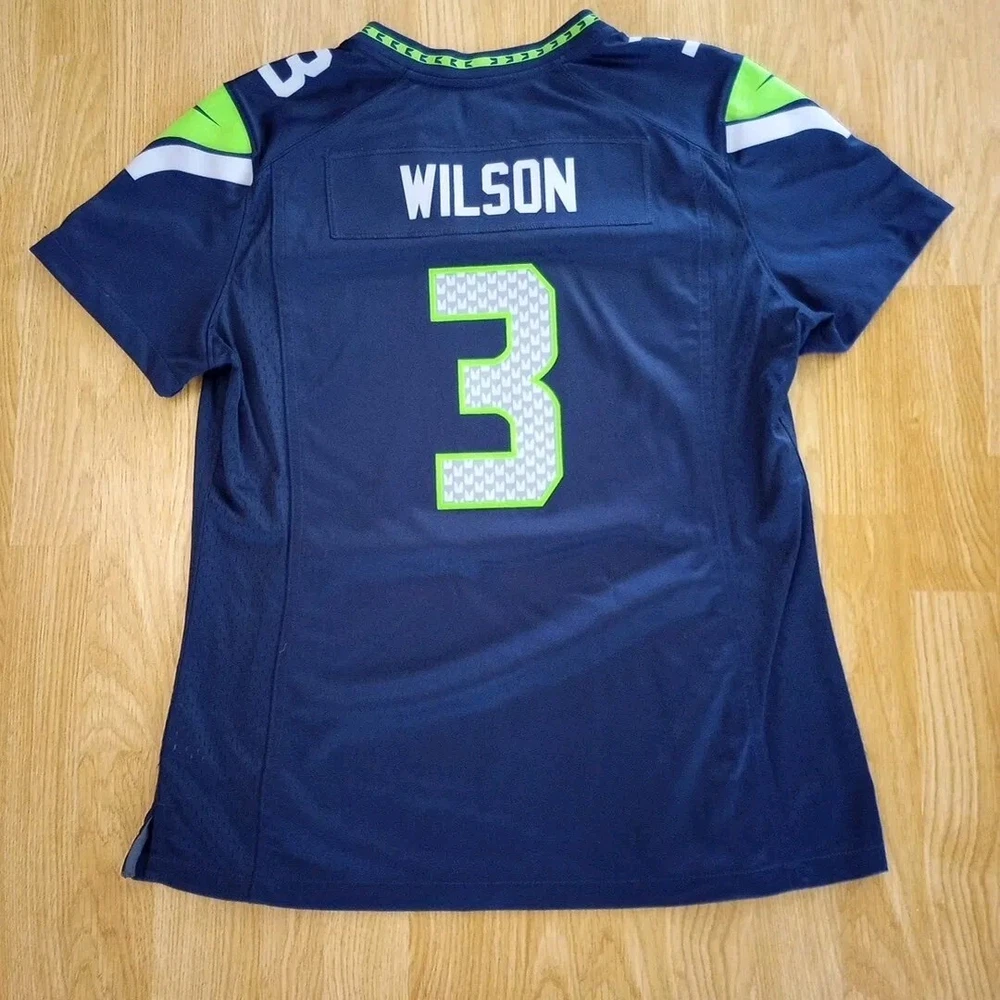 Show your support for the Seattle Seahawks with this Nike NFL jersey featuring Russell Wilson's number 3. The jersey is made for youth in size 12 and is perfect for fans of the National Football League. The Seahawk Navy color and officially licensed Nike brand make this jersey a must-have for any football enthusiast. This jersey is perfect for regular season games and is a great way to show off your team spirit. The product is made in Guatemala and is designed to last. Get ready to cheer on your favorite team with this high-quality jersey. Washed and cleaned as per eBay.