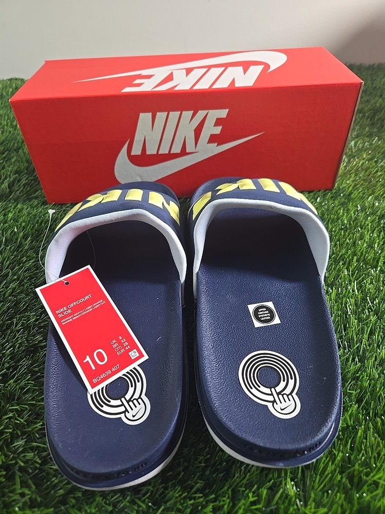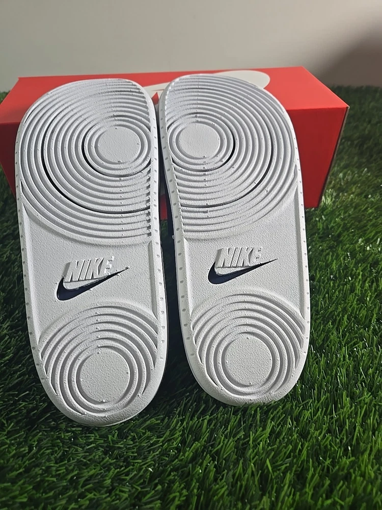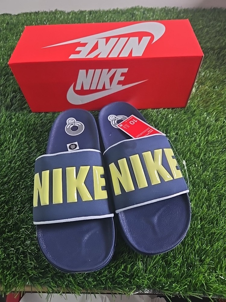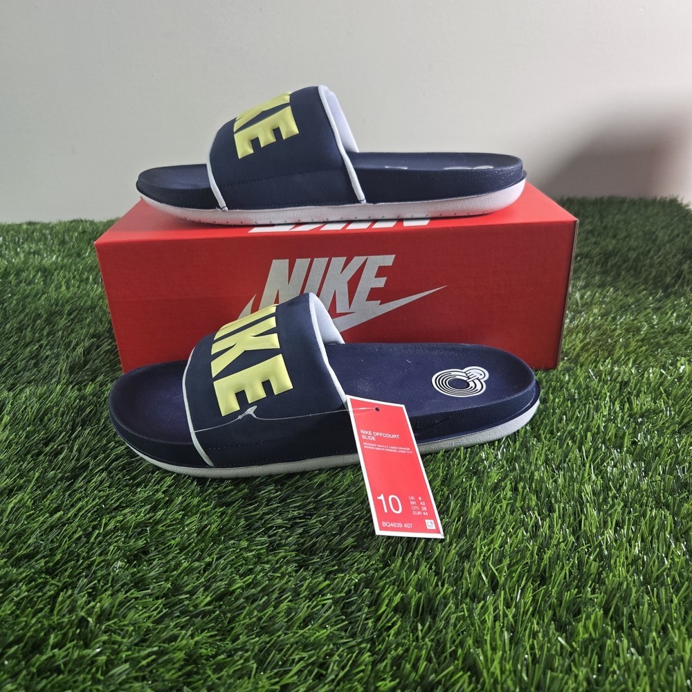 The Nike Offcourt Slides in navy blue size 10, are a stylish and comfortable option for casual wear. With a slip-on design and lightweight synthetic outsole, these sandals are perfect for travel, activewear, parties, and everyday outings. Featuring Nike's iconic logo accents and cushioned insole, these sandals offer both style and comfort for all-day wear. The breathable design and durable construction make them a versatile choice for all seasons.