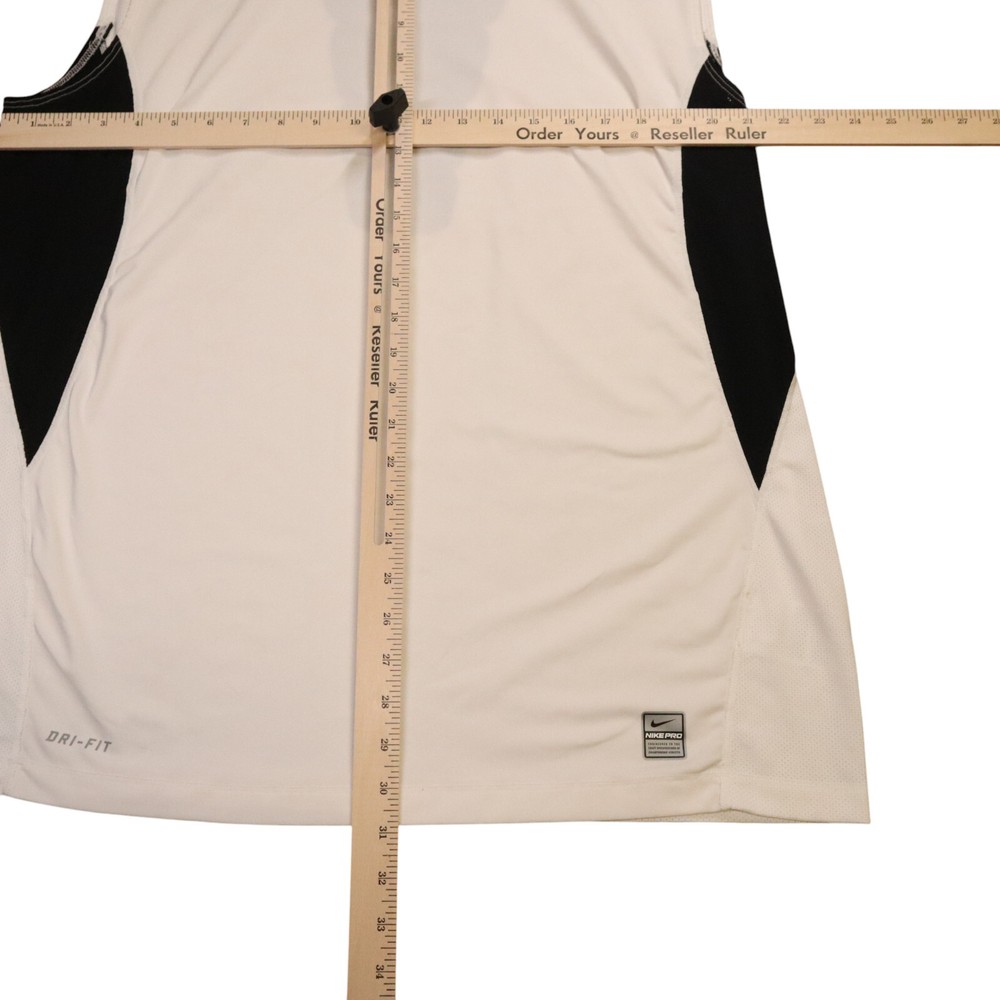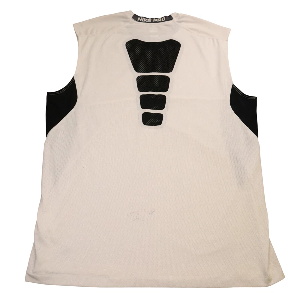 Fabric Wash: Medium Season: Fall, Spring, Summer, Winter Performance/Activity: Cross Training, Gym & Training, Running & Jogging Garment Care: Machine Washable Pattern: Solid Product Line: Nike Pro Occasion: Activewear, Casual Department: Men Style: Pullover Accents: Logo Shirt Length: 31 in Neckline: Crew Neck Collar Style: Band Sleeve Length: Sleeveless Vintage: No Seller Notes: “This shirt is in good used condition with a small stain on the lower back.” Theme: Logo, Outdoor, Sports Material: Polyester, Spandex Fit: Athletic Type: Tank Size: 2XL Size Type: Regular Chest Size: 42 in Closure: Pullover Fabric Type: Jersey Color: White Country/Region of Manufacture: Mexico Compression Level: Moderate Brand: Nike Features: Breathable, Lightweight, Stretch