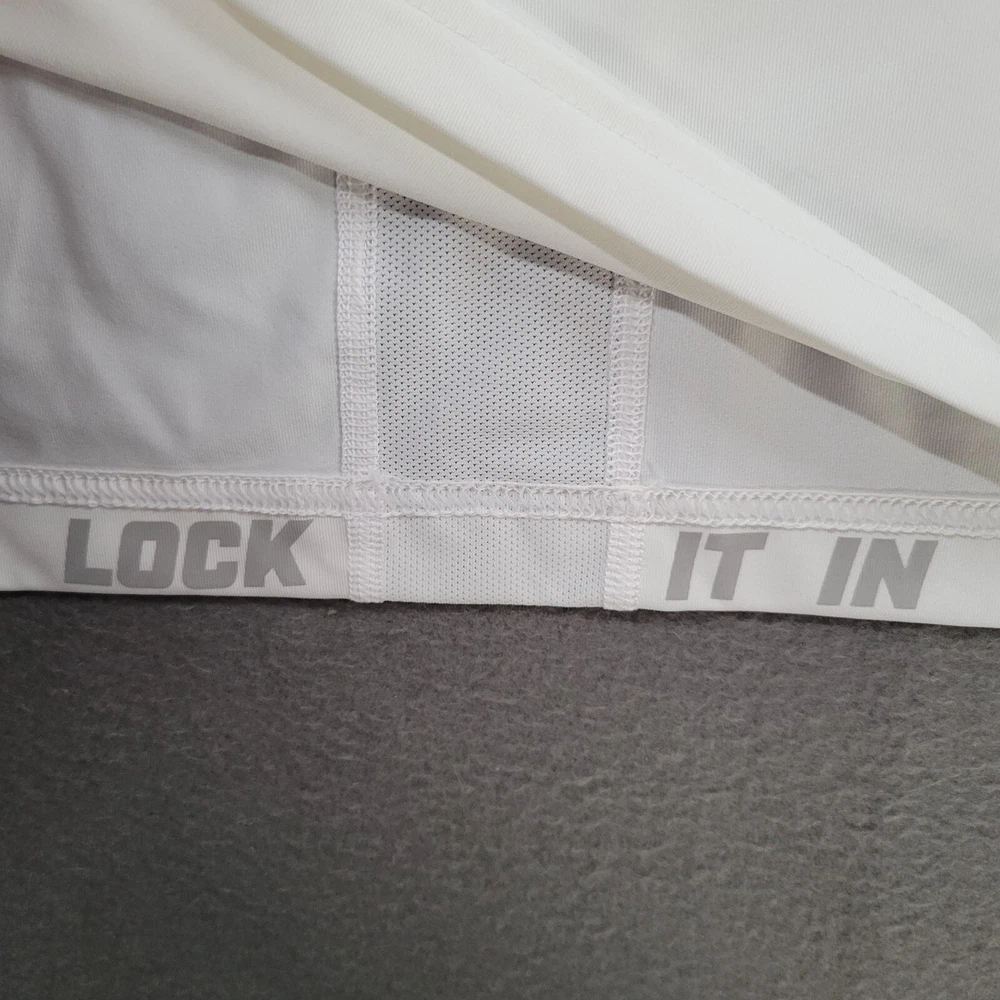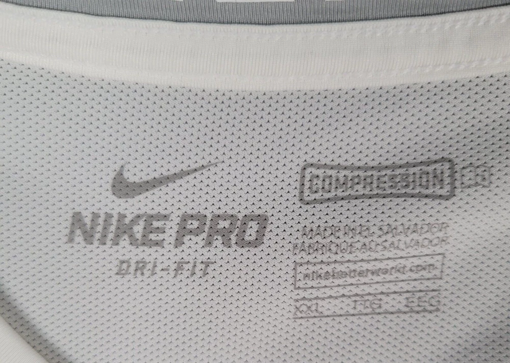 Size: 2XL Style: Pullover Sleeve Type: Classic/Fitted Sleeve Product Line: Nike Pro Compression Features: Lightweight, Moisture Wicking, Quick Dry, Stretch Accents: Logo Compression Level: Firm Fabric Wash: Medium Vintage: No Size Type: Regular Type: T-Shirt Garment Care: Machine Washable Theme: Logo, Outdoor, Sports Fabric Type: Jersey Shirt Length: 30 in Collar Style: Band Country/Region of Manufacture: El Salvador Chest Size: 38 in Personalize: No Occasion: Activewear Performance/Activity: CrossFit, Cross Training, Gym & Training, Running & Jogging Color: White Closure: Pullover Material: Polyester, Spandex Character: N/A Pattern: Solid Brand: Nike Handmade: No Department: Men Fit: Athletic Sleeve Length: Short Sleeve Season: Spring, Summer Neckline: Crew Neck Model: Nike Dri-Fit