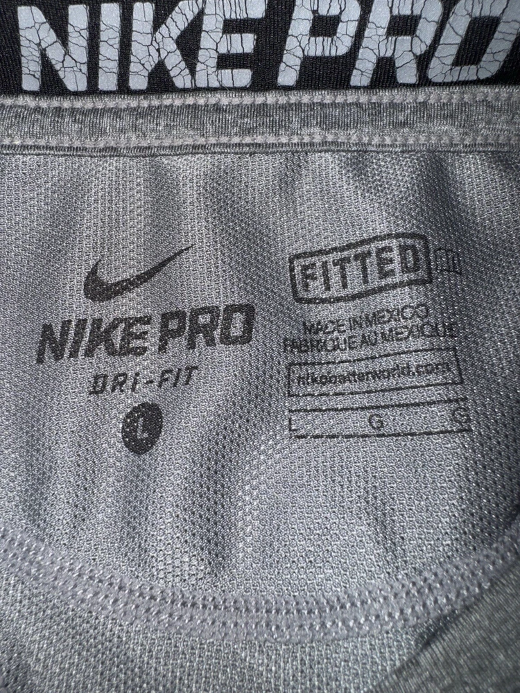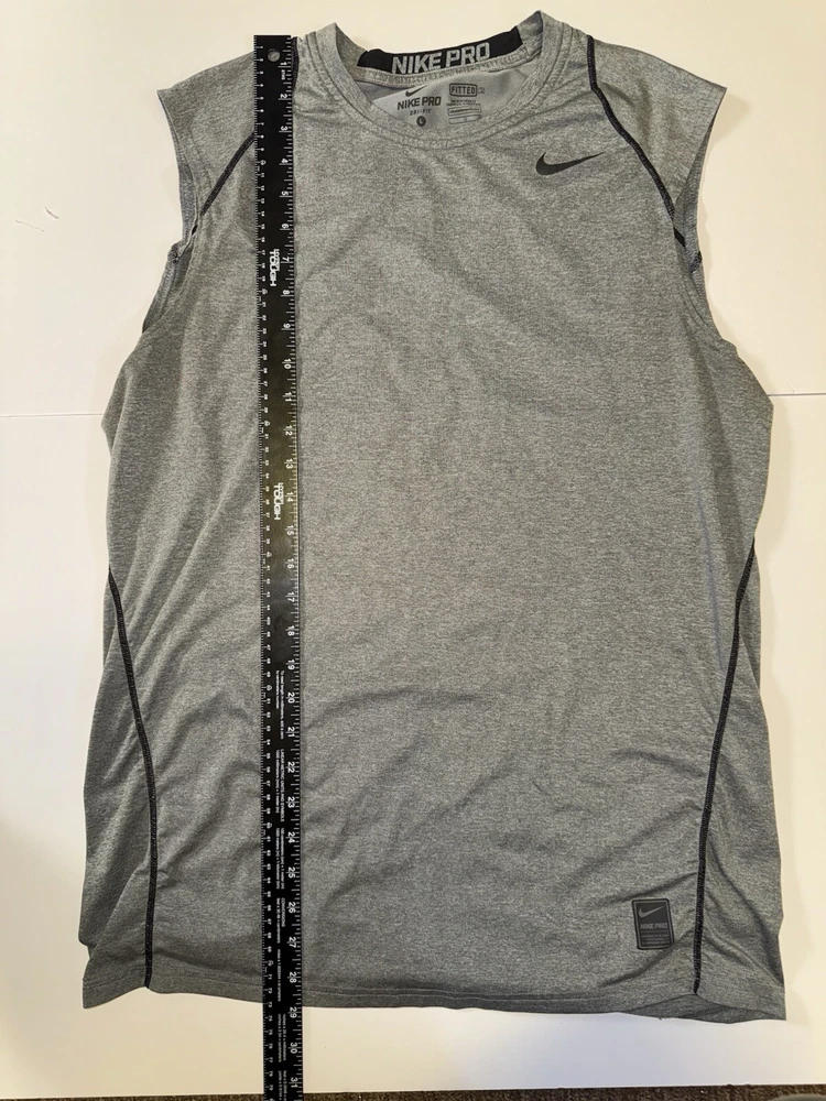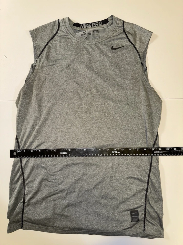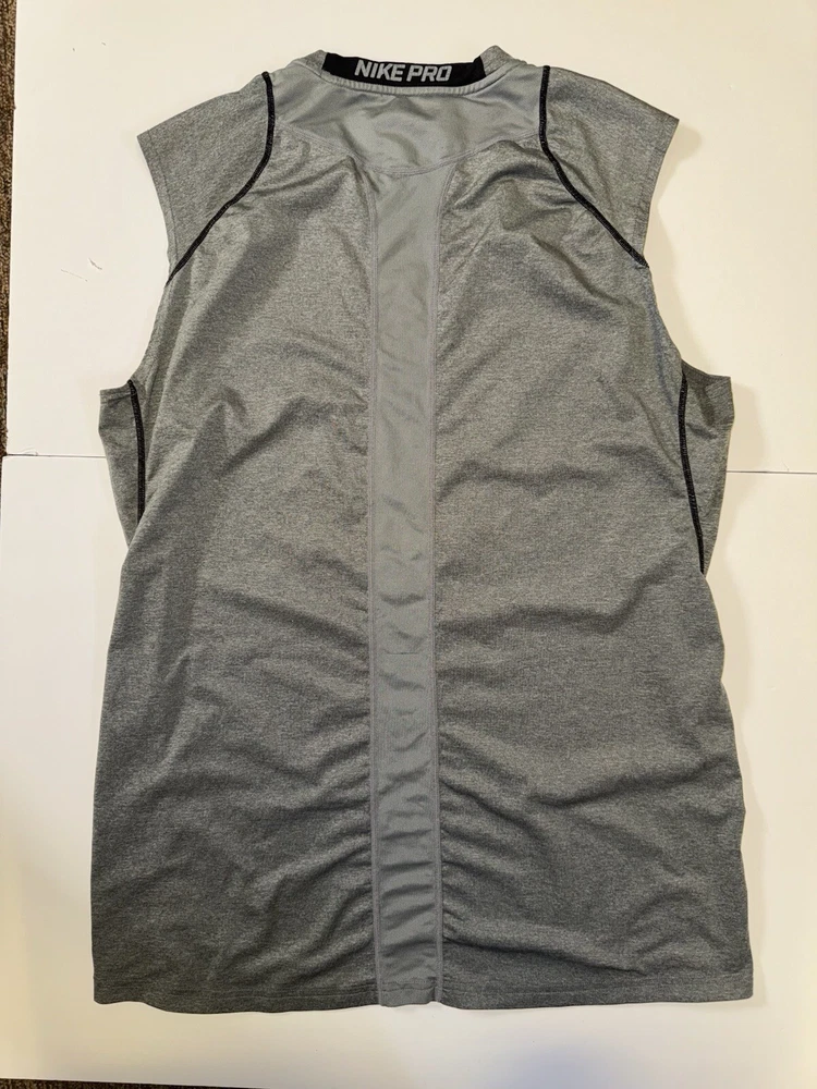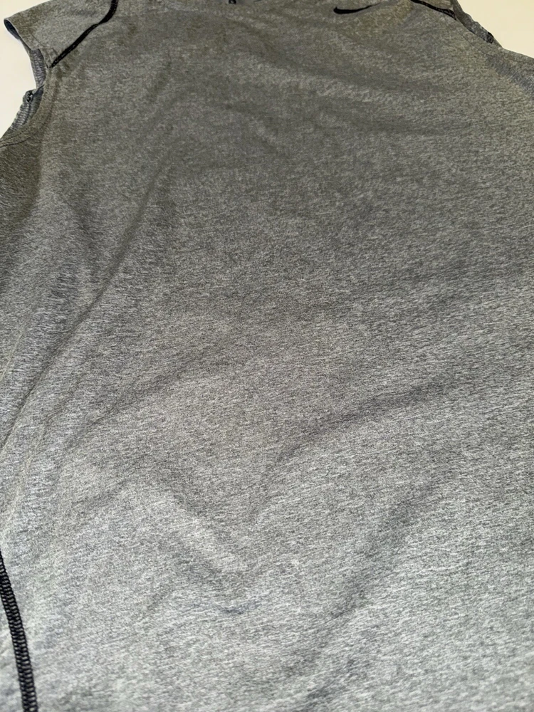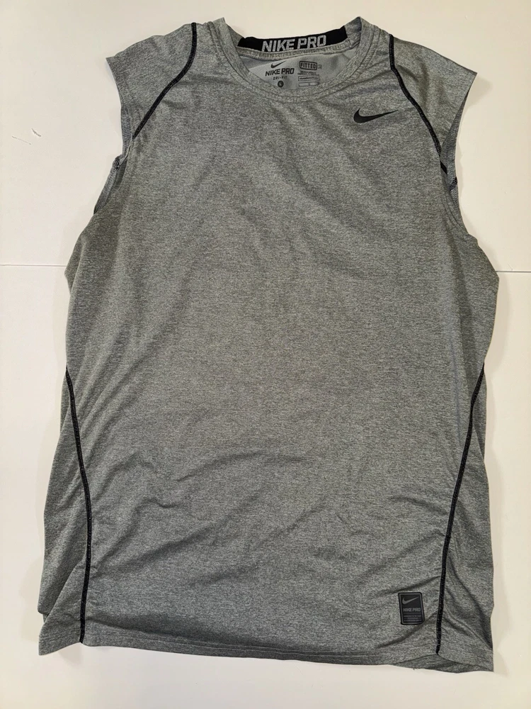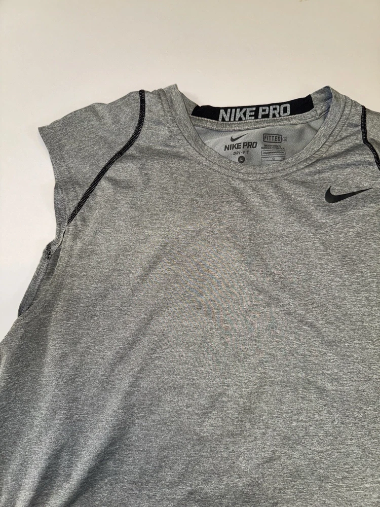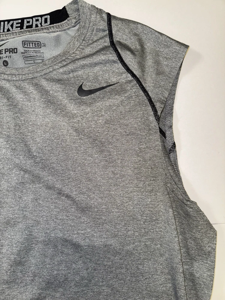 This Nike Pro Dri Fit Sleeveless Shirt Tank Top in Gray, Size Large is perfect for any athletic activity. The lightweight and breathable material made of polyester ensures maximum comfort during gym & training, cross training, running & jogging. The tank top features a solid pattern, crew neck. The Nike brand is known for its quality and this tank top is no exception. The athletic fit is perfect for any male looking for a comfortable and stylish activewear top. The shirt is part of the Nike Pro product line, known for its high-quality activewear.