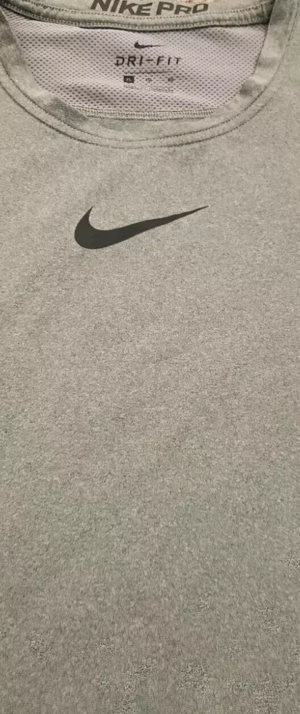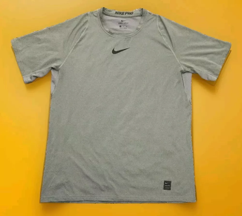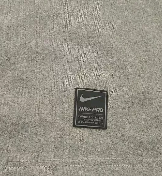 This Nike Pro Dri-Fit Men's Tee is a solid gray short sleeve shirt designed for athletic performance. Made of a polyester-spandex blended fabric, it features a crew neck and pullover closure. The shirt is lightweight, moisture-wicking, and breathable, making it ideal for activities like gym training, cross-training, bodybuilding, and running. With its athletic fit and Nike Pro branding, this XL tee is a versatile choice for sports and workouts. In good condition!