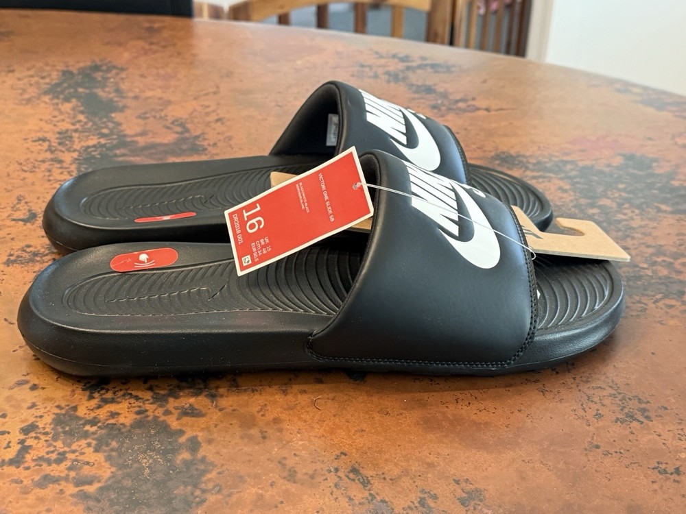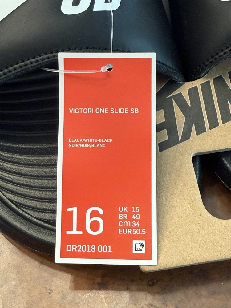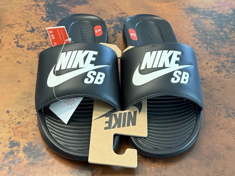 The NIKE SB VICTORI ONE SLIDES SANDALS in black and white are a stylish and comfortable option for men. These sandals feature a slide style design with a synthetic upper material, making them durable and easy to slip on and off. With a size 16 US shoe size and the iconic Nike SB product line, these sandals are perfect for casual wear or hitting the skate park.
