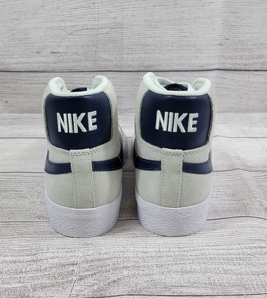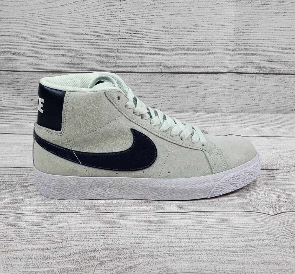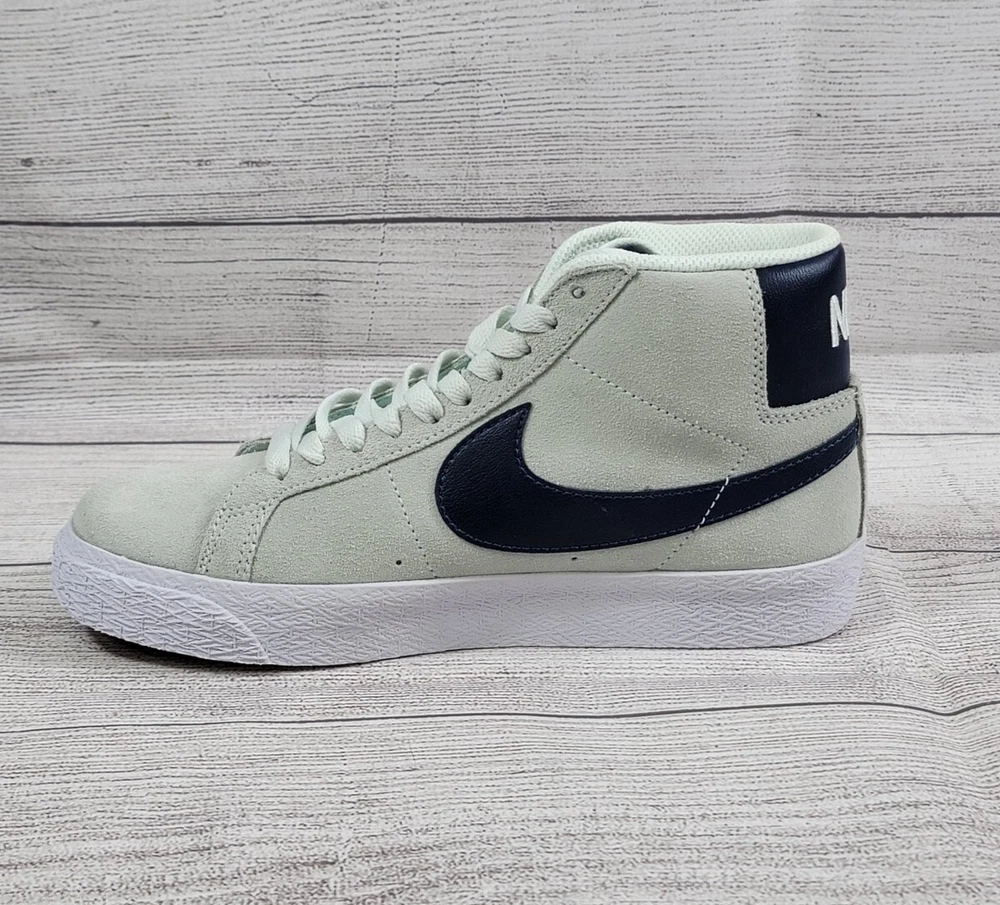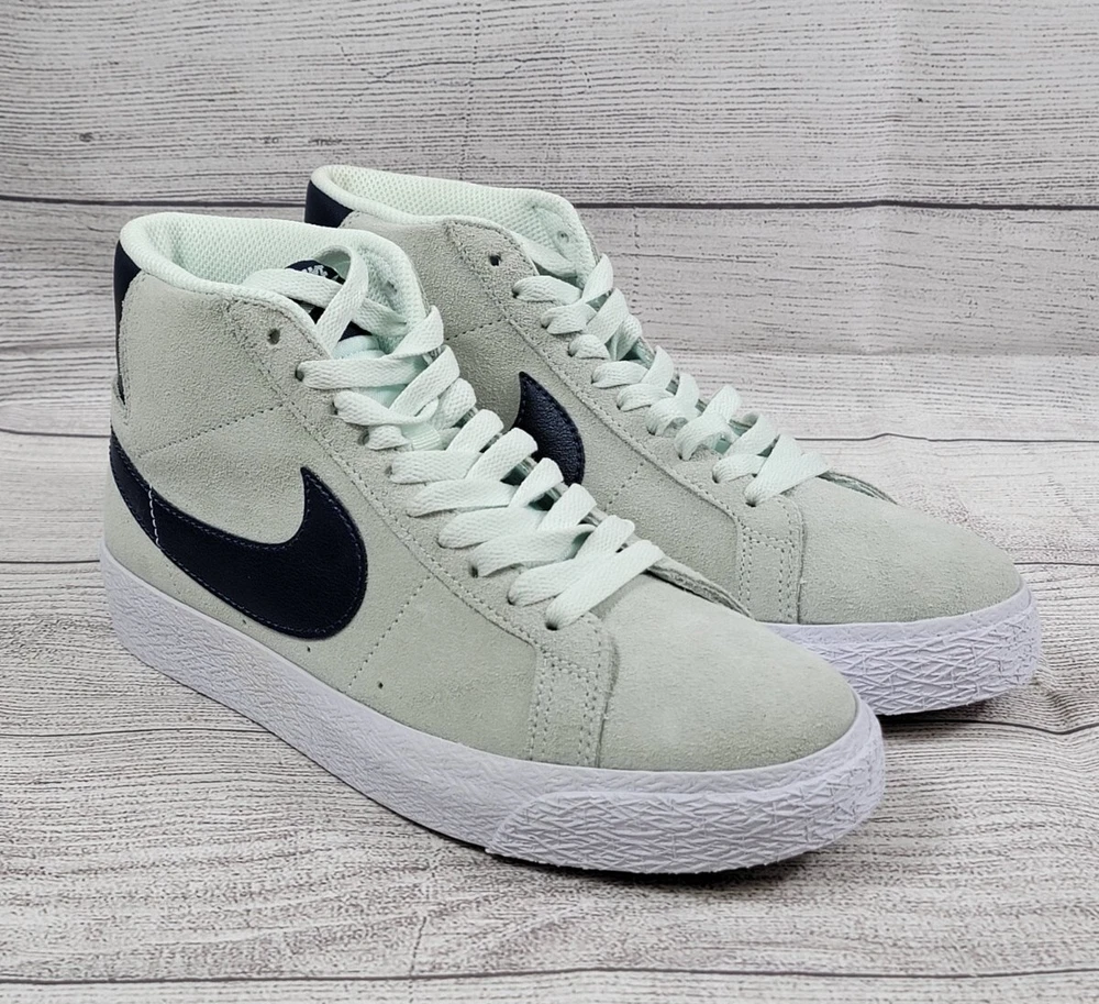 Nike SB Zoom Blazer Mid 'Barely Green' 864349-303 US Men's Size 5 /Women's Size 6.5 Brand New Without Box Nike SB Zoom Blazer Mid sneakers in 'Barely Green' and Navy colors, featuring a lace-up closure and mid-top style. These men's shoes in size 5 (women's size 7) are part of the Nike Zoom product line, with a solid pattern and comfortable, breathable design. Suitable for activewear and casual occasions, they are ideal for walking and skateboarding activities in all seasons.