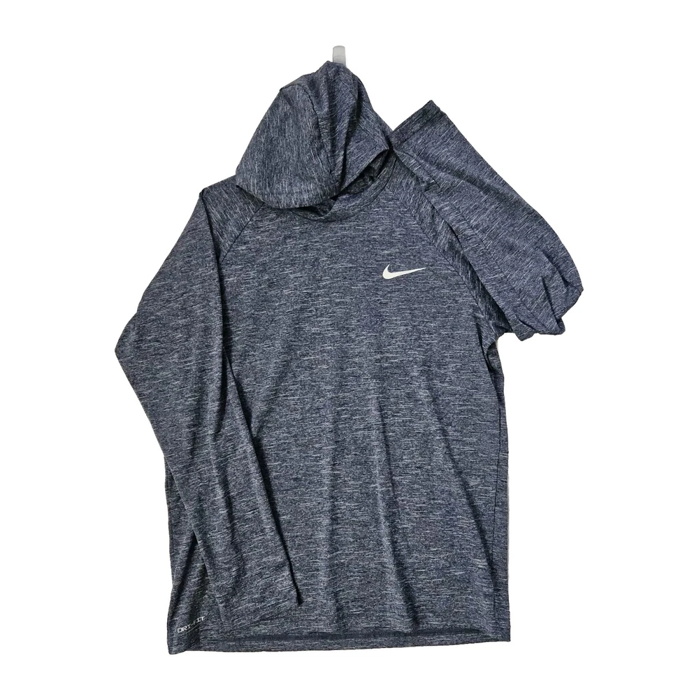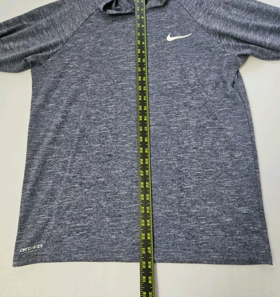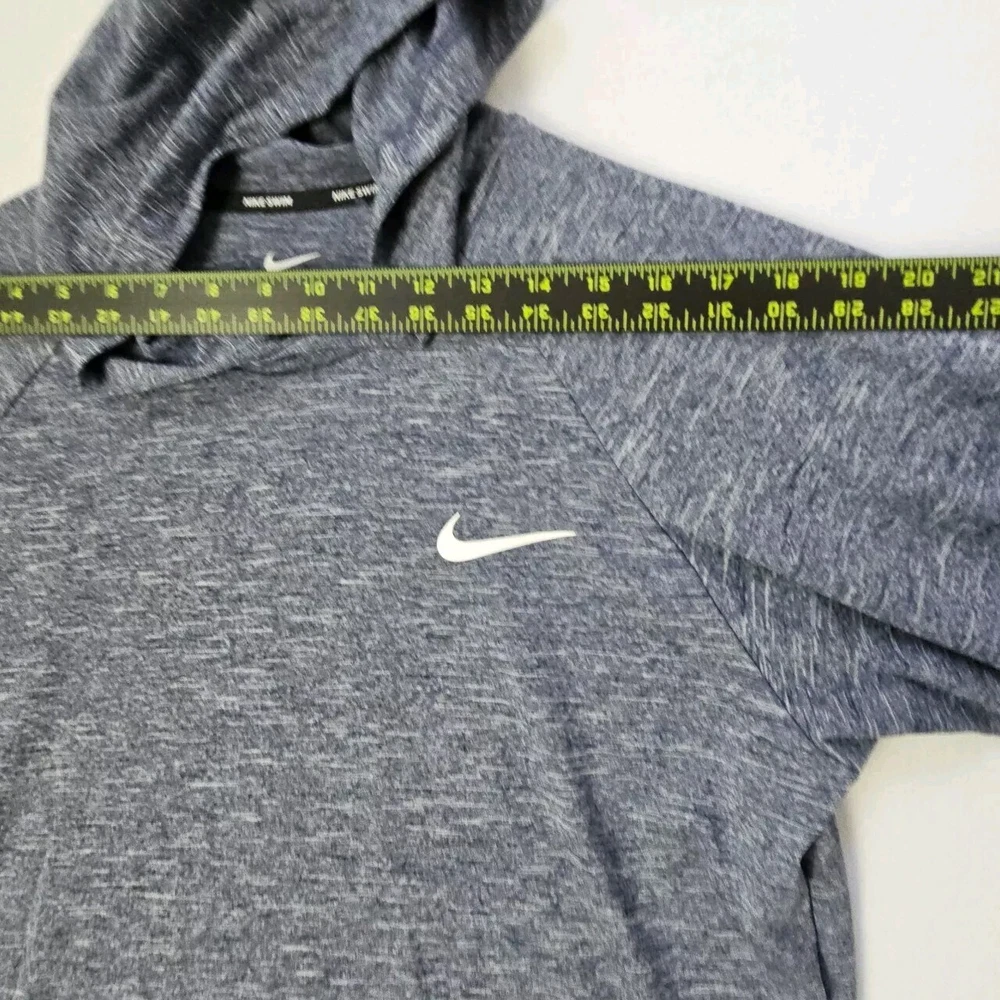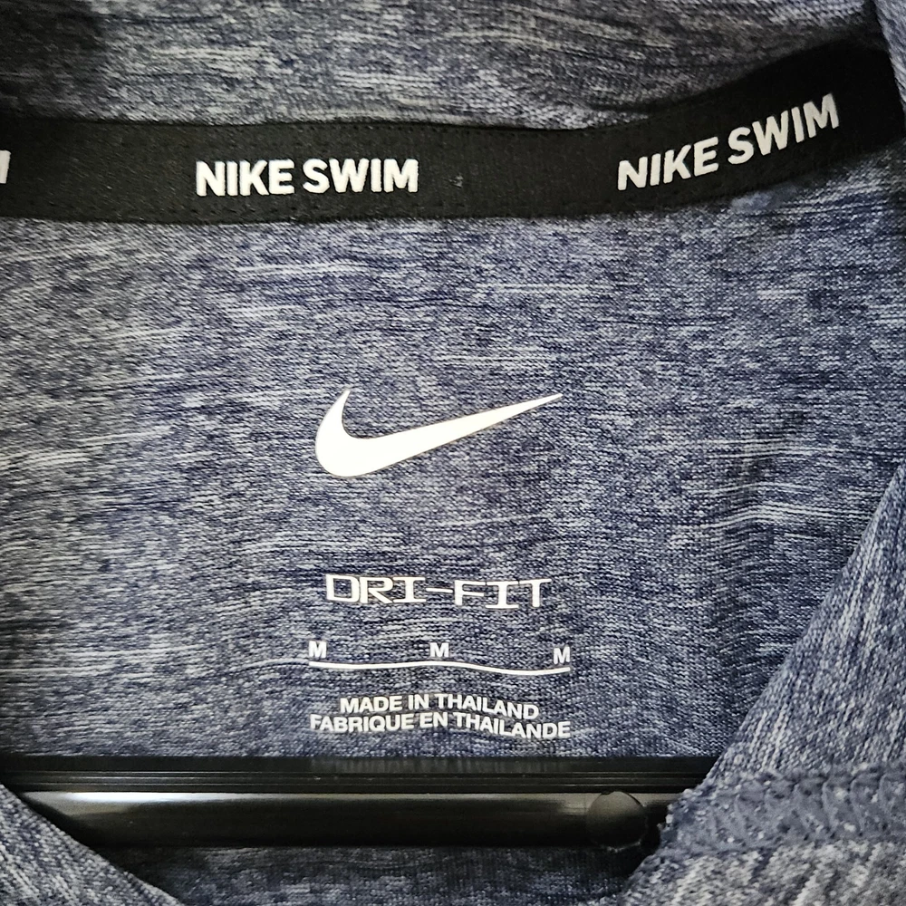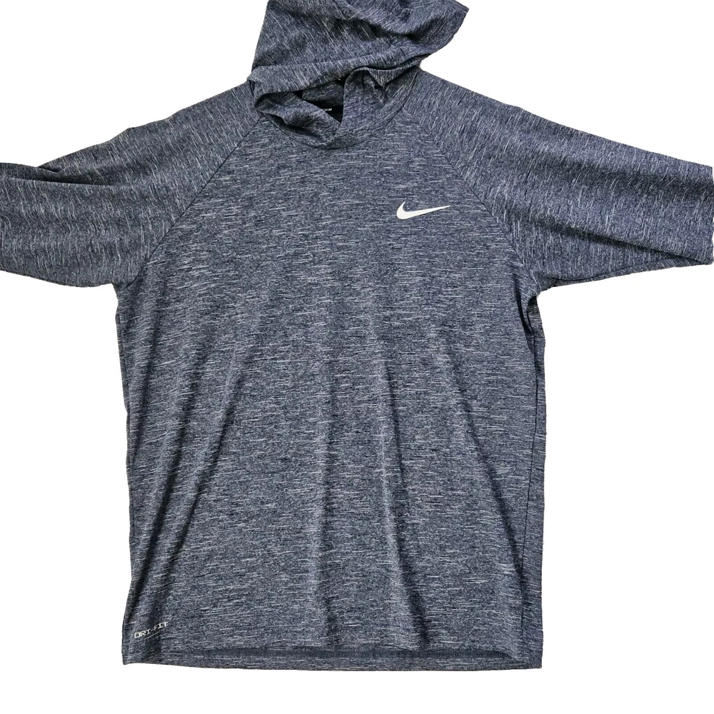 Nike Swim dri fit blue and white mix with hoodie long sleeve. Shirt is in excellent clean condition no holes or tears. Sz Medium measures flat 19" across shoulders 21" pit to pit 28" Length 23" sleeves