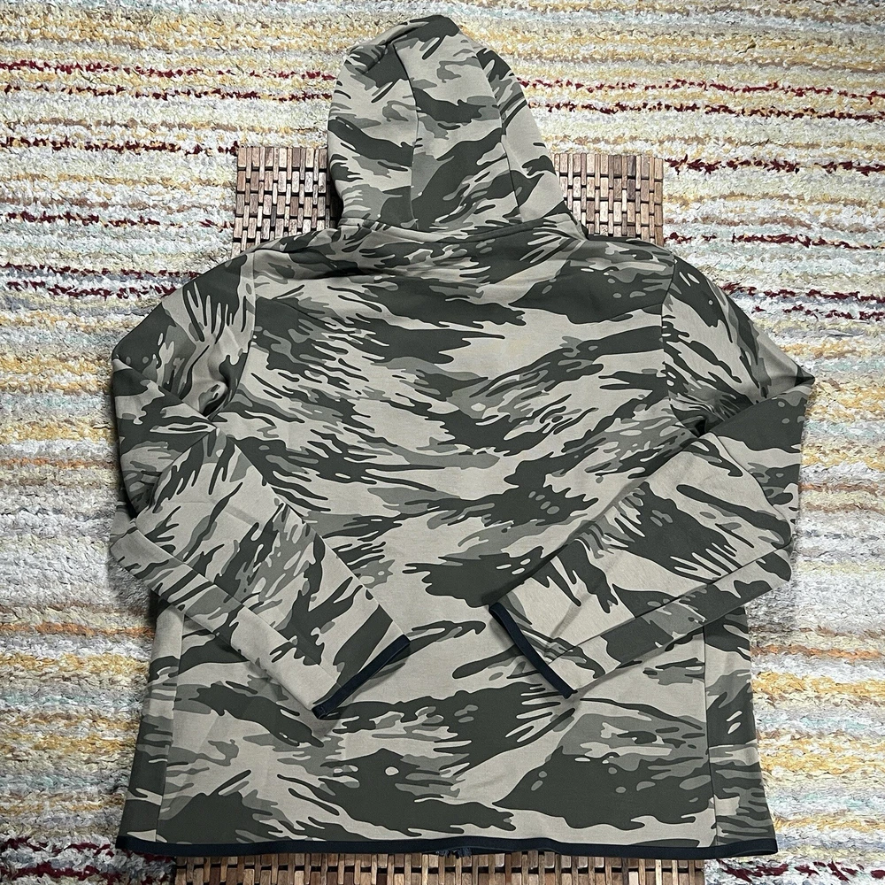 Stay comfortable and stylish during your workouts with this Nike Tech Fleece Hoodie. Featuring a green camouflage pattern, long sleeves, and a full zip closure, this hoody is perfect for gym & training, cross training, CrossFit, skateboarding, basketball, hiking, and running & jogging. The hoodie is made from a soft and durable 66% cotton and 34% polyester blend, and it comes in a regular fit and size XL. The Nike Tech Fleece Hoodie also features a hood, pockets, and the Nike Sportswear product line, making it a great addition to your activewear collection. It's machine washable and easy to care for, so you can focus on your workouts instead of worrying about laundry. Get ready to elevate your athletic style with this comfortable and fashionable hoody.