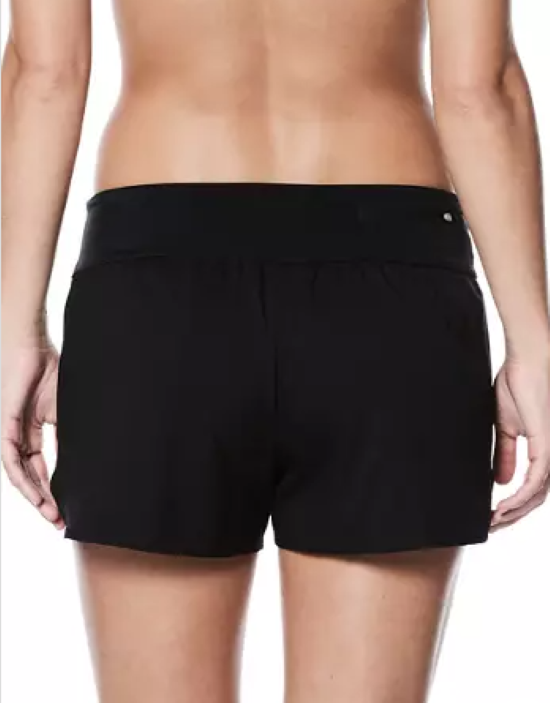 Nike women's Element Swim Board Shorts size: Large color: Black Pull-on style Wide waistband Modern Athletic Fit Sits at hips Full bottom coverage Swoosh logo and slits at side hem Unlined Chlorine resistant Zipper pocket detail on back waistband Polyester K29