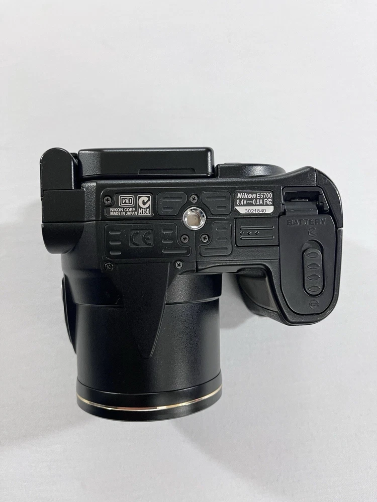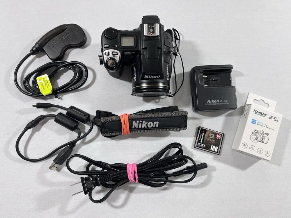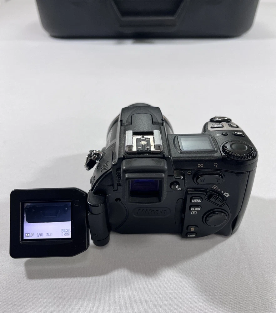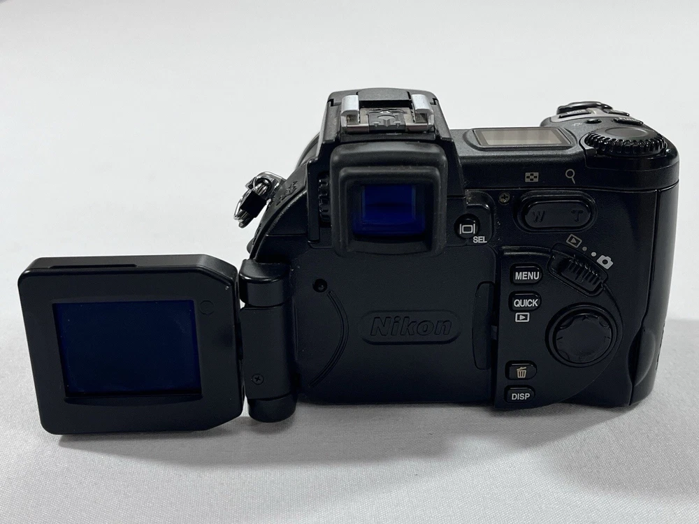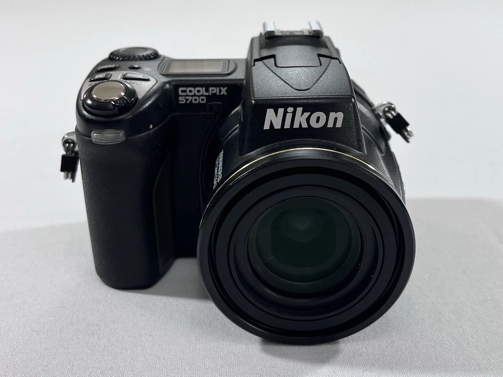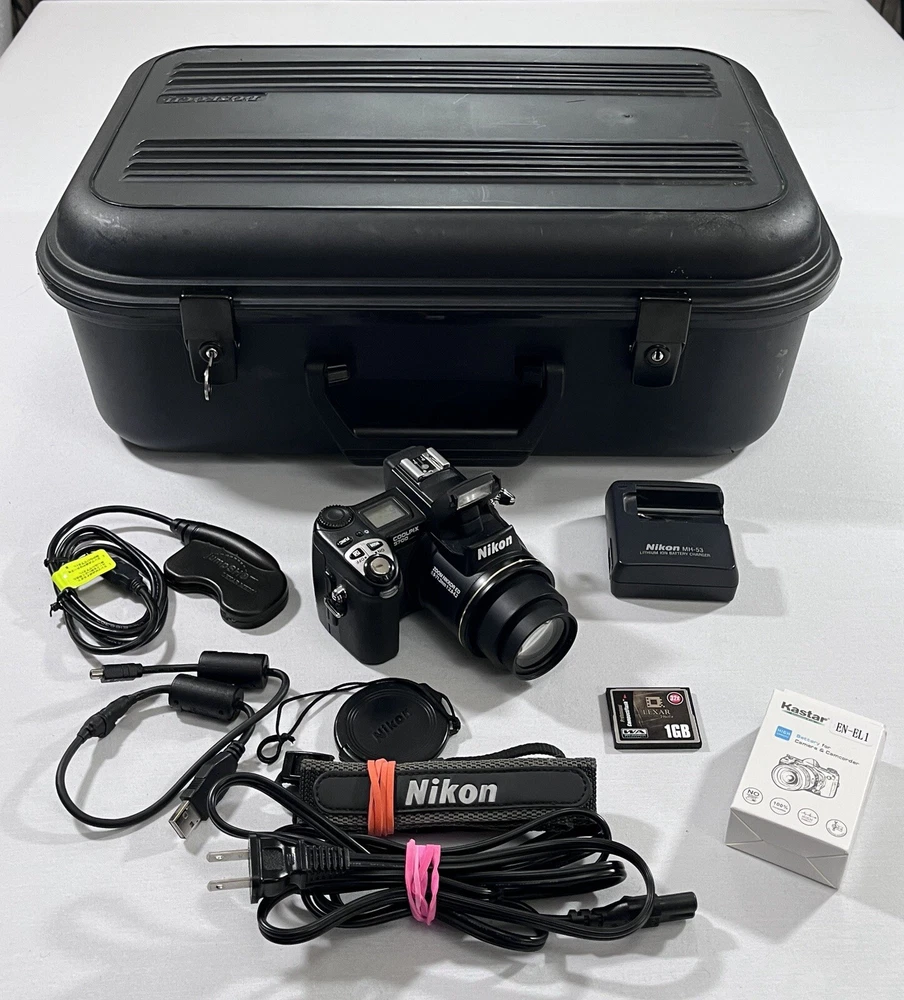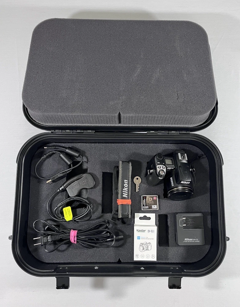 Nikon CoolPix 5700 Compact Bridge Digital Camera Year: 2002 Model No. E5700 Color: Black Camera Weight: 1 lb Includes; 1 Lockable Hard Case With Foam Inserts & Key, 1 Digital Camera With Neckstrap, 1 Lens Cover, 1 Memory Card With USB Adapter, 1 Kastar Battery (New/Open Box), 1 Charger With Power Cable, 1 Nikon UC-E1 USB Adapter. The camera housing is in excellent condition with no obvious signs of wear. It has very good photo quality and the camera is fully functional. There are no scratches or blemishes on the lens. The Hard Case is in very good condition but there are scratches/blemishes on the outer shell. It’s large enough to fit 1 or more additional cameras. Hard Case Interior Dimensions (inches): W 17 1/2 x H 4 7/8 x D 11 1/2 Hard Case Outer Shell Dimensions (inches): W 19 x H 7 x D 13 1/4