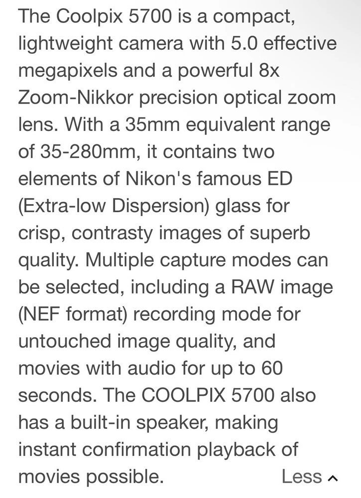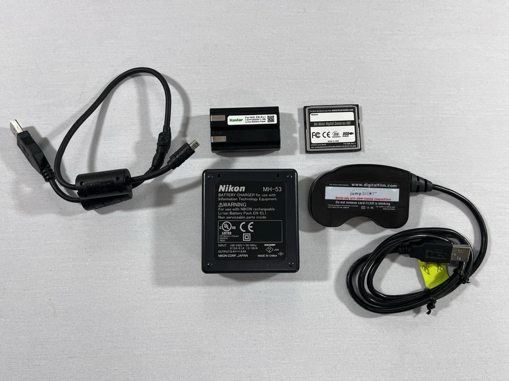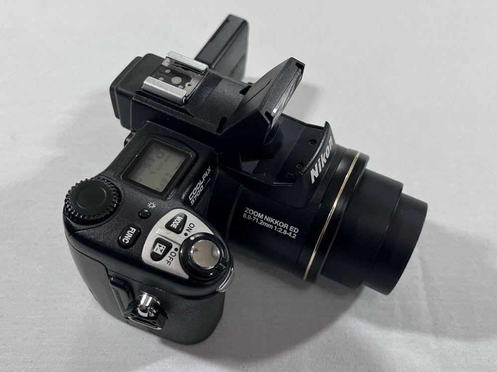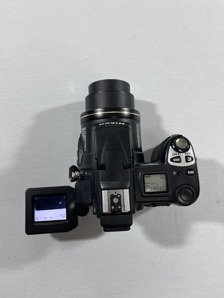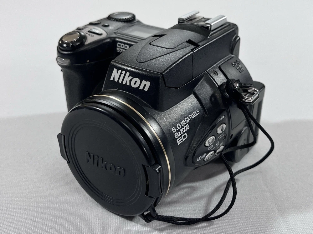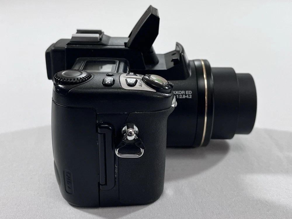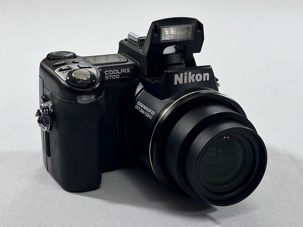 Nikon CoolPix 5700 Compact Bridge Digital Camera Year: 2002 Model No. E5700 Color: Black Camera Weight: 1 lb Includes; 1 Lockable Hard Case With Foam Inserts & Key, 1 Digital Camera With Neckstrap, 1 Lens Cover, 1 Memory Card With USB Adapter, 1 Kastar Battery (New/Open Box), 1 Charger With Power Cable, 1 Nikon UC-E1 USB Adapter. The camera housing is in excellent condition with no obvious signs of wear. It has very good photo quality and the camera is fully functional. There are no scratches or blemishes on the lens. The Hard Case is in very good condition but there are scratches/blemishes on the outer shell. It’s large enough to fit 1 or more additional cameras. Hard Case Interior Dimensions (inches): W 17 1/2 x H 4 7/8 x D 11 1/2 Hard Case Outer Shell Dimensions (inches): W 19 x H 7 x D 13 1/4