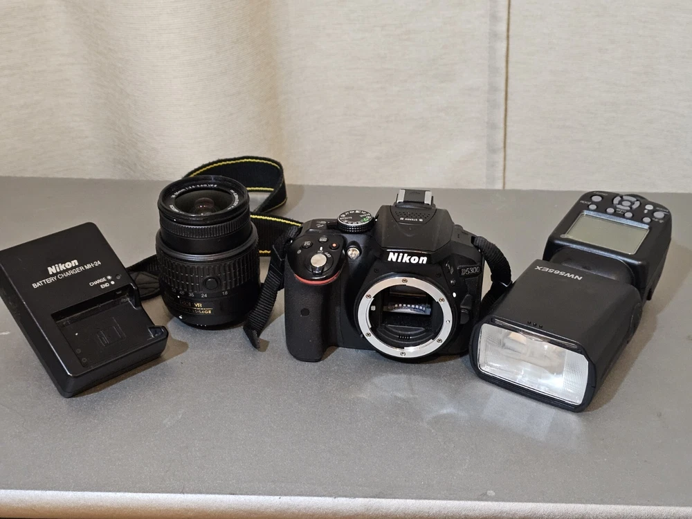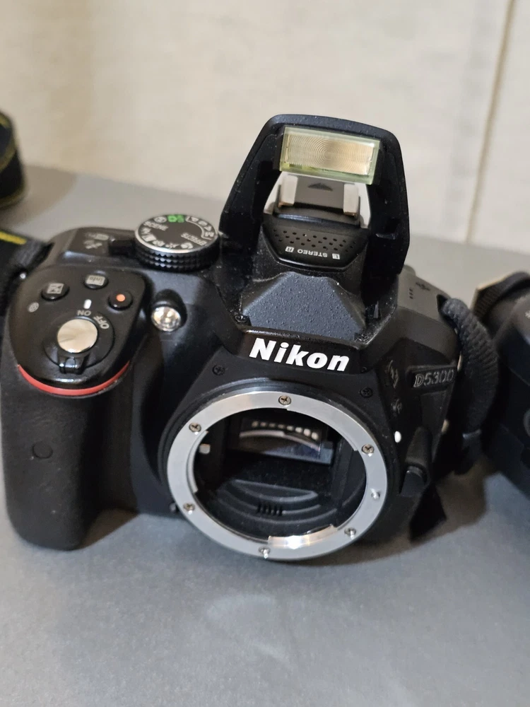Nikon d5300 dslr camera Used Excellent condition, but it has light dust due to storage. (See the pictures ) Comes with charger ,battery,SD card 64G, flashlight, and essential lens. Doesn't Come lens cover.