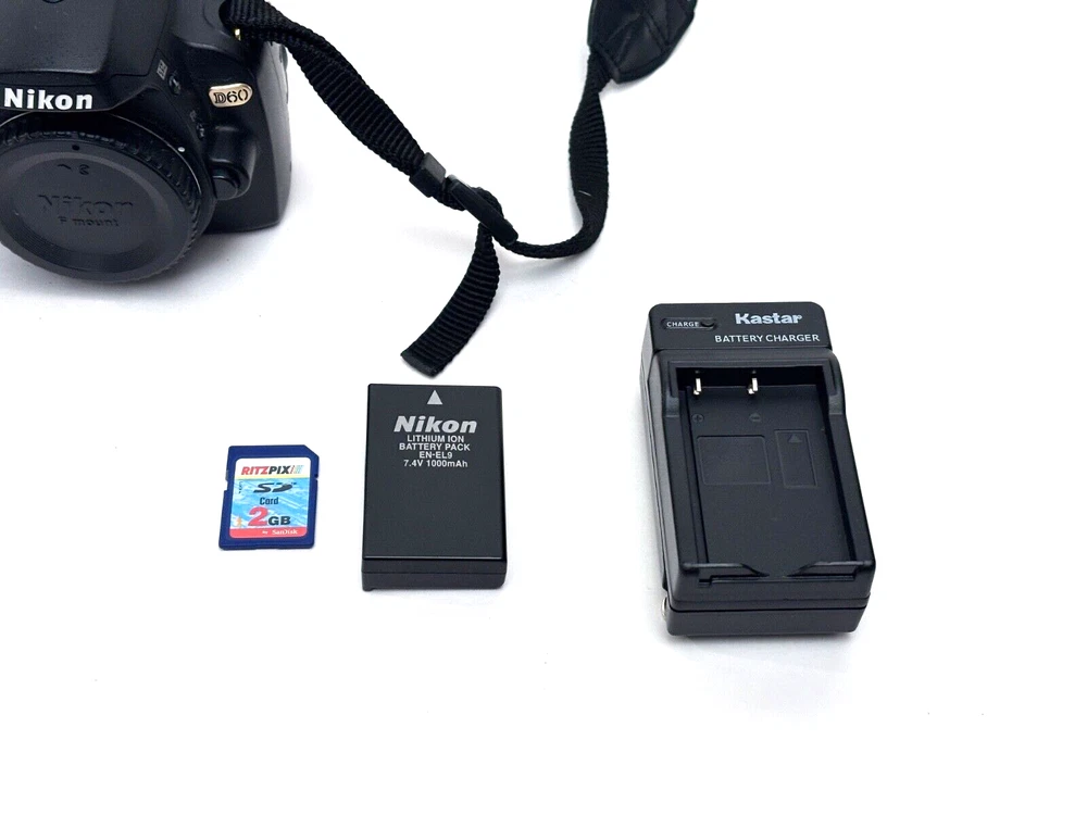 Overall Excellent condition some light scratches on screen minimal only visible when screen is off. Overall Excellent condition The Nikon D60 is a 10.2MP Digital SLR camera body that comes with a strap, battery, charger, and SD card included. It is designed for photographers looking for a reliable and high-quality camera to capture stunning images. This model is part of Nikon's lineup of digital SLR cameras, offering advanced features and functionality for photography enthusiasts.