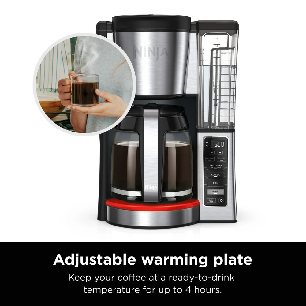 Ninja Coffee Brewer, Glass Carafe, CE250 is a 12-cup programmable coffee maker with custom brew strengths and a hotter brewing advanced boiler to make hot, flavorful, and never-bitter coffee. From a small batch (1-4 cups) to a full carafe, Classic or Rich strengths, you can expect the same great taste. Enjoy ultimate convenience with 24-hr delay brew, an adjustable warming plate, and a removable water reservoir. 2 Brew Styles: Classic or Rich, each brew is flavorful and never bitter with custom brew strengths Hotter Brewing Technology: Delivers even saturation and temperature control for ultra-flavorful coffee Wake up to Hot Coffee: 24-hour programmable delay brew allows you to prepare your brew up to a day in advance Adjustable Warming Plate: Keep coffee fresh and flavorful up to 4 hours Removable Water Reservoir: Conveniently carry the 60-oz. water reservoir to your sink for easy filling Mid-Brew Pause: Pour yourself a cup before the brew is complete Small Batch Function: Ensure your coffee is never diluted when brewing a small batch (1-4 cups) Includes: 12-cup glass carafe, paper filter kit, Ninja scoop
