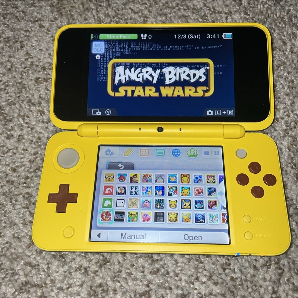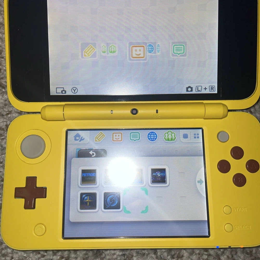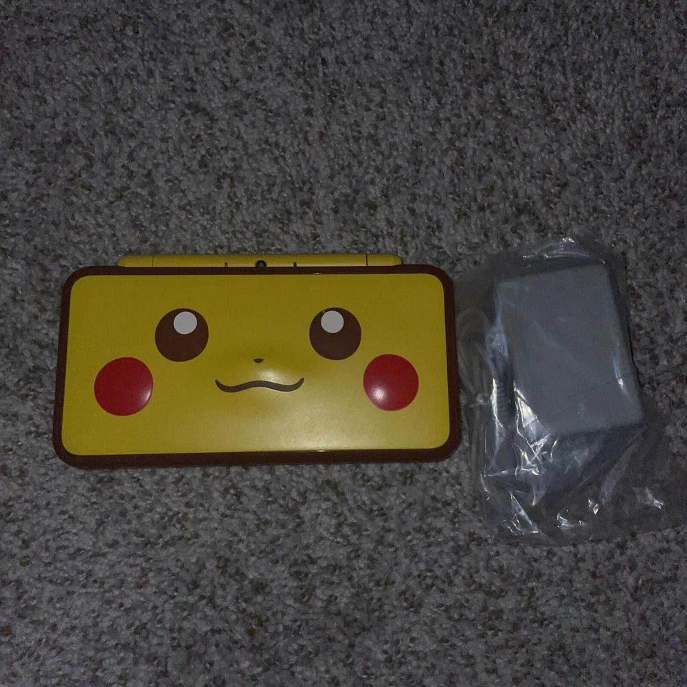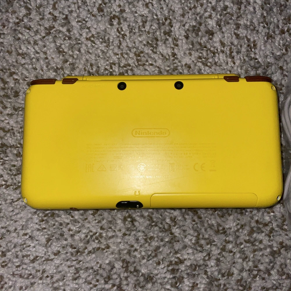 The product is a Nintendo 2DS XL handheld system in Pikachu Edition Yellow color. It has 128 GB storage capacity and comes with 100+ games pre-installed on a 128GB SD card. The system features Wi-Fi capability, internet browsing, and includes a stylus. It is suitable for use in the NTSC-U/C region (US/Canada) and is branded as Nintendo.