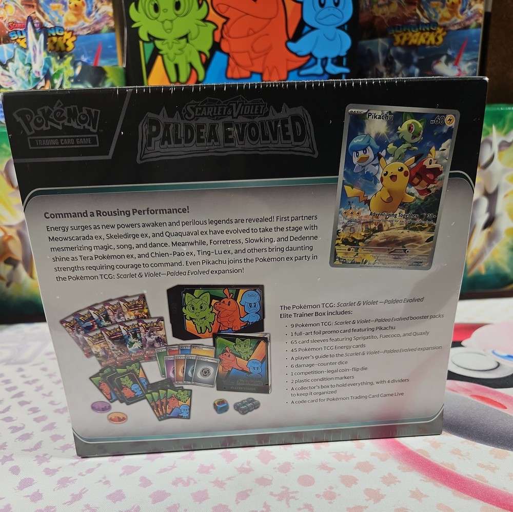 This Elite Trainer Box is a must-have for Pokémon TCG fans! Packed with 9 boosters, it's a fun way to build your collection with fresh Paldea Evolved cards. The box includes cool extras like dice, sleeves, and a guide, making it perfect for battles or display. The vibrant artwork and quality materials make it feel premium, and pulling rare cards never gets old. Great value for both players and collectors—highly recommend picking one up!