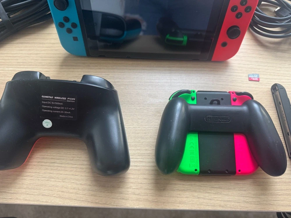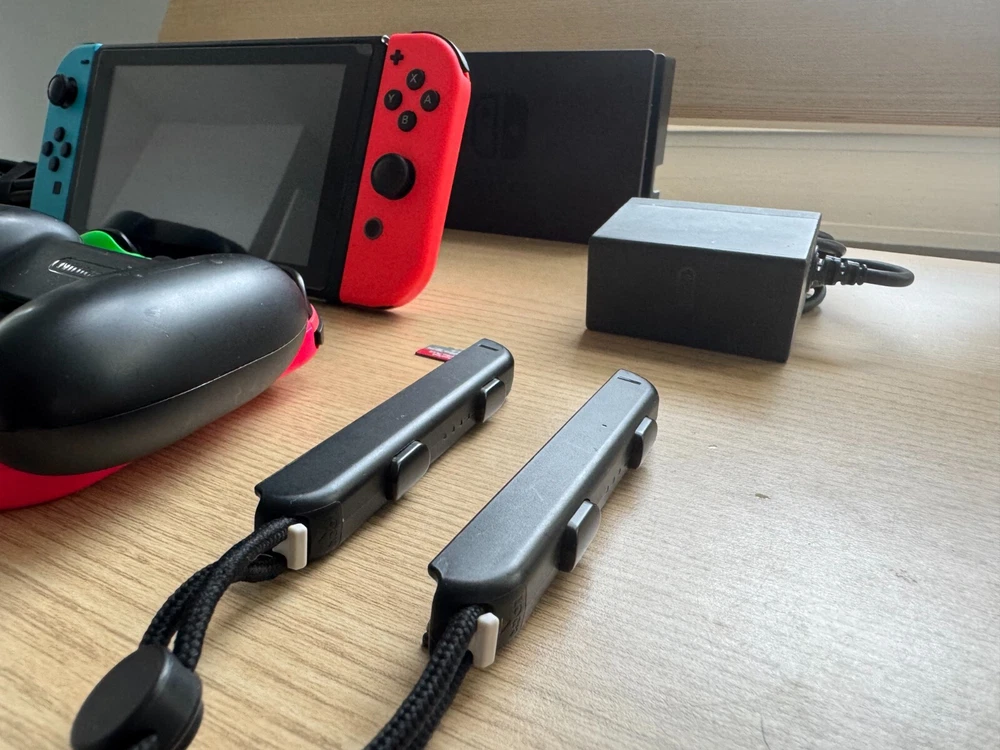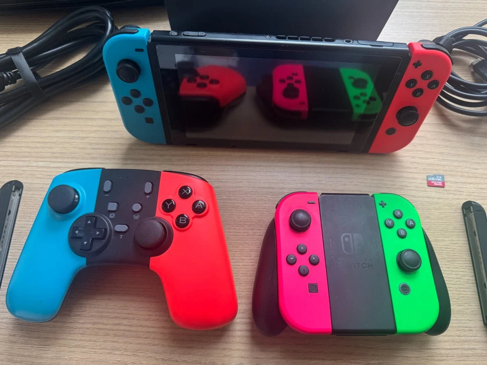 Items: Nintendo Switch Console Original Nintendo Docking Station Original Nintendo Power Adapter Original Blue and Red Nintendo Joy Cons with side button holders Original Nintendo Joy Con Controller holder Nintendo Pink and Green Joy Con set with side button holders 3rd party controller with bluetooth connectivity and USB-C charging Carrying Case HDMI Cord 128GB SanDisc MicroSD card The console has been factory reset and is in perfect working condition. Please feel free to ask any questions or OBO. This Nintendo Switch is in great condition without scratches or marks. The console comes with the original TV docking station, original blue and red joy cons, original power adapter, original joy con controller holders, and an HDMI cord. Included in this purchase are an extra set of joy cons in green and pink/red coloring, a carrying case, a 128 GB SanDsic microSD card, and a 3rd party controller with bluetooth connectivity and USB-C charging.