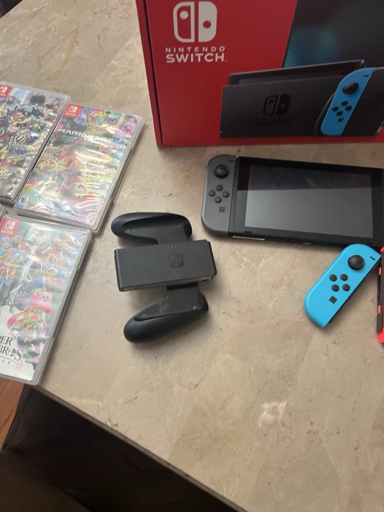 Nintendo Switch everything works fine comes with 6 games 64 GB sd card already inside extra pair of joycons and an extra controller everything is in good condition dock included and charger included