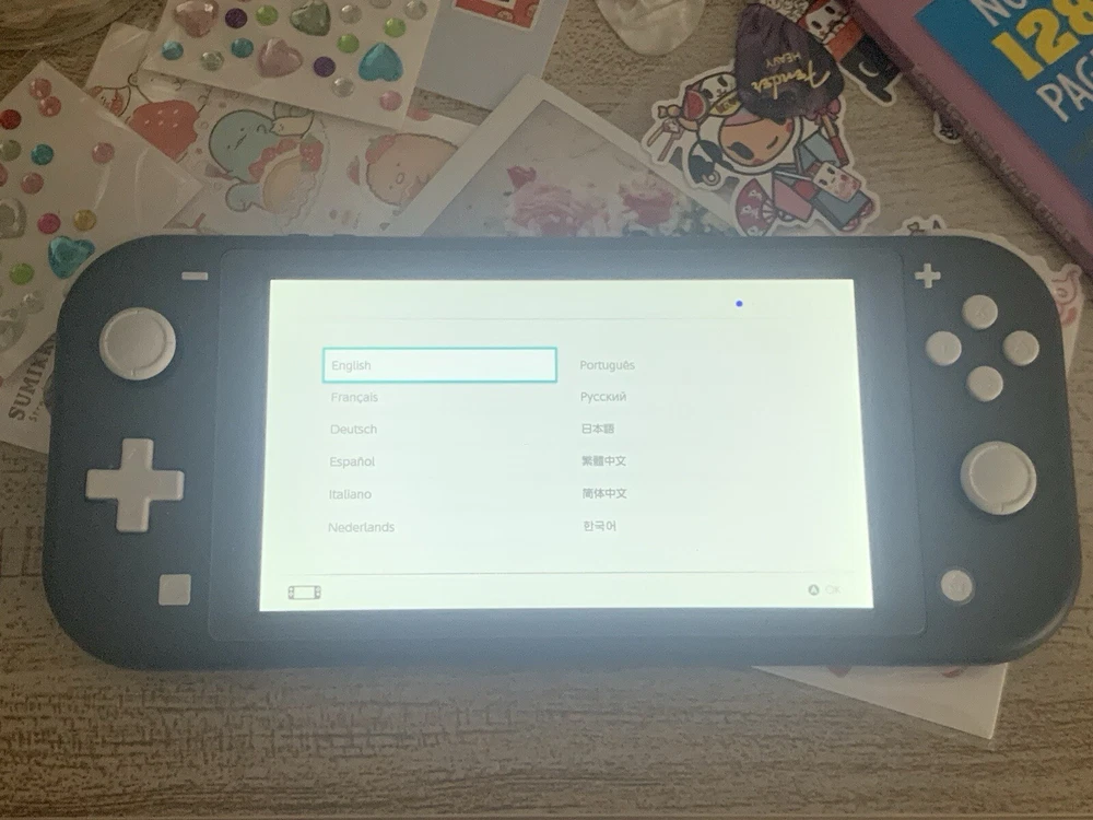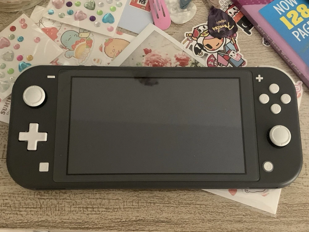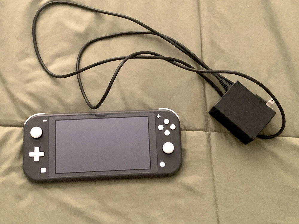 This is a Nintendo Switch Lite handheld system in gray color with a 32 GB storage capacity. Comes with charger.