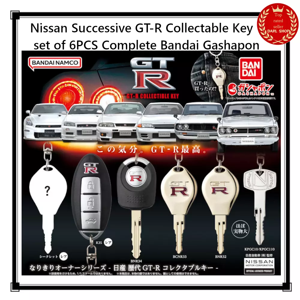 Description Condition : New Nissan Successive GT-R Collectable Key set of 6PCS Complete Bandai Gashapon JPN Experience the thrill of owning Japan’s most powerful sports car with the Nissan Successive GT-R Collectable Key Set . This new series from Bandai’s Nari-Kiri Owner Collection lets you feel like a GT-R owner, from the iconic Hakosuka to the modern R35, even if it's just the keys. Product Highlights : Complete Set : Includes all 6 different keys, each representing a legendary model from the Nissan GT-R lineage. No need to hunt for individual pieces – this set has them all! Authentic Design : Each key is crafted to look just like the real thing, allowing you to immerse yourself in the GT-R experience. Perfect for Collectors : These keys make a fantastic addition to any GT-R or car enthusiast’s collection. Product Details : Series : Nari-Kiri Owner Series - Nissan Successive GT-R Collectable Key Contents : 6 keys Material : ZnDC, ABS Dimensions : KPGC10/KPGC110: Approx. 58mm BNR32/BCNR33/Secret: Approx. 71.5mm BNR34: Approx. 86.5mm R35: Approx. 70mm Color : Multicolor Age Range : 15 years and up Why You’ll Love It : This set is a must-have for any GT-R enthusiast. The detailed and authentic keys bring the excitement of owning a GT-R to life, making it a perfect gift for car lovers. Whether for yourself or as a gift, this set promises to delight and enchant fans of all ages. Note: Due to their collectible nature, these keys are not functional and should be handled with care. International Shipping Standard Shipping : Japan Post (EMS or Air Packet) With Tracking Number, About 7-14 days Expedited Shipping : FedEx or DHL or EMS With Tracking Number, About 4-7 days **Please note that EMS has a damage compensation system, so large or fragile items may be sent via EMS. The product will be shipped from Japan. Please allow the following time to prepare for shipping. +Handing time about 3~10 business days. *Additional shipping charges may apply for remote areas. About delivery status The international shipping may be delayed now, but if, by any chance, a buyer does not receive the products, we will refund the full amount, so please purchase without worry. Terms of Salse [ Pre order ] If title has "PreOrder" or "PSL", it will be released around release date. But please understand that there is possiblity that manufacturer will change release date, item details or amount. We are contacting buyers when manufacturer change for Pre-Order items. [ Voltage & Plug ] Japan Voltage : 100V Plug: TypeA Please check your country's voltage before order. Buyer may need down transfomer to use our item, Because most of country's voltage is higher than 100V. Please check your country's plug. Buyer may need exchange plug. I f the product is damaged due to these troubles, we may not be able to accept returns or refunds. [Aged Items] Even if the item is carefully packed and arrives safely, it will deteriorate over time, so please handle it with particular care when using it. [Language] Instruction manuals and packages are basically in Japanese. International Buyers - Please Note: Import duties, taxes, and charges are not included in the item price or shipping cost. These charges are the buyer's responsibility. Please check with your country's customs office to determine what these additional costs will be prior to bidding or buying. Thank you for your understanding. Enjoy Shipping on eBay / DARL Shop