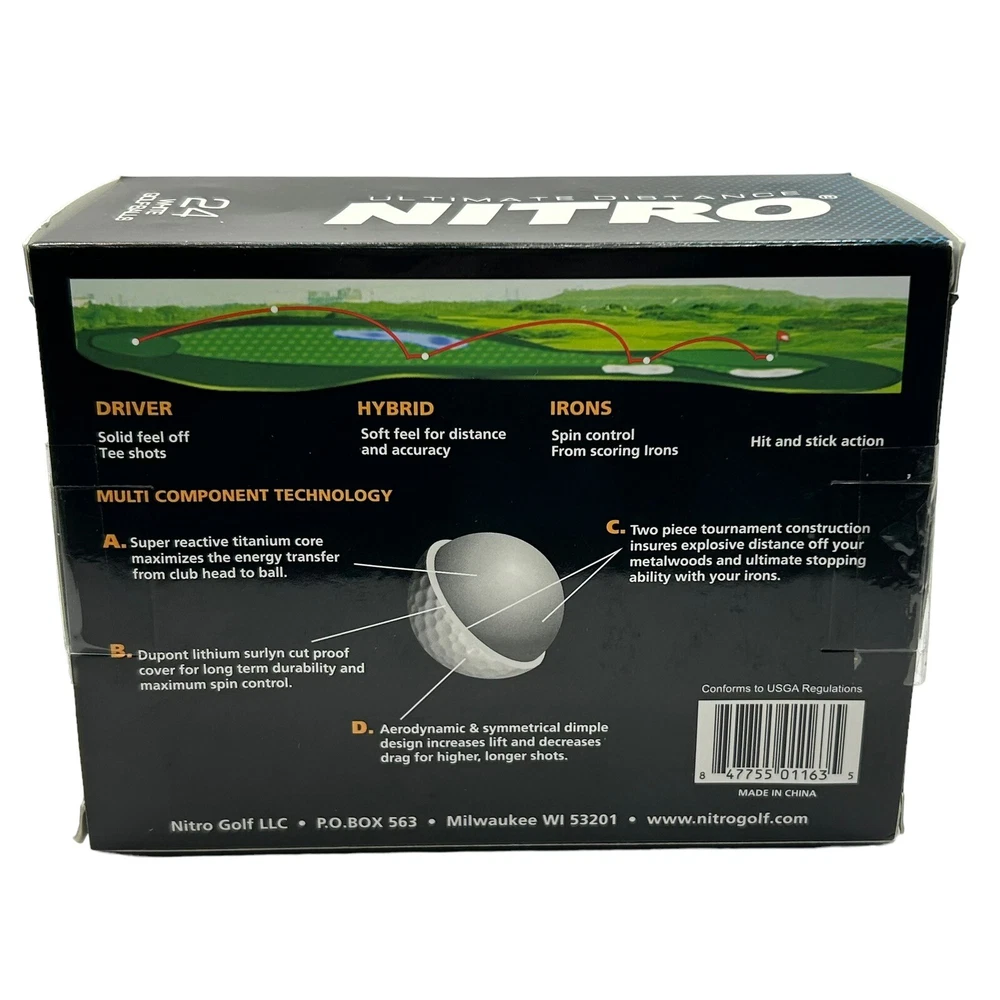 Features:DistanceBrand:NitroNumber of Items in Set:24Ball Type:Practice/Range Ballsgtin13:847755011635Sport/Activity:GolfPersonalize:NoCountry/Region of Manufacture:ChinaUPC:847755011635Color:WhiteVintage:NoModel:Nitro Ultimate DistanceBall Construction:2-piece
