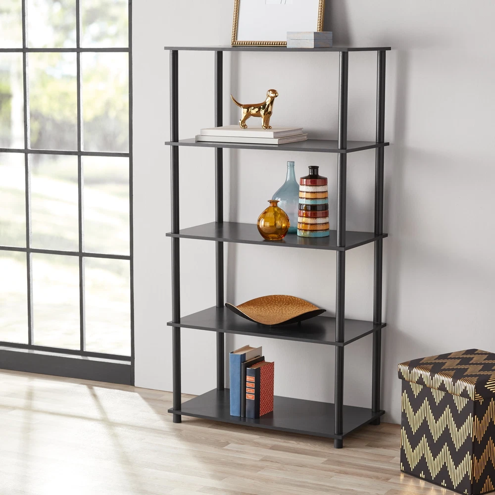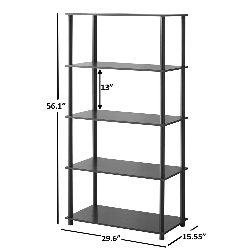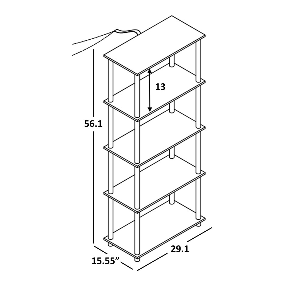 With thes 5-Shelf Storage Bookcase, getting organized in a stylish fashion is simple. This modern designed unit is available in a variety of finishes to match almost any taste. It can be assembled in minutes, no tools required, to create an attractive shelving system that provides storage your living room, family room, kitchen, closet or anywhere else. The sturdy storage unit has an open-back design and can support up to 22 pounds on the bottom shelf and 15 pounds on each additional shelf. Serving as a bookcase, plant stand, or for storing almost any item needed quickly and conveniently, it's perfect for displaying photography, artwork, collectibles, and more. The ools 5-Shelf Storage Bookcase stands over 56 inches tall and is perfect for large and medium rooms where smart, efficient storage is needed. The design provides over a foot of storage height between shelves that easily acbe bins and baskets (sold separately) to make the most out of all available storage space in most rooms. Tools 5-Shelf Storage Bookcase, Whtie Five shelves add functional storage to large and medium rooms Clean, sleek design works well with many room styles Each shelf can support up to 15 lbs storage bins (sold separately) White shelves with a white frame Easily assembled by one person in minutes, no tools required Includes wall attachment system for safety Ideal for storing books, Finishes a Materials: 60% particleboard, 40% plastic Package weight: 31.68 lbs Package dimensions: 40" x 6.5" x 18" all 1-800-729-1569.