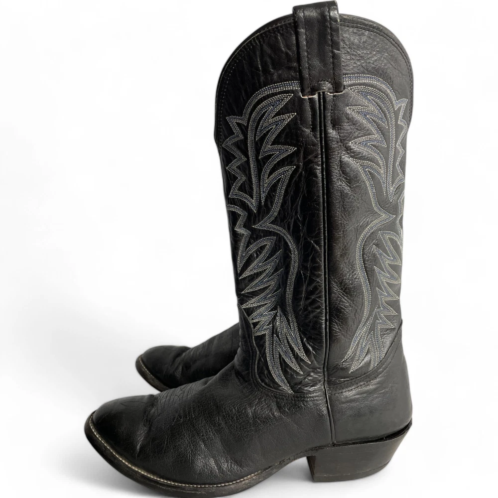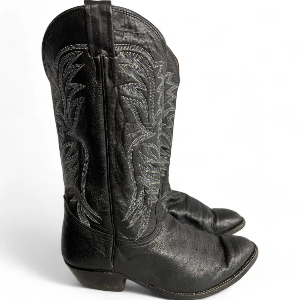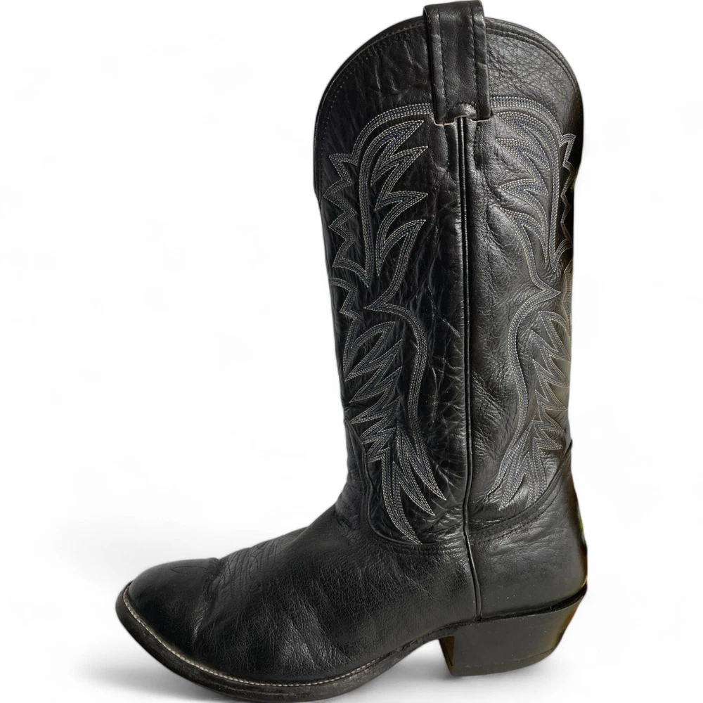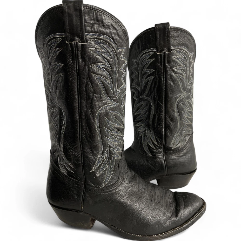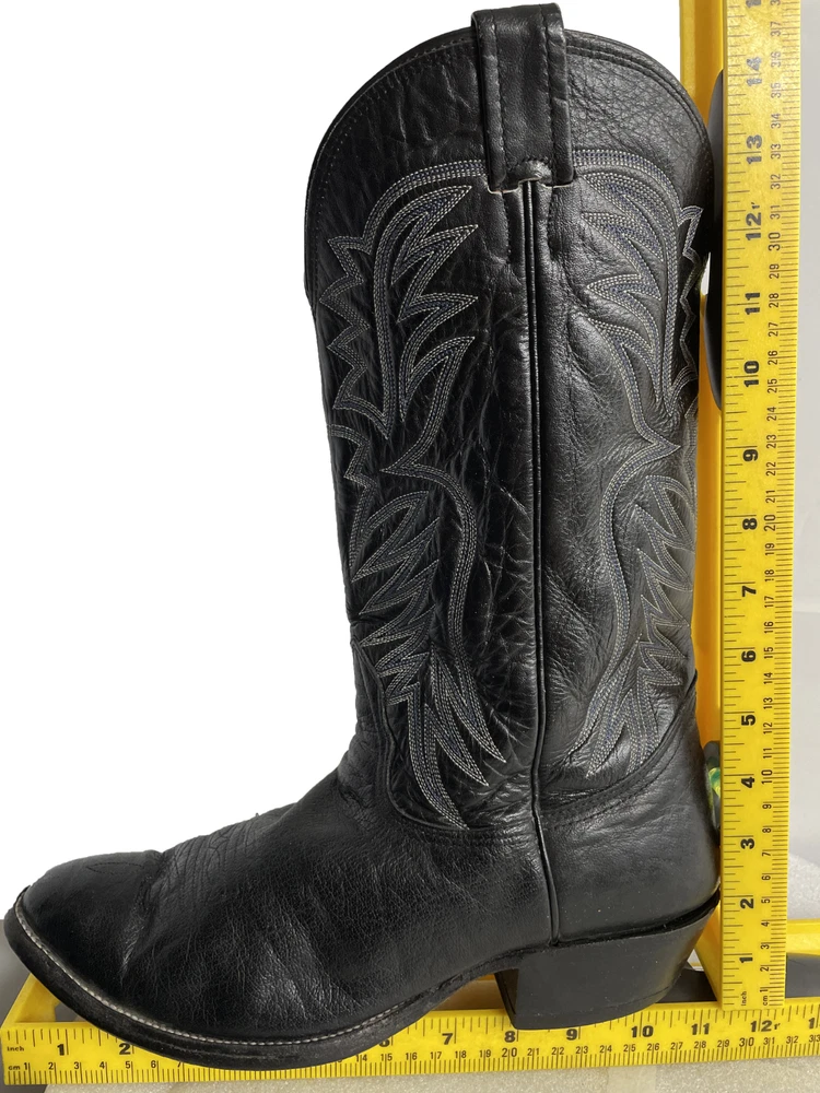Model: 3501 Brand: Nocona Shoe Width: EE Accents: Embroidered Features: Comfort Type: Boot US Shoe Size: 9.5 Pattern: Western Color: Black Department: Men Theme: Biker, Cowboy, Western Upper Material: Leather Style: Western Closure: Pull On Toe Shape: Almond Toe