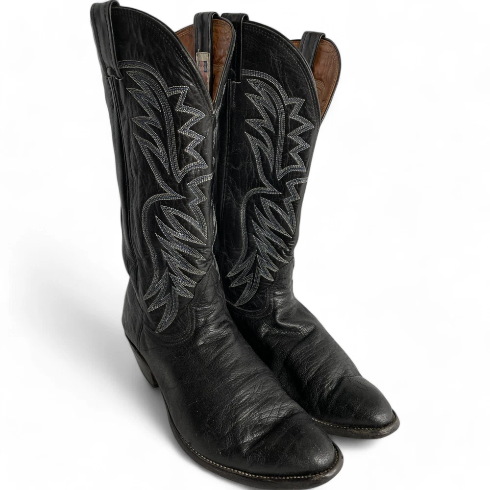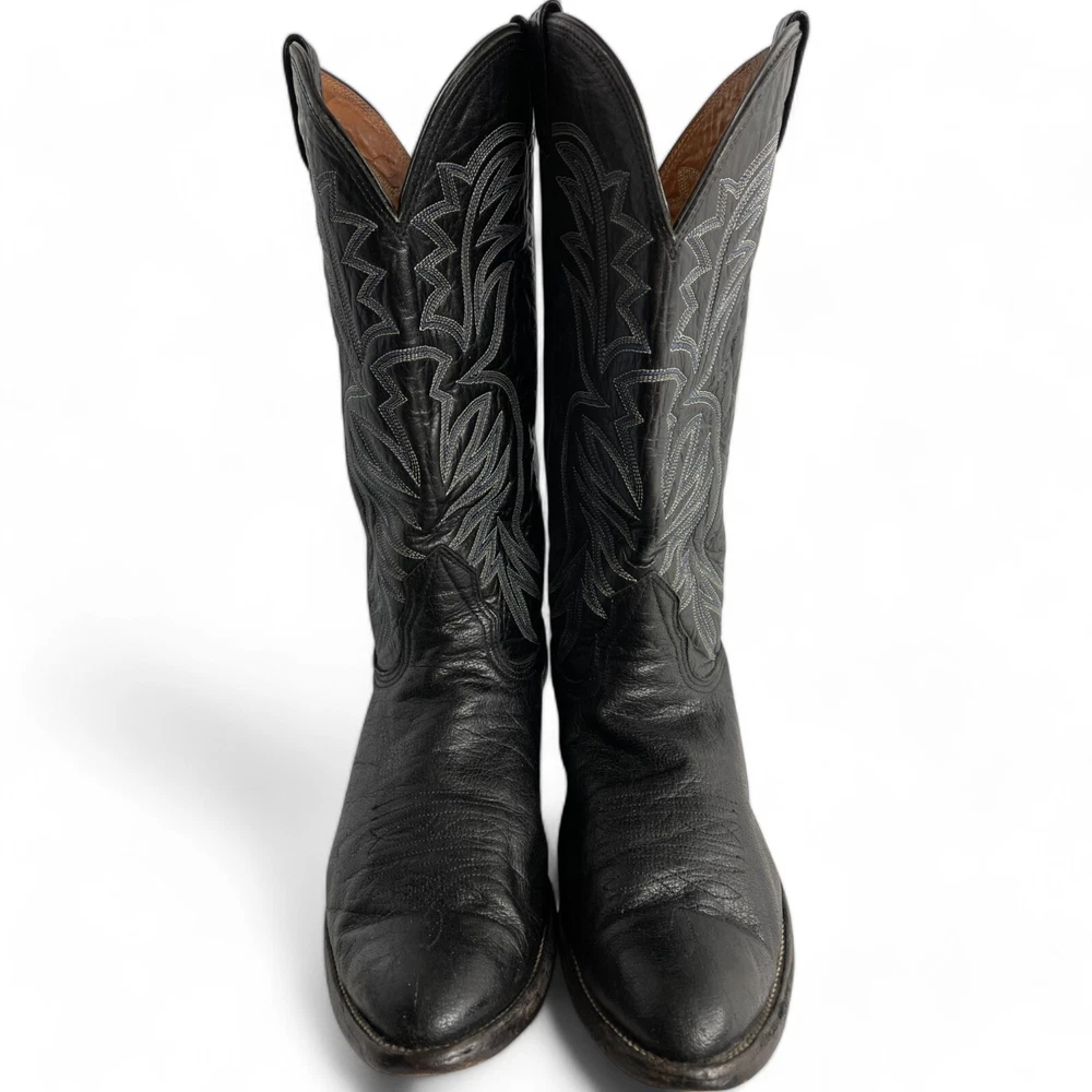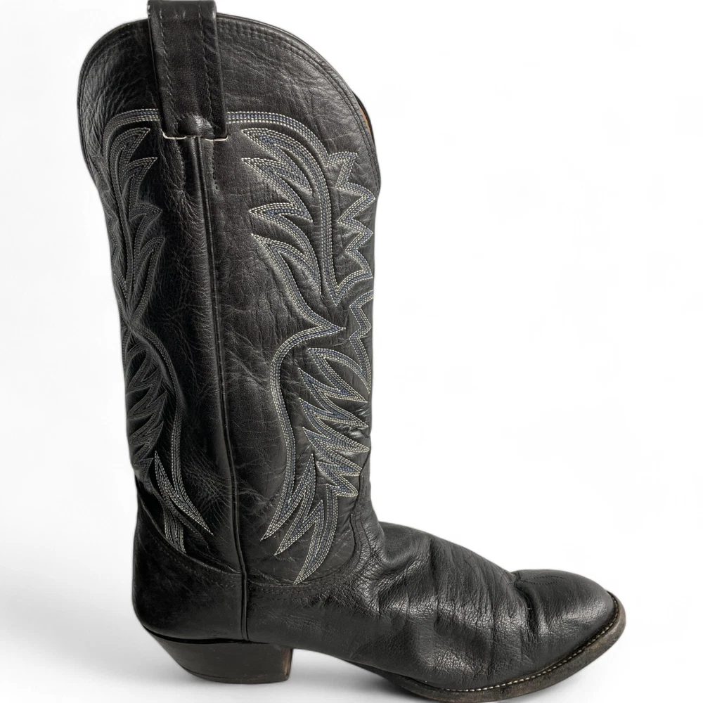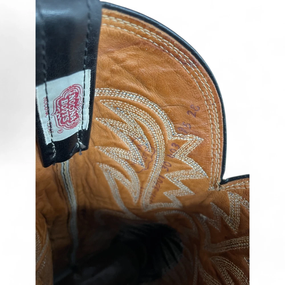 Model: 3501 Brand: Nocona Shoe Width: EE Accents: Embroidered Features: Comfort Type: Boot US Shoe Size: 9.5 Pattern: Western Color: Black Department: Men Theme: Biker, Cowboy, Western Upper Material: Leather Style: Western Closure: Pull On Toe Shape: Almond Toe