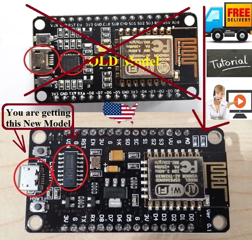 The Latest 4MB Flash size - NodeMCU LUA WiFi Internet of Things (IoT) Development Board Based on ESP8266 Overview The NodeMcu is an open-source firmware and development kit that helps you to prototype your IoT product within a few Lua script lines.The Development Kit based on ESP8266, integates GPIO, PWM, IIC, 1-Wire and ADC all in one board. Power your developement in the fastest way combinating with NodeMCU Firmware. Open-source, Interactive, Programmable, Low cost, Simple, Smart, Wi-Fi enabled. Code like arduino, but interactively in Lua script. Advanced API for hardware IO, which can dramatically reduce the redundant work for configuring and manipulating hardware. Description: Uses CH340G instead of CP2102. NodeMCU has built-in USB-TTL serial with super reliable industrial strength CH340G for superior stability on all supported platforms. Communication interface voltage: 3.3V. Antenna type: Built-in PCB antenna is available. Wireless 802.11 b/g/n standard WiFi at 2.4GHz, support WPA / WPA2 security mode Support STA/AP/STA + AP three operating modes Built-in TCP/IP protocol stack to support multiple TCP Client connections (5 MAX) D0 ~ D8, SD1 ~ SD3: used as GPIO, PWM, IIC, etc., port driver capability 15mA AD0: 1 channel ADC Power input: 4.5V ~ 9V (10VMAX), USB-powered Current: continuous transmission: ≈70mA (200mA MAX), Standby: <200uA Transfer rate: 110-460800bps Support UART / GPIO data communication interface Remote firmware upgrade (OTA) Support Smart Link Smart Networking Working temperature: -40 ℃ ~ + 125 ℃ Drive Type: Dual high-power H-bridge driver ESP8266 has IO Pin Don't need to download resetting A great set of tools to develop ESP8266 Flash size: 4MByte Data download https://www.youtube.com/watch?v=aolQxPTmpiY Applications: Home automation Sensor networks Package included: 1x NodeMcu Lua WiFi Internet of Things Development Board