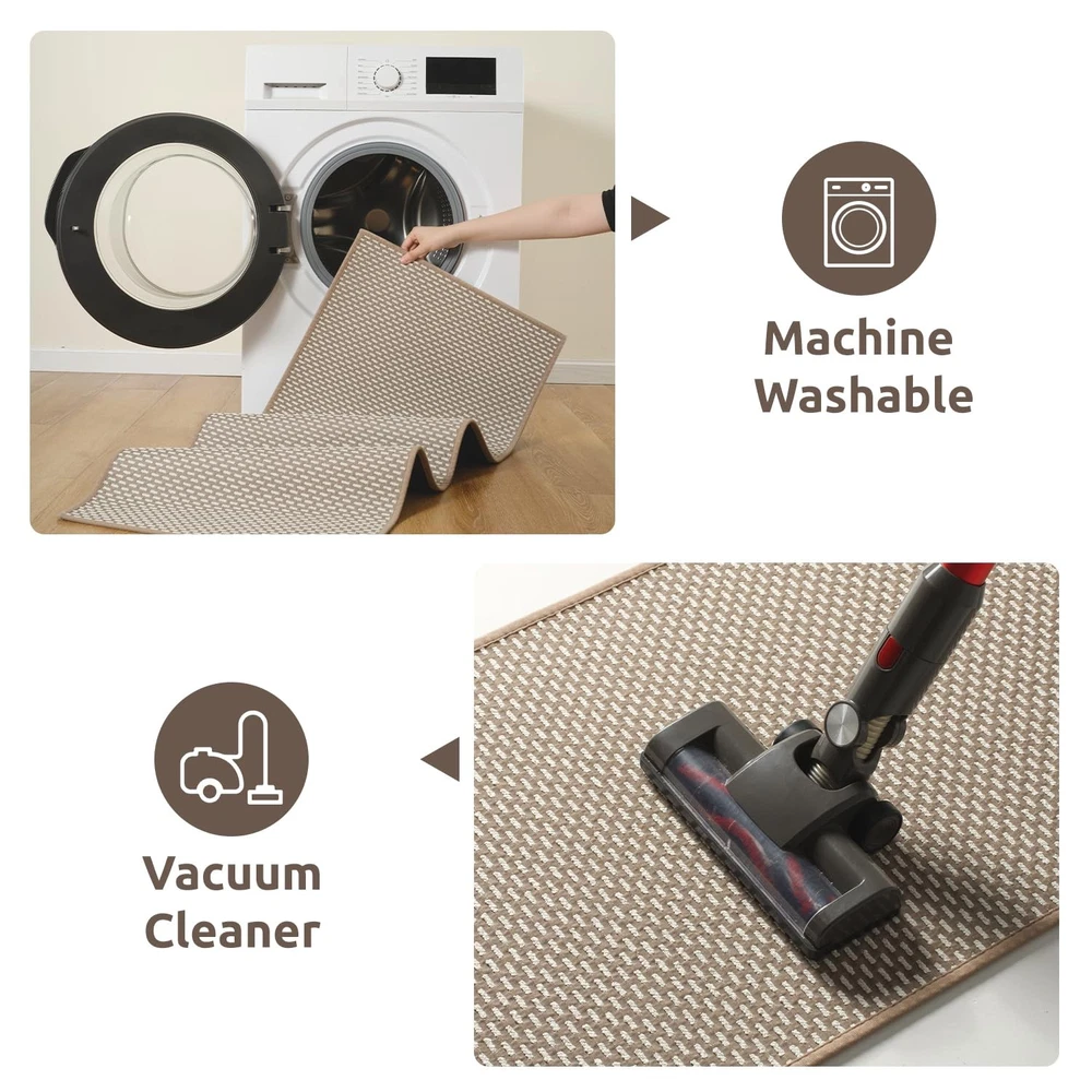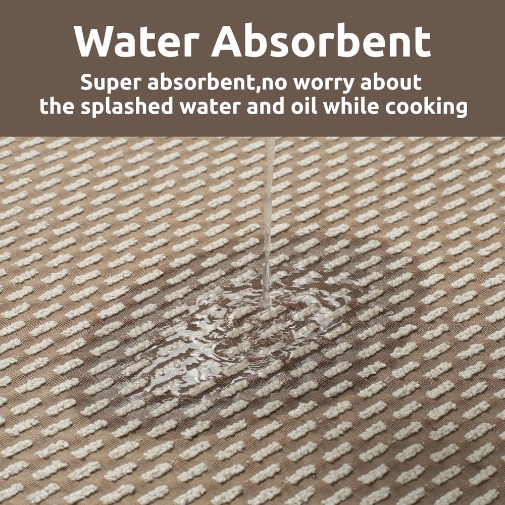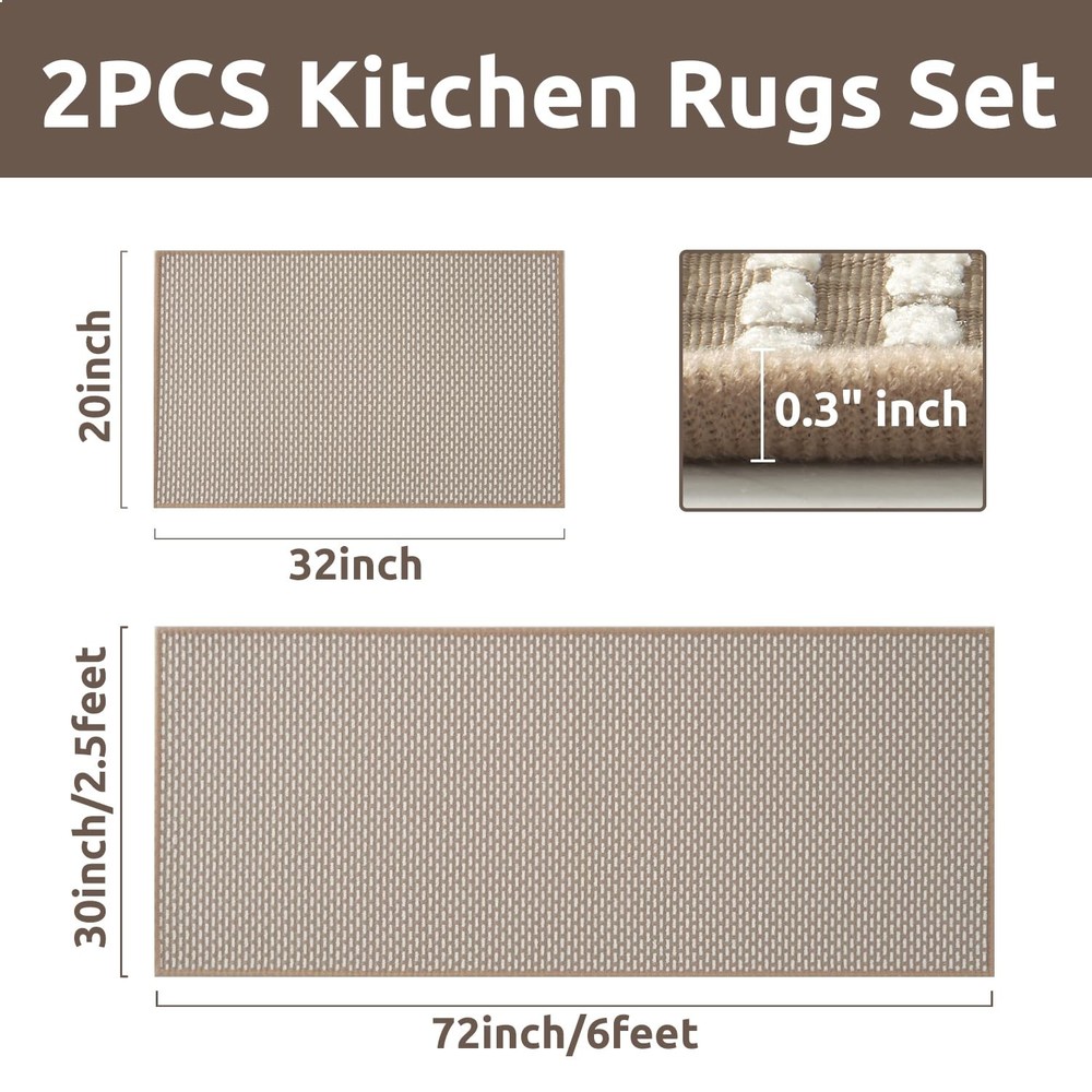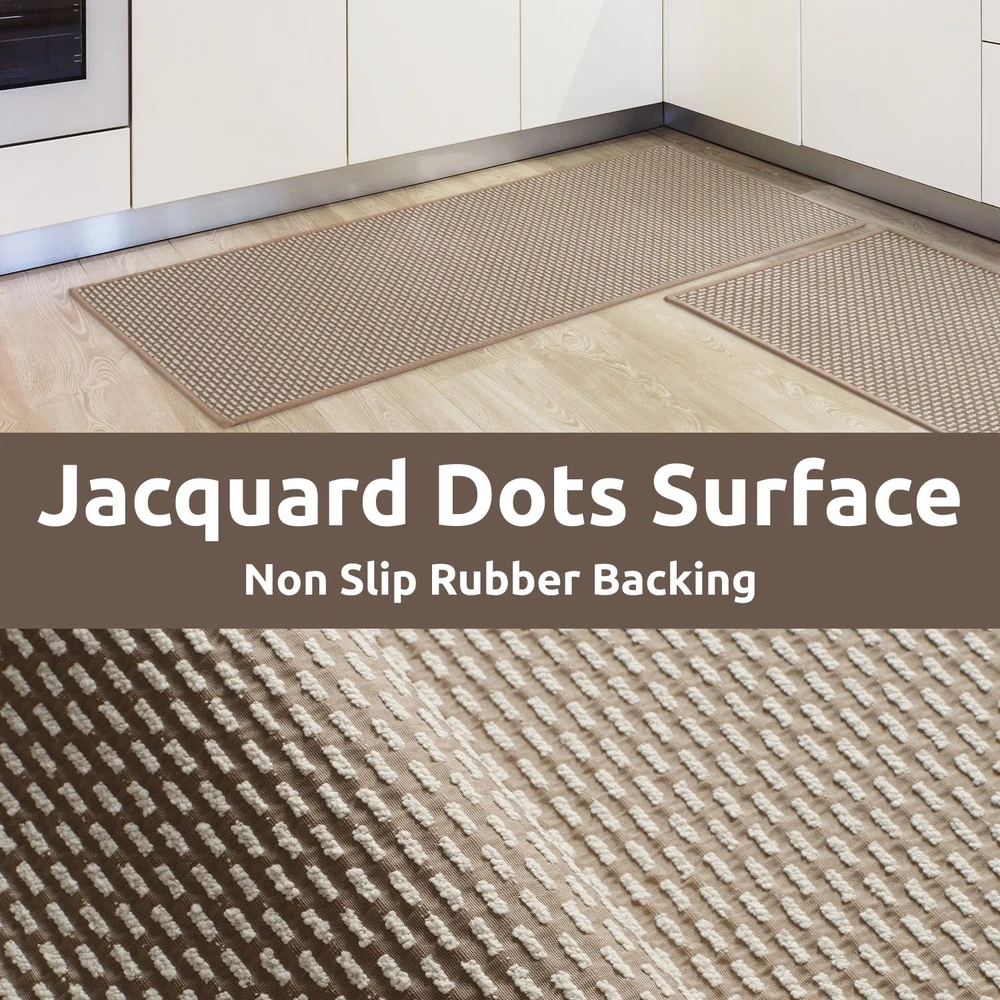 Non Slip Kitchen Rugs Sets of 2 - Extra Large 2.5'x6' + 20"x32" Kitchen Mats for Floor, Water Absorbent Kitchen Runner Machine Washable, No Pile Farmhouse Kitchen Carpet in Front of Sink Island Perfect Size: 2.5 feet x 6 feet extra wide and long kitchen runner rug is ideal for kitchen spaces, like those between a kitchen island and nearby counters. Extra large floor mats can cover a large area, providing protection for more floor space. 20x32 inch small kitchen mat is great option in front of sinks and stoves. 2 pieces kitchen rugs can also be used in hallways, laundry rooms, bedrooms, entryways, front doors, back doors and any high traffic indoor space. Unique and Stylish: Cute woven jaquard dots surface brings a warm, homey feel to cold tile or wood floors. Neutral colors are easy to match with kitchen decor and can add warmth, color and pattern to your floors. High quality soft material will protect your flooring from damage and add cushion yo your feet. Our kitchen rugs combine practicality and style, making them an excellent choice for maintaining a functional kitchen environment. Super Absorbent Surface: No-pile kitchen matts can easily fit under furniture and in tight spaces, making them suitable for various kitchen layouts. Water absorbing surface are made from durable materials which will effectively absorb spills and moisture, helping to keep the kitchen floor dry and safe. Nonskid surface can help prevent slips and falls and and create a comfortable surface to stand on while cooking or cleaning. Anti-Slip Safety: Non skid rubber-backed kitchen rugs provide excellent grip on tile, hardwood and laminate floors, reducing the risk of slips and falls. High-quality nonslip rubber backing resists wear and tear, prevents moisture from seeping through, and effectively protects the flooring underneath. If you have children, elderly or pets at home, please do not hesitate to choose this kitchen rug set which combines safety, comfort, and practicality. Machine Washable: No pile flat kitchen rug is less likely to trap dirt and stains. It is easy to clean and maintain. Shake the rug outside or use a vacuum cleaner to remove dust and crumbs for daily clean. Place it in the washing machine on a gentle cycle with cold water for deep clean (no bleach, dry on low heat or lay flat to dry in the shade). kitchen standing mats will save your time and make your life easier.