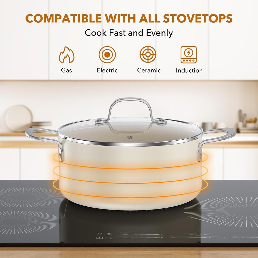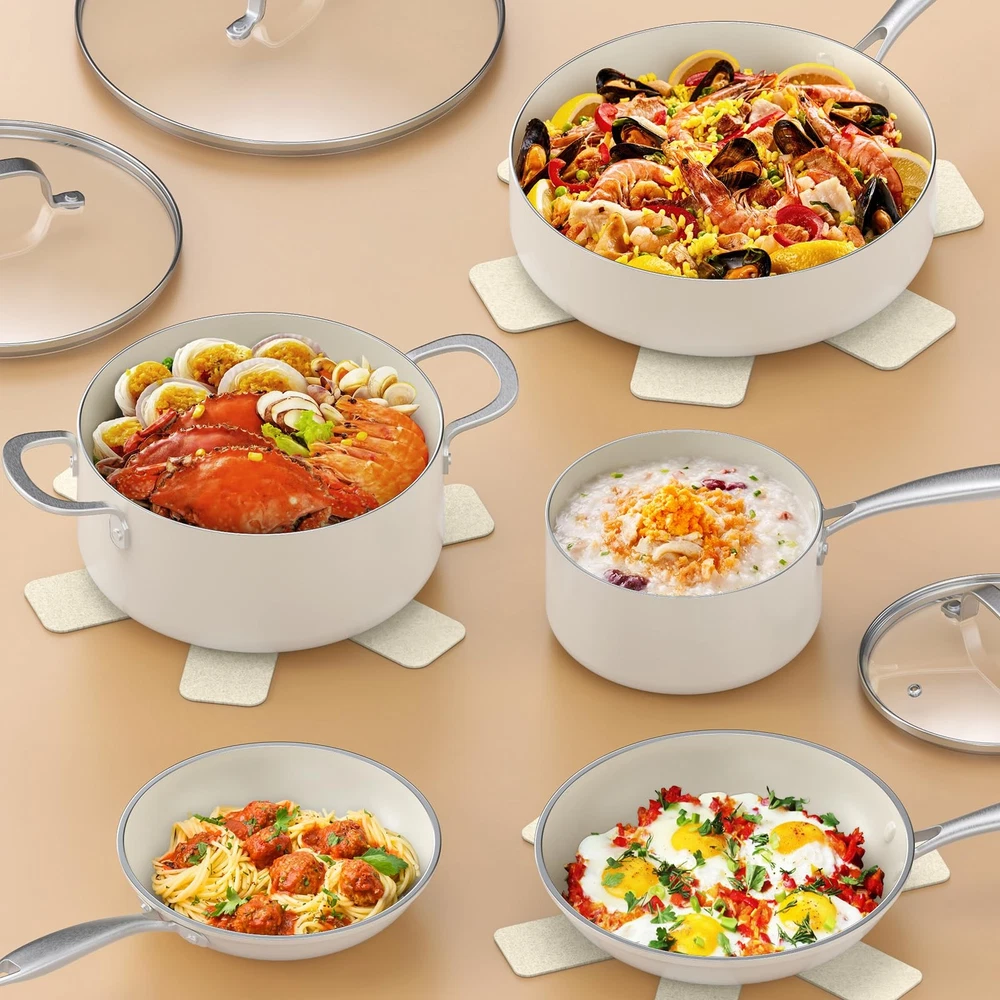 11-Piece Pots and Pans Set Healthy Nonstick Ceramic: This cookware set delivers 5X superior nonstick performance and is made from 100% Free PTFE, PFOA, PFAS, Cadmium, Lead materials for safe, long-lasting use. 30% Thicker & Built to Last: The pot body is 30% thicker, featuring a reinforced durable structure that resists breaking and wear, ensuring long-term reliability. 11-Piece Cookware Set Includes: 8.5-inch Frying Pan, 10-inch Frying Pan, 1.5QT Saucepan with Lid, 4QT Sauté Pan with Lid, 4.3QT Casserole Pot with Lid, and 3 pot protectors. Oven Safe: Seamlessly transition from stovetop to oven for versatile cooking. The durable nonstick coating and stainless steel handles withstand oven temperatures up to 500°F. Easy to Clean: The nonstick surface ensures quick cleanup—just wipe with a paper towel or rinse with water. Durable, stain-resistant, and dishwasher safe. Perfect for Induction & All Stovetops: The high-magnetic stainless steel base ensures fast, even heating on induction, gas, electric, and ceramic cooktops. Worry-Free Guarantee: We stand behind the quality of our pots and pans set. If you have any questions or concerns, simply contact our customer service team for a hassle-free solution—your satisfaction is our priority.