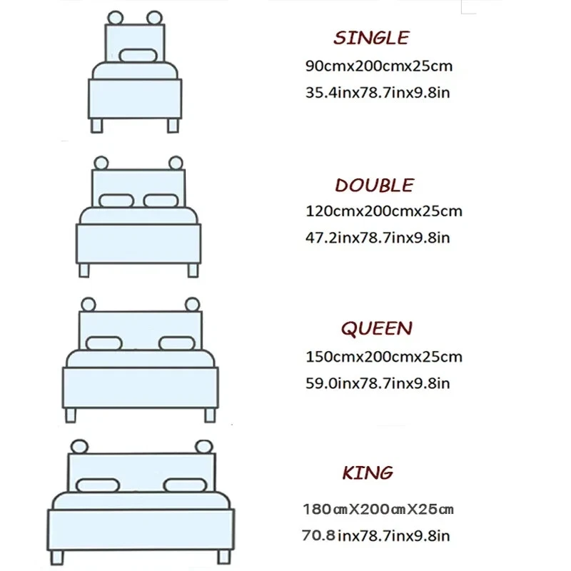product material: material: 100% cotton Material characteristics: soft, non-fading, quick-drying, dust-proof and anti-mite Product advantages: · 360° Protection - Can effectively protect your mattress from dust and stains. · EASY INSTALLATION - Sheets can be changed quickly and stay flat. · SUPER SOFT - Feel luxurious with this cozy microfiber bed set. · Moisture resistant, designed to keep you warm in winter and act as a cool sheet in summer. · Fade Resistant - Color won't fade after multiple washes. · Easy to clean - hand and machine washable, colorfast, quick drying Scope of application: Spring Mattress, Latex Mattress, Palm Mattress (mattress thickness not to exceed 10 inches)