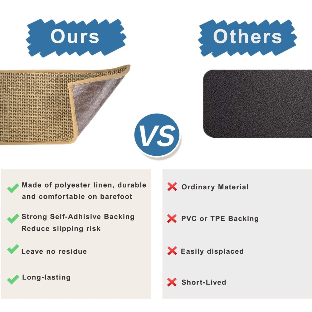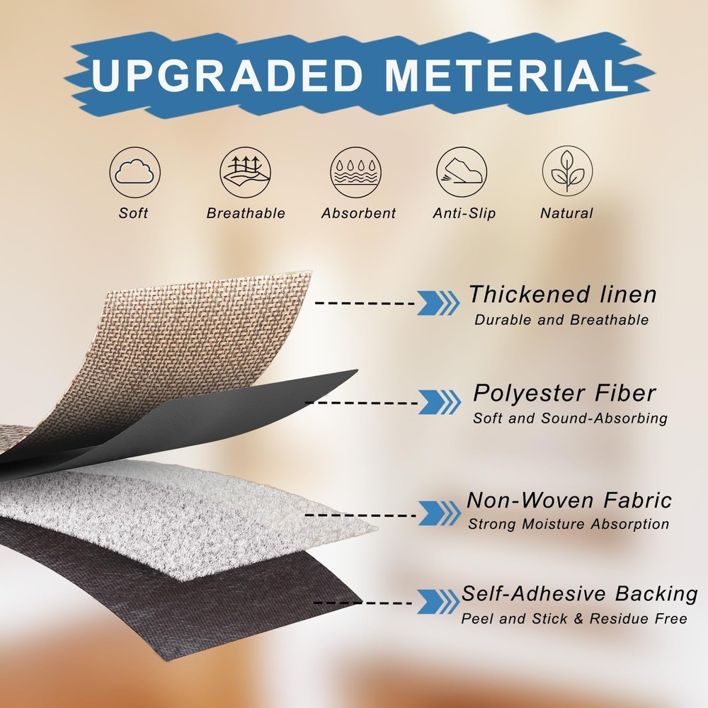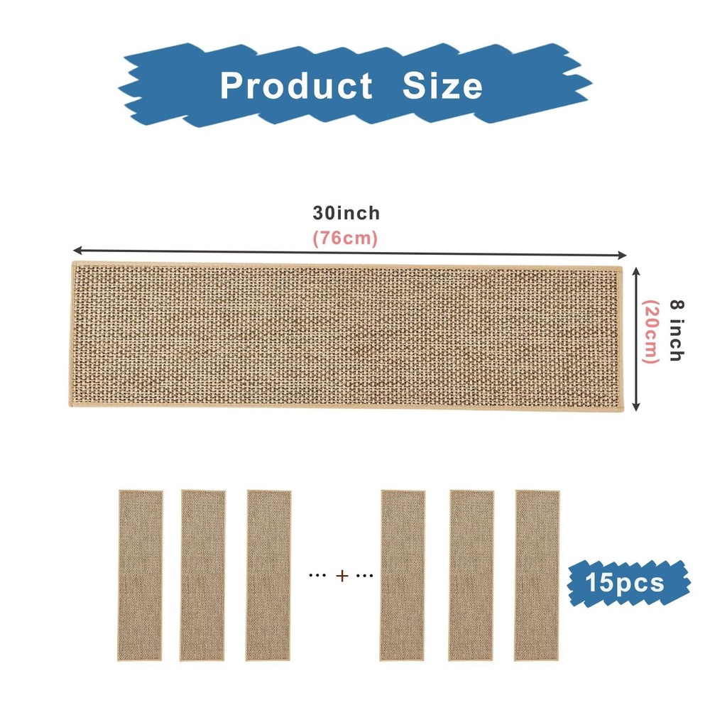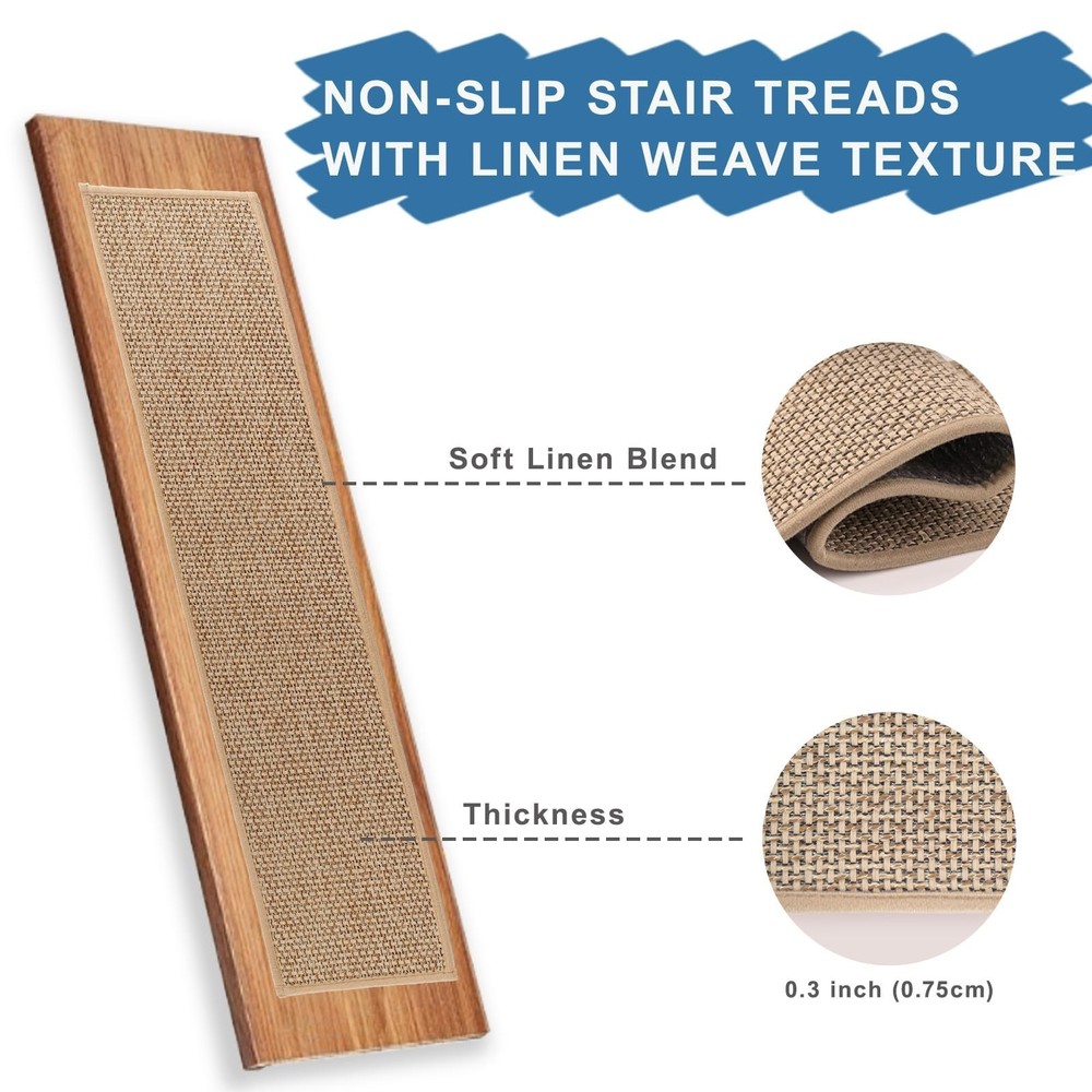 Stair Treads Non Slip for Wooden Steps, Carpet Stair Treads 15 Pack 8'' x 30'', Stair Runner Indoor, Machine Washable for Kids, Elders, and Dogs, Beige Product Details Size: 30"L x 8"W Color: Beige Number of Items: 15 Brand: Zreolity MPN: Stair Treads Non Slip-beige UPC: Does not apply EAN: Does not apply Material: Polyester, Natural Linen Brand: Zreolity Item dimensions L x W x H: 30 x 8 x 0.3 inches Color: Beige Shape: Rectangular Product Dimensions : 30 x 8 x 0.3 inches; 6.48 Pounds Item model number : Stair Treads Non Slip-beige Date First Available : November 26, 2024 Manufacturer : Zreolity Country of Origin : China Best Sellers Rank: #362,191 in Tools & Home Improvement (See Top 100 in Tools & Home Improvement) #589 in Staircase Step Treads #589 in Staircase Step Treads Customer Reviews: 4.4 4.4 out of 5 stars 10 ratings These non slip stair treads indoor are designed with premium grip backing to prevent shifting or slipping on wood, marble, or tile surfaces. They work as reliable anti slip mats, making your home safer and friendly for kids, pets, and elderly family members. Easy Installation: Featuring strong adhesion, our self-adhesive stair treads are easy to installjust clean, peel, and stick, with no tools required. These stair treads for wooden steps indoor are also easy to remove or reposition without leaving residue. Easy to Clean and Long-Lasting: Made of durable polyester, these carpet for stairs are both vacuum-friendly and machine washable. Ideal for long-term use, our stair covers for wood stairs maintain a clean and fresh appearance with minimal effort. Noise-Reducing and Comfortable: Enjoy a quieter home with our soft, cushioned carpet stair treads for wooden steps that help reduce noise and absorb impact. These comfortable stair carpet runner mats are perfect for busy, multi-level households Versatile Decor: Removable stair runners for wooden steps set of 15, Measuring 8" x 30", they fit most indoor stairs. These non-slip stair treads combine style and practicality, they effortlessly complement any decor, adding both safety and elegance to your home