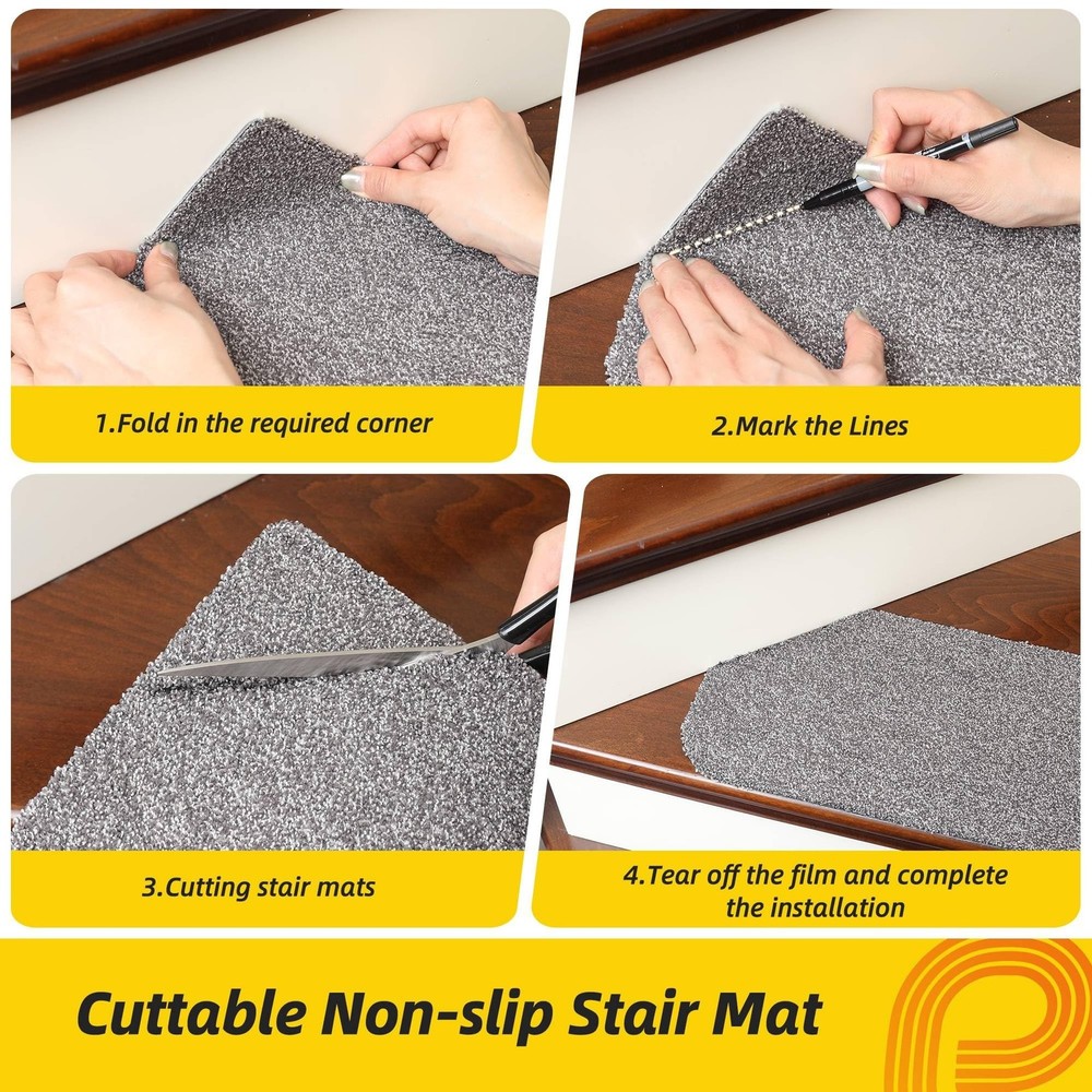 Non-Slip Stair Treads for Wooden Steps Indoor, 15 Pack 9" X 28" Stair Carpet Mats with TPE Backing for Kids Elders and Dogs, 0.3" Thick 100% Polyester Soft Stair Runner Rug, Light Grey Product Details Size: 28''x9'' Color: Light Grey Number of Items: 15 Brand: JSEI MPN: HLE-7779 UPC: Does not apply EAN: Does not apply Material: Polyester Brand: JSEI Item dimensions L x W x H: 28 x 9 x 0.3 inches Color: Light Grey Shape: Rectangular Item Thickness: 0.3 Inches Item Weight: 7 Pounds Number of Items: 15 Product Dimensions: 28 x 9 x 0.3 inches Item Weight: 7.03 pounds Manufacturer: JSEI Country of Origin: China Date First Available: January 21, 2025 Anti-slip Strips Enhance Safety: These multi-purpose stair rugs feature a TPE anti-slip backing and built-in anti-slip strips to provide superior grip on dry floors, preventing slipping and protecting the surface from wear and tear. Our premium wooden stair mats help your kids and dogs go up and down the stairs easily without worrying about slipping. Freely Cut to Fit: These non-slip stair tread carpets for wooden stairs can easily cut these stair treads to the size you want to match your corners or special step lengths. Our stair carpets are made with high-stability crease technology, so you don't have to worry about delamination.They stay firmly in place, even when wet. Genuine Material, Superior Quality: The surface of this non-slip stair tread mat is made of 100% polyester material, which is soft and wear-resistant. It is durable and not easy to pull and pile up. The appropriate thickness not only ensures that you can step on our stair tread carpet comfortably, but also helps keep your feet away from the cold stairs. Reduce the noise of going up and down the stairs, giving your family a quiet and relaxing environment. Easy to Remove and Clean: If you need to reposition or remove the stair treads, it will not leave any residue, protecting your original stairs from damage. When the stair carpet gets dirty, just vacuum the hair and stains. Or throw the stair carpet treads into the washing machine. After washing in water, it is recommended to dry in the shade, not in the dryer or in the sun. Works on Any Stairway: Our stair treads for wooden steps measure 9"x28", the stair mat adopts a clean solid color design suitable for any indoor stairs that are made of wood, laminate, marble, tiles, glass, etc.