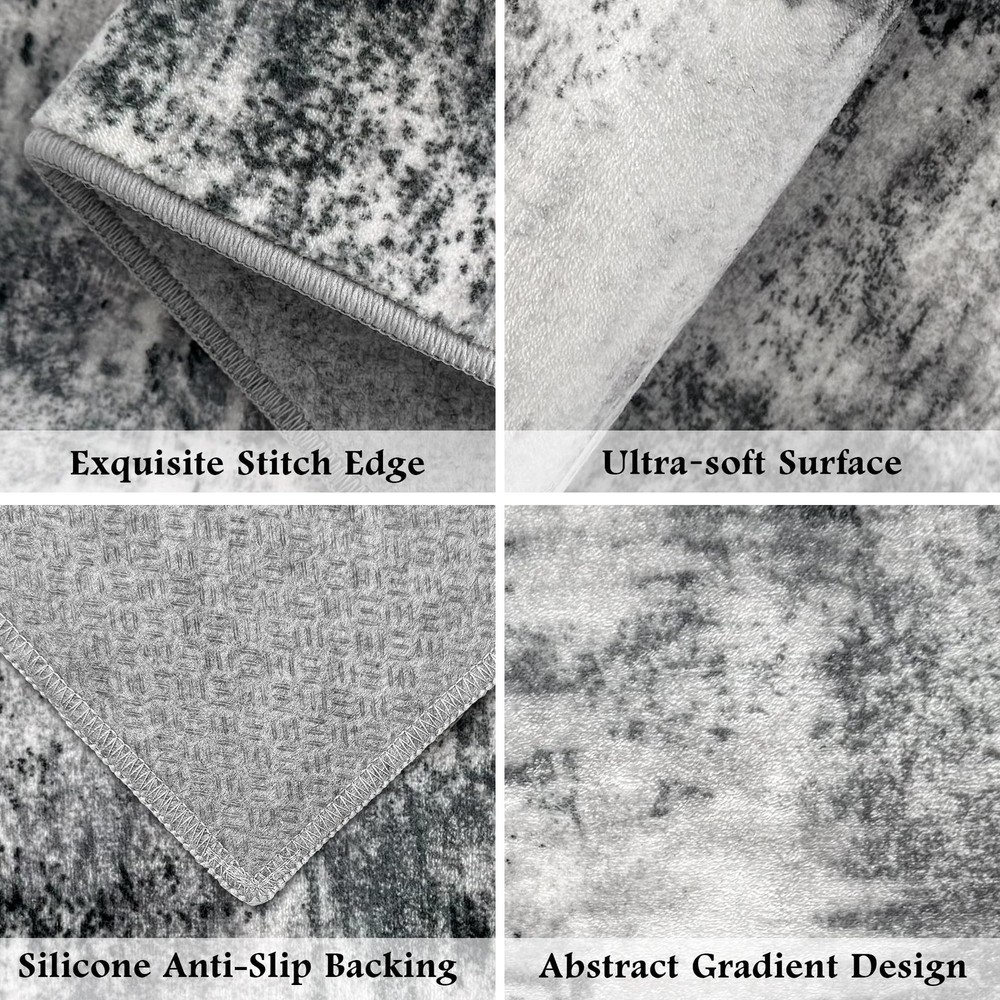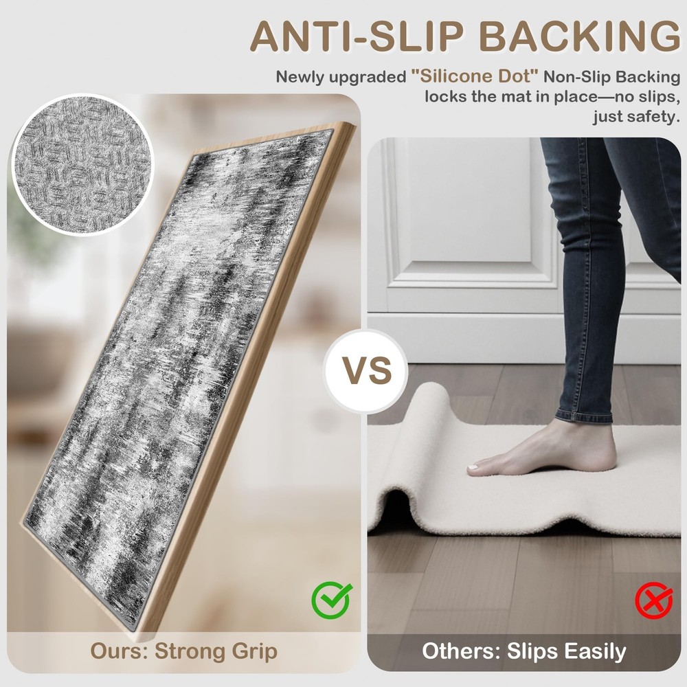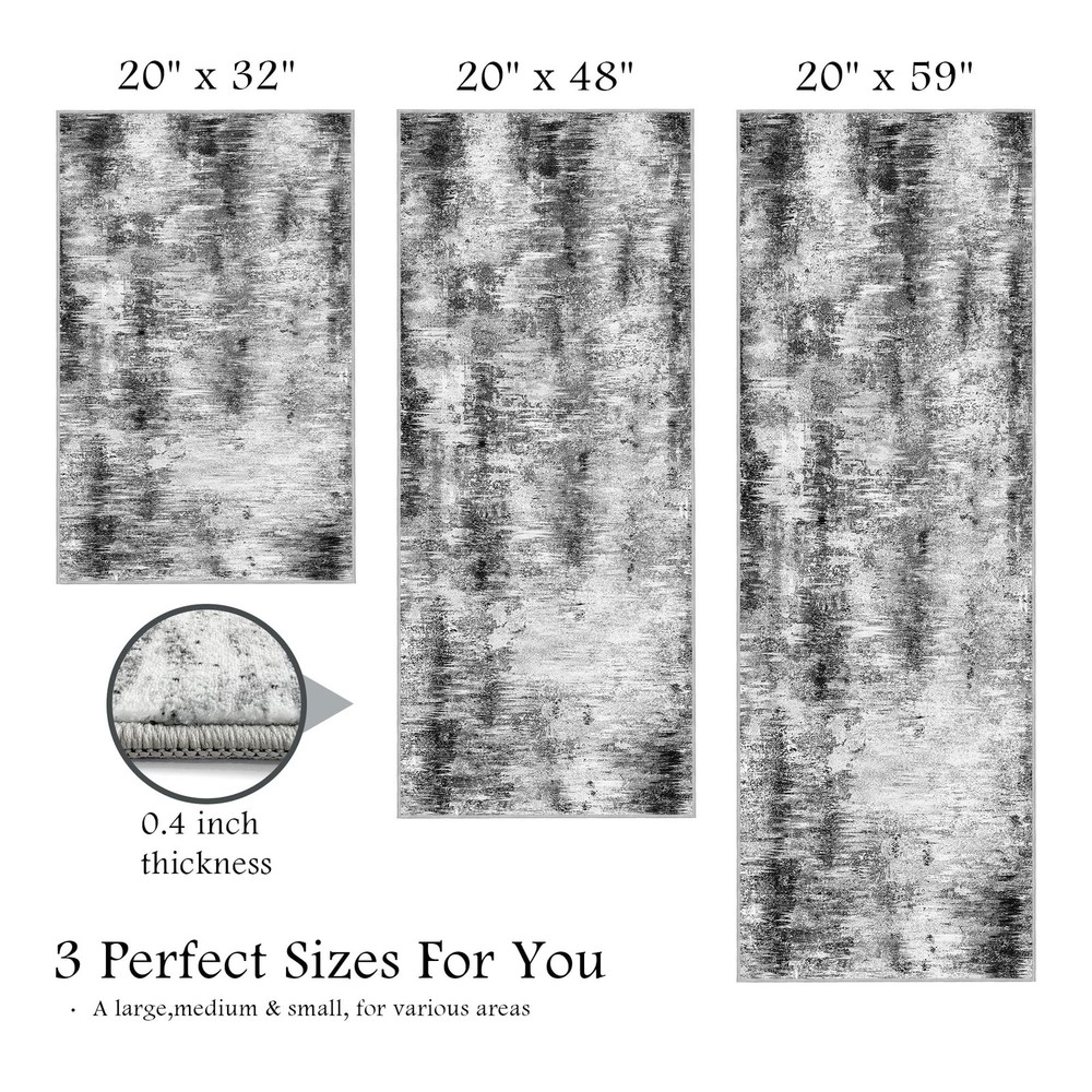 Kitchen Rugs Sets of 3 【100% Non-Slip Silicone Backing】: These 100% anti-slip kitchen runner rugs feature a premium Silicone Dot backing, ensuring stability on tile, hardwood, and laminate floors. Even after repeated washing, the silicone dots maintain strong grip, keeping the rug firmly in place whether in wet, greasy, or high-traffic areas like the kitchen sink, stove, or laundry. Ideal for homes with kids, pets, or elderly family members. 【Abstract 3-Piece Kitchen Rug Set】: Enhance your space with this modern kitchen rugs set featuring an artistic abstract design. The set includes three sizes (20"x32", 20"x48", 20"x59") to fit various areas like kitchen islands, stoves countertops, and entryways. Combining style and comfort, these kitchen mats bring a sleek, contemporary touch to your home. 【Soft, Low-Pile & Durable】: Crafted from soft yet durable materials, these kitchen mat set provide comfort underfoot while withstanding daily wear. The 0.4" low-pile design ensures a sleek look, allows doors to open smoothly, and helps prevent tripping hazards. Designed for high-traffic areas, these rugs for kitchen floor maintain their shape and color even after frequent use. 【Easy to Maintain】: Enjoy effortless cleaning with this machine washable kitchen rugs. Simply toss them in the washing machine, vacuum, or wipe clean to remove stains and spills. The fade-resistant fabric keeps them looking fresh, making these kitchen mats perfect for busy households. (Note: Slight creases may appear upon arrival. Roll in the opposite direction and let it sit for a day to flatten.) 【Versatile for Multiple Uses】: Beyond the kitchen, this 3-piece rug set is ideal for laundry rooms, entryways, bathrooms, and bedrooms. Whether used as a kitchen runner, indoor doormat, or bathroom rug, these stylish and functional mats provide comfort and floor protection throughout your home. An excellent gift for housewarmings, holidays, or special occasions.